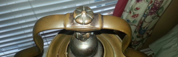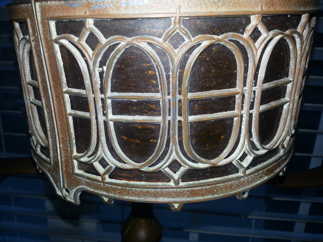 Purchased at a Thrift store. The only history that I have is the thrift store stating it was an item donated from an estate sale. It caught my eye due to it's unusual appearance and antique qualities. I assumed I may have quite a find when three different people approached me while pushing it in my buggy and asked to purchase it from me. It took three hours online research to find the Harp style. The actual Floor lamp looks identical to Handel Harp floor lamps made in the early 1900's. The felt on bottom side of base has deteriorated and there is not a cloth tag stating Handel or inscribed in the metal, does this mean it is not authentic? Also, the lampshade is quite a dilemna, I can not find one like it whatsoever. The lantern style shade has three yellow amber crackled thick glass panels. One of the glass panels is missing. Is their anyone out there that has enough wisdom on lamp history to enlighten me on this beautiful unusal floor lamp? I would love to find out the history, authenticity, and possible value of the lamp. Thank you in advance for your expertise!!