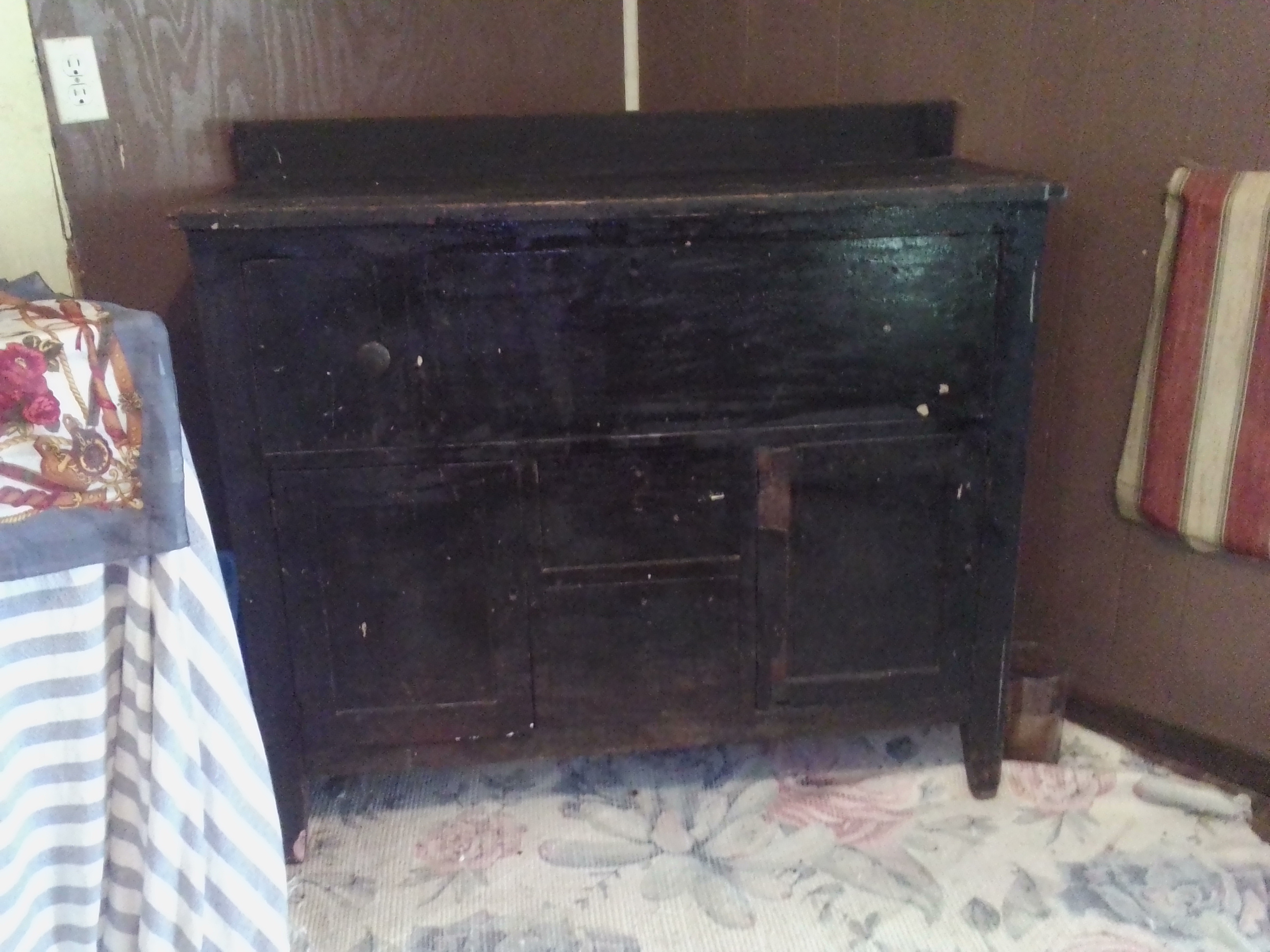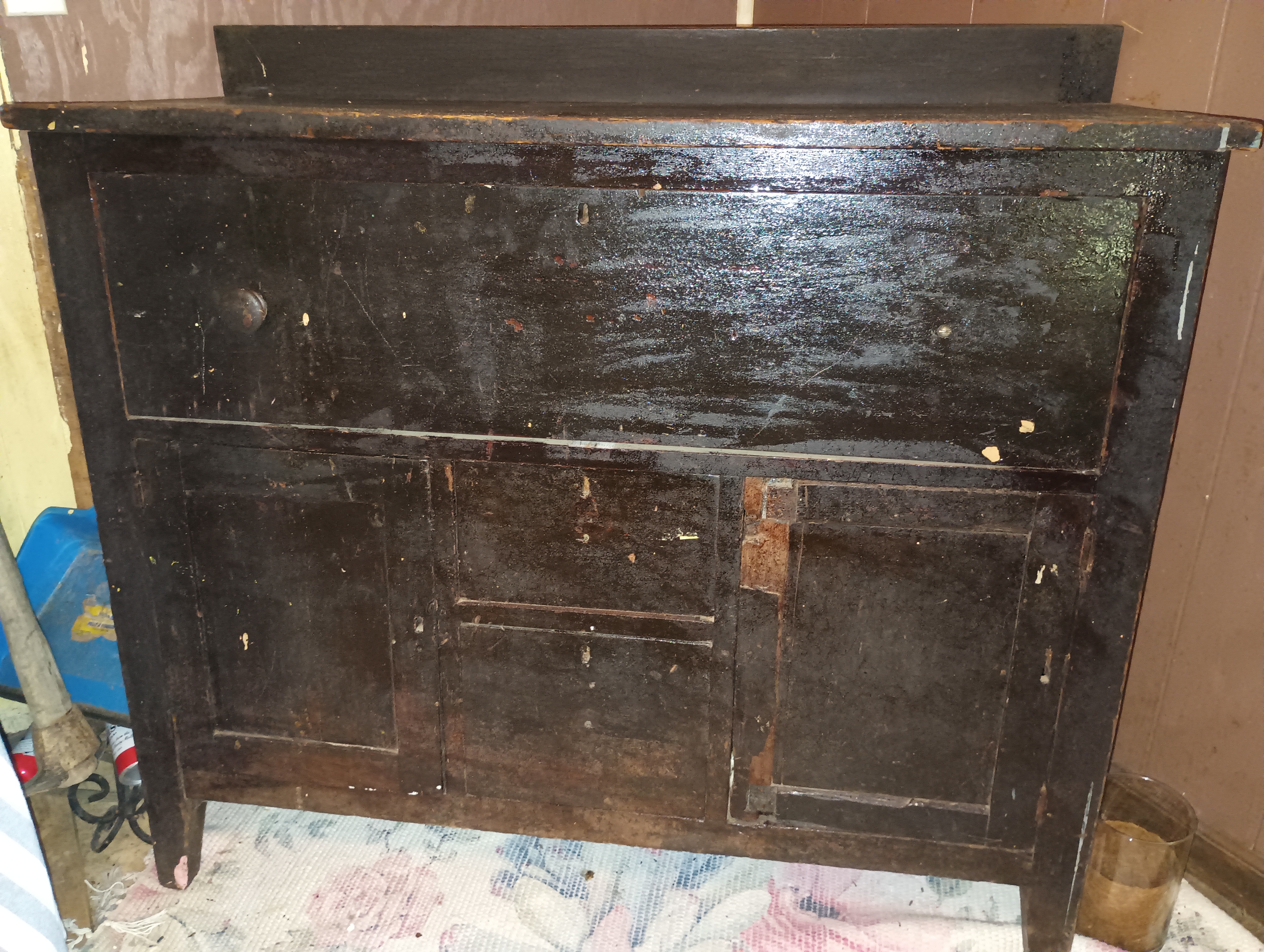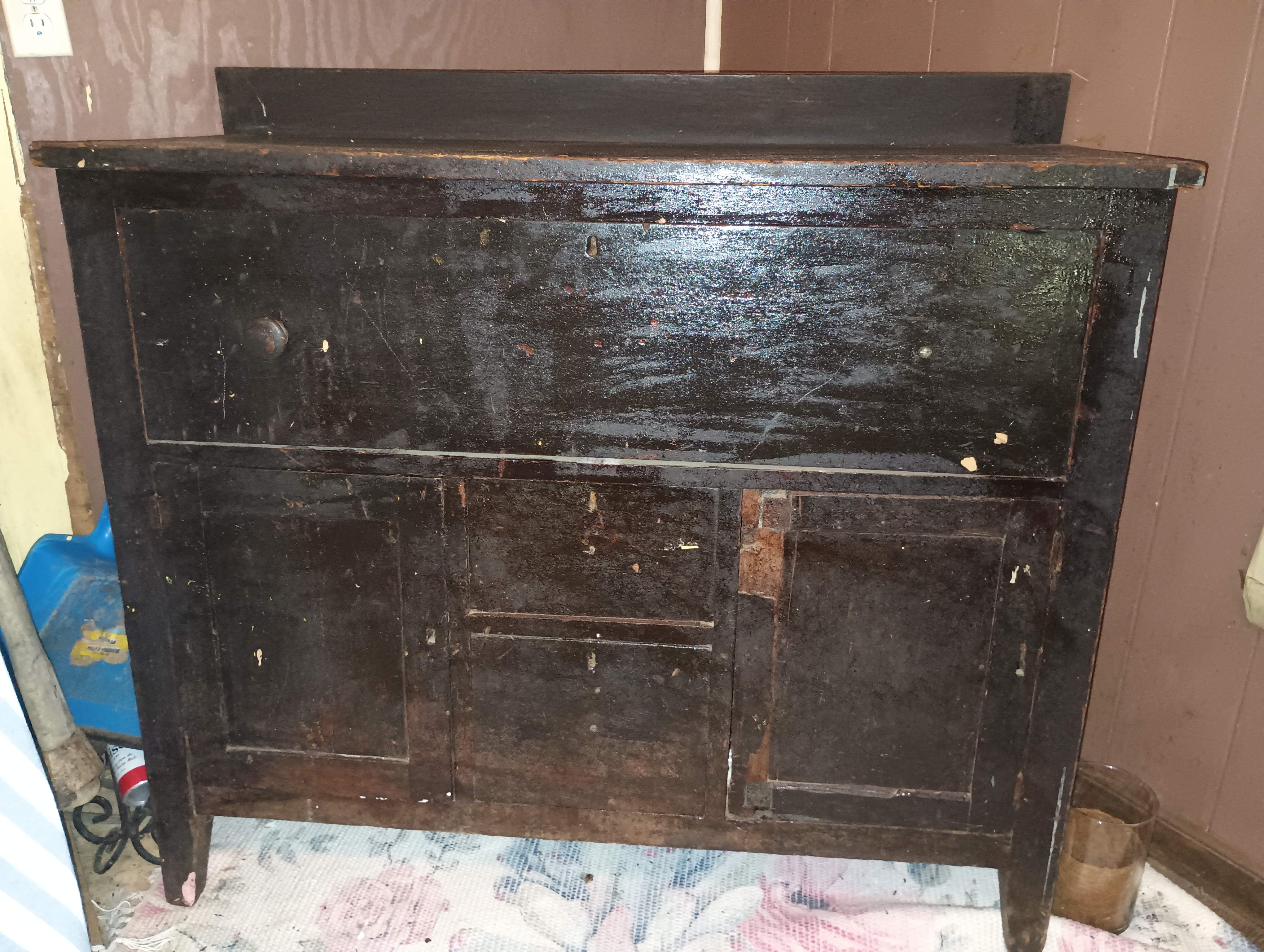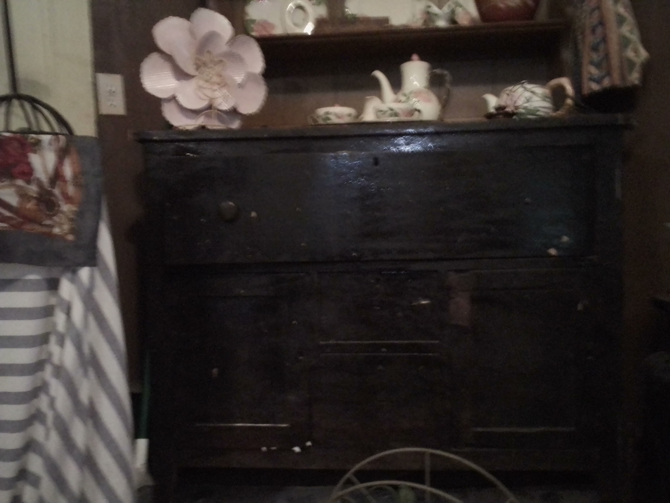 Antique Handmade Hutch put together with dovetails. Between years 1650-1880. Dark brown in color.