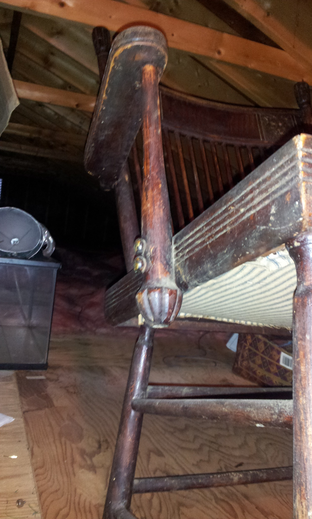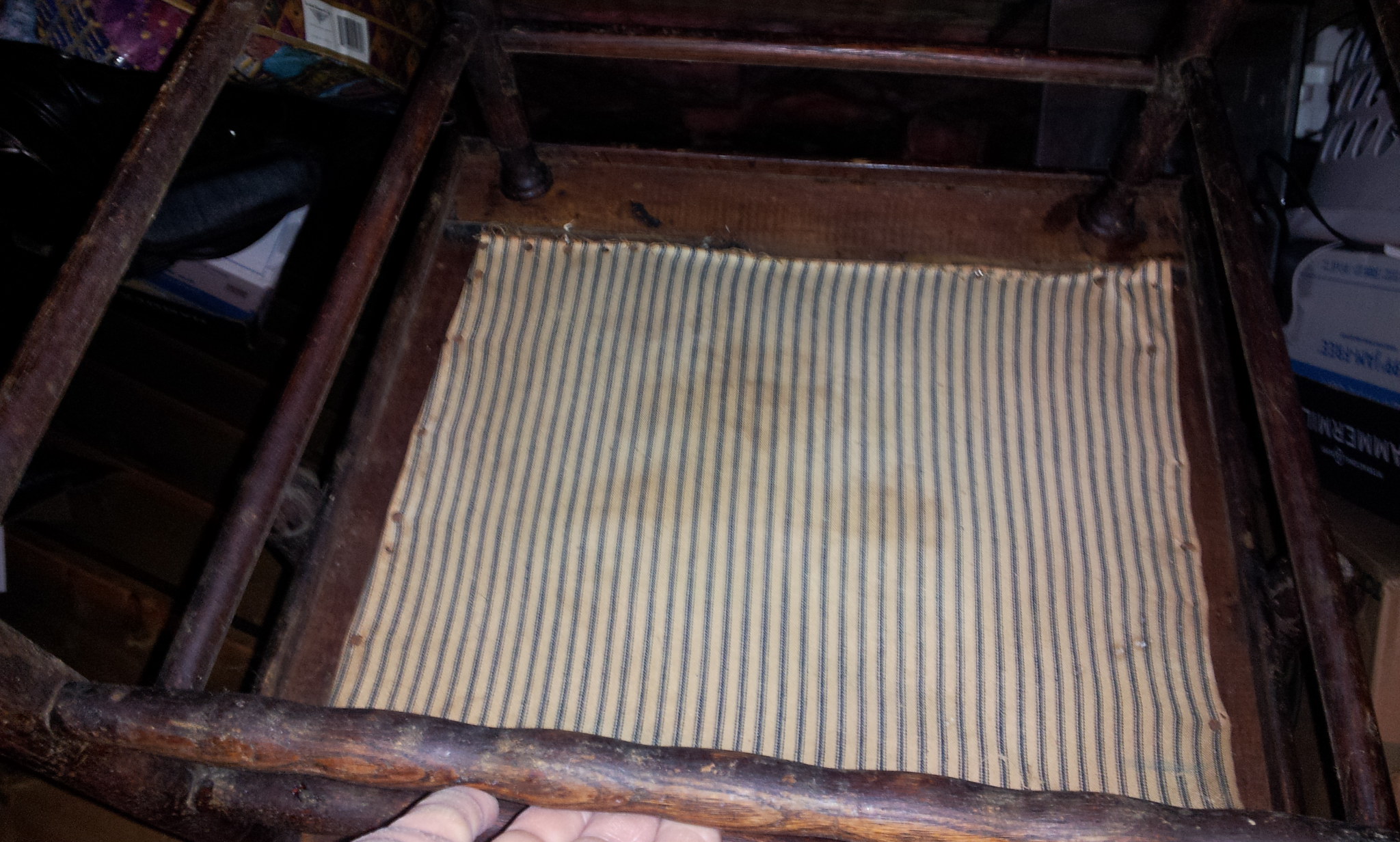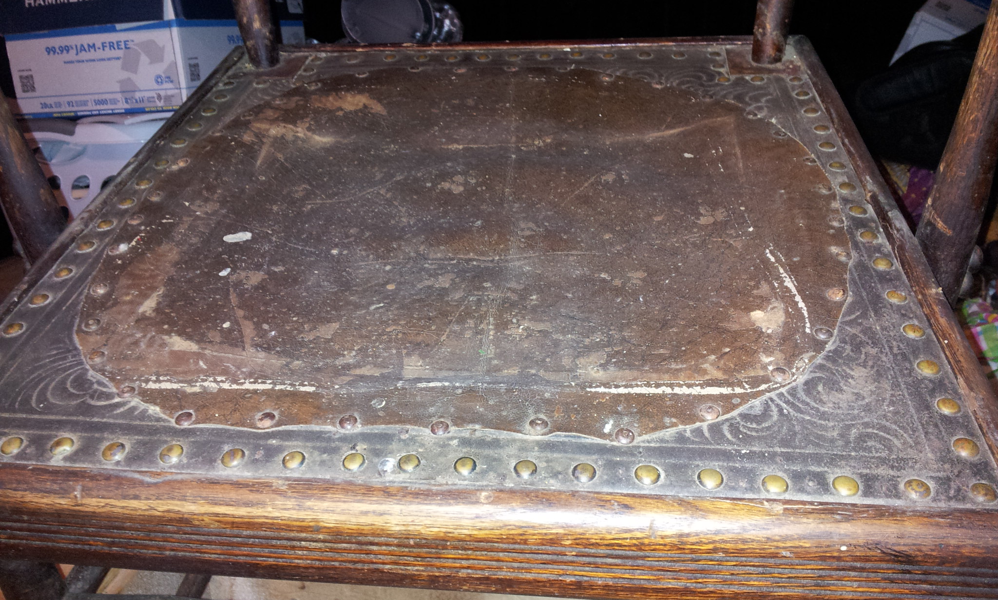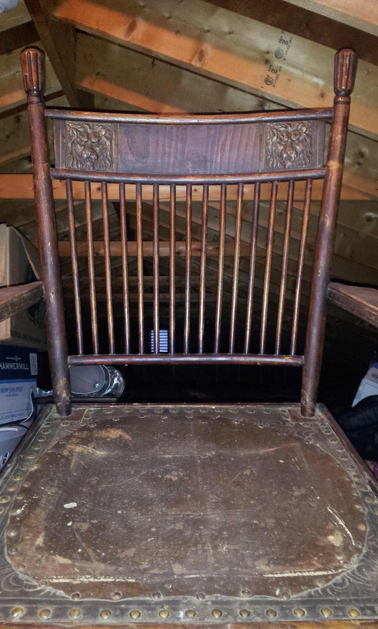 I found this chair in a friends attic. It had been covered over in fabric and had been used in a childs room at one time then tossed up in the attic. It appears to be of hard wood possible oak and has an embosed leather/horse hair stuffed seat which at some point in time had a poor repair (leather patch tacked on to the original) done. It seems to have a striped fabric underneath (i assume its not original to the chair) holding the horse hair in. The seat itself is square in shape, wooden with a round hole where the padding(horse hair) is. I have not tried to remove either the top leather or bottom fabric to see what the whether its made that way or someone tried to pad the seat in a poor fashion. Any help would be greatly apreciated. I can get other info ie:dimensions, pictures or anything that might help in identifying the chair.