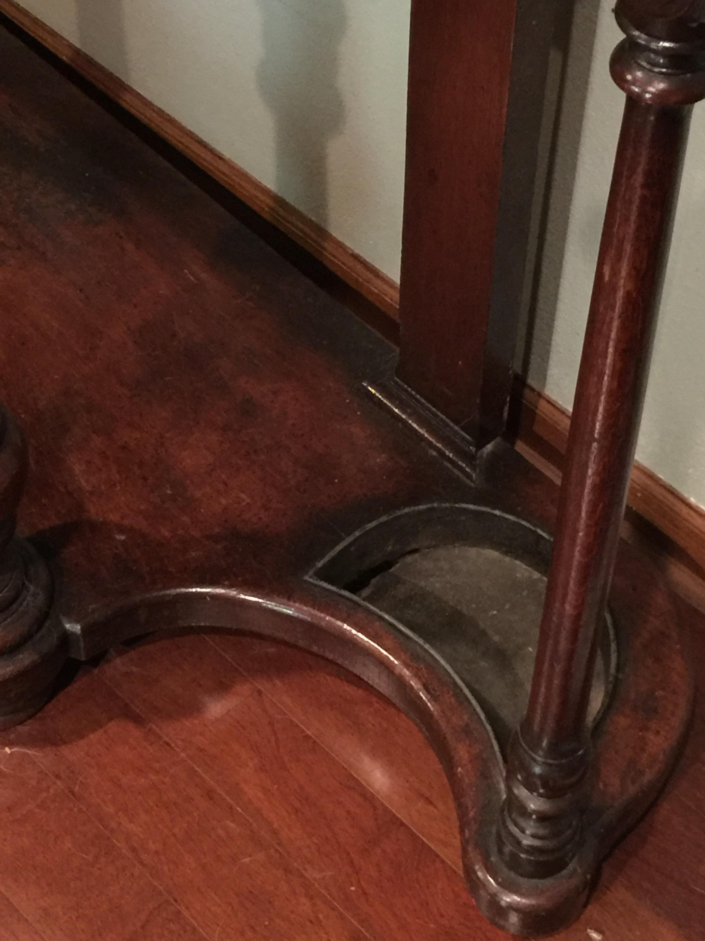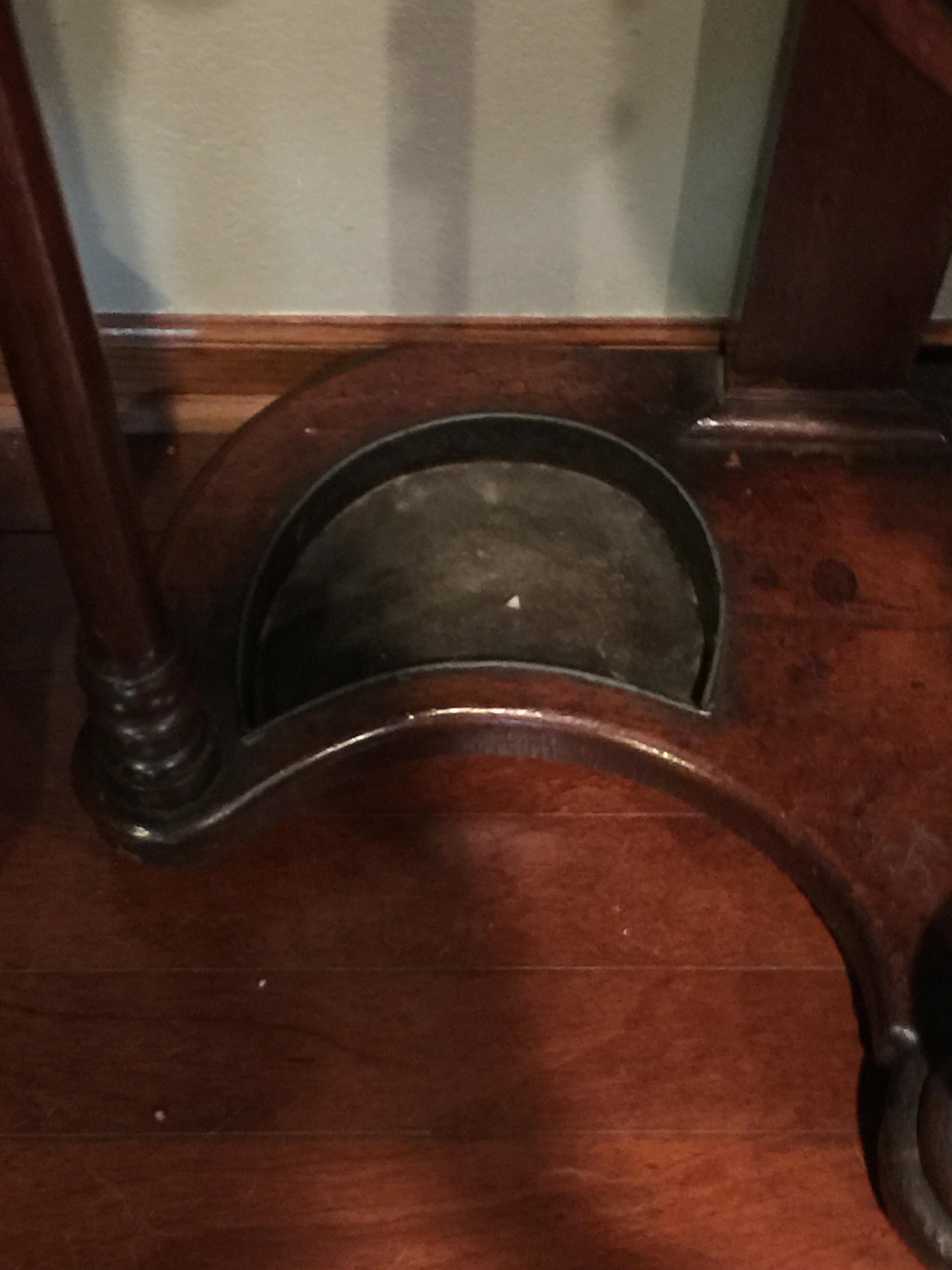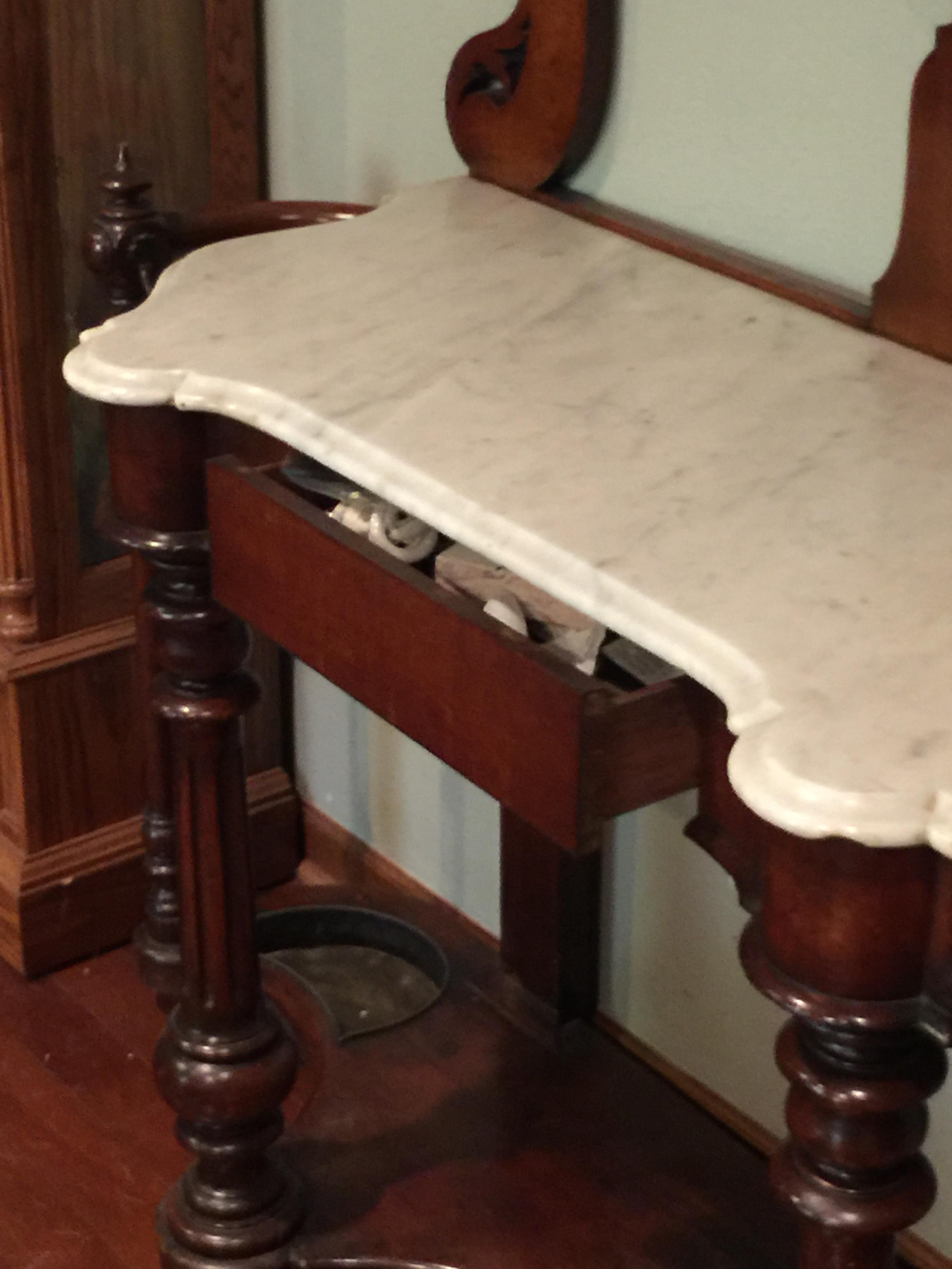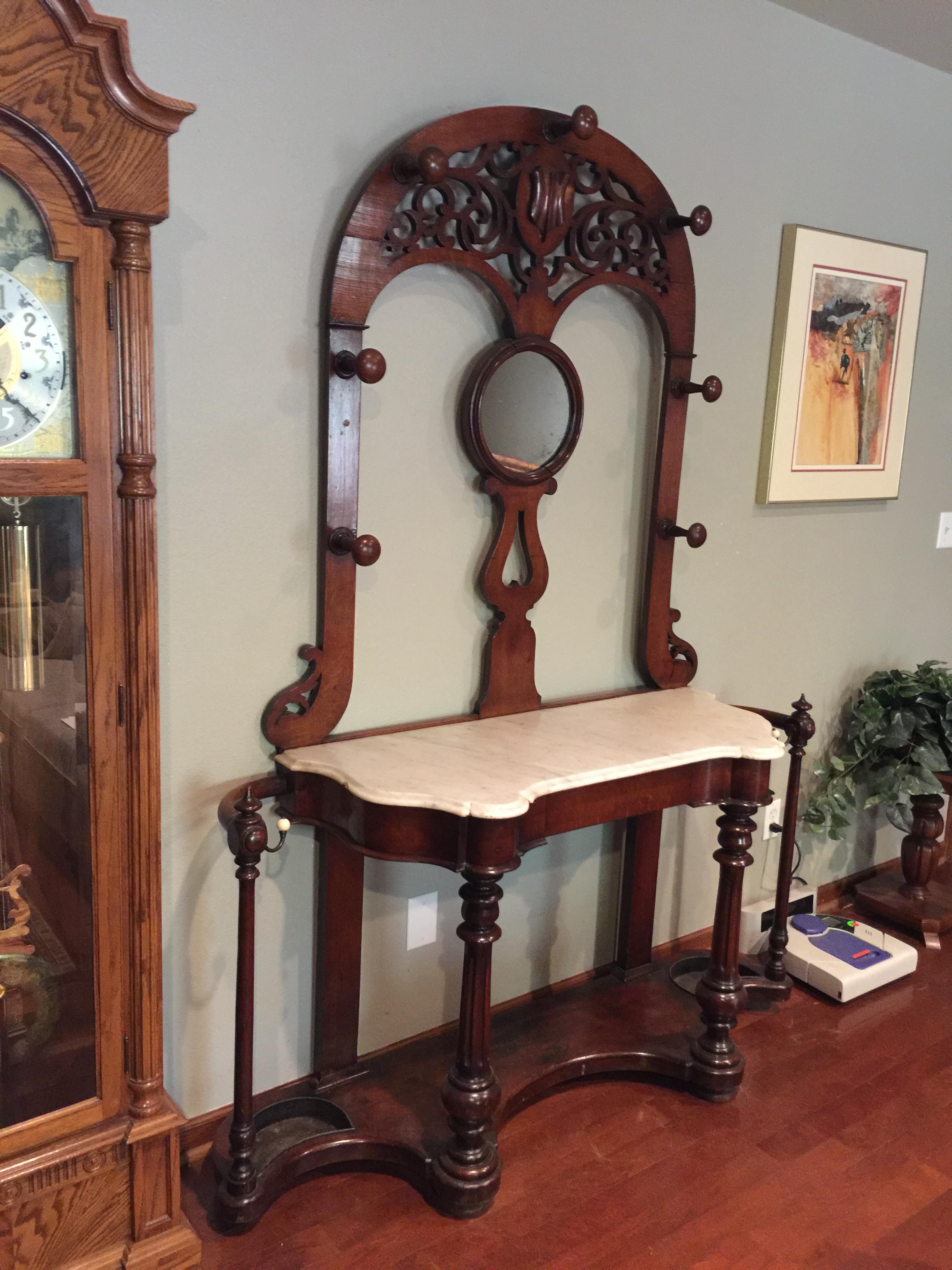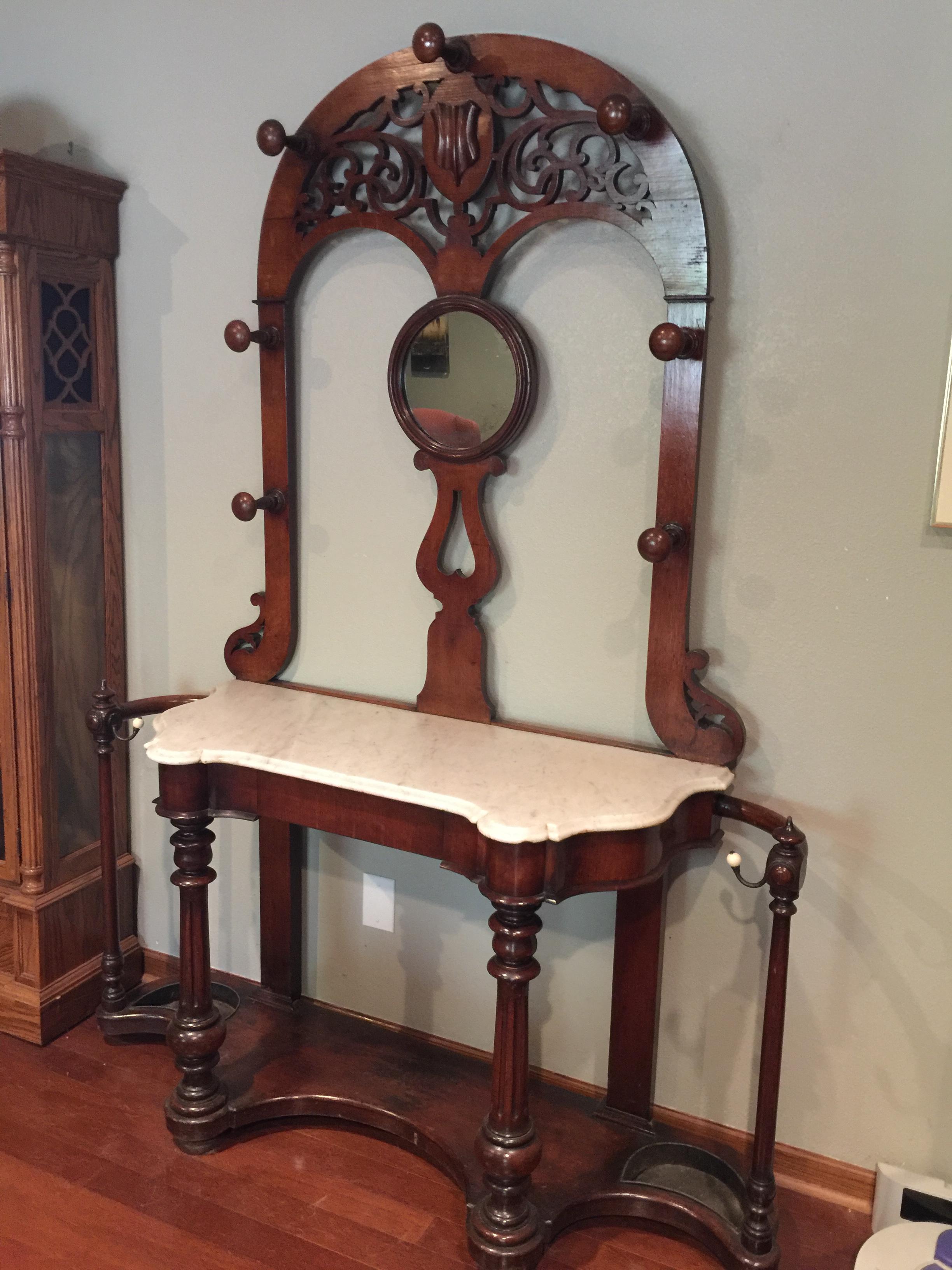 I'm respectfully asking for an idea of what I have. This piece was given to me with very little background. It has a marble top; one of the umbrella drip buckets is rotted through in the corner. Victorian? Colonial? It is slightly bowed at the top (as the photo shows). Otherwise, it is in fantastic shape. I want to understand if I should have a rider on my insurance policy for it, as the giver said "you can easily pay for your son's braces and have a nice vacation after from this." His braces were $6,500...so, Thanks so much for your response and help.