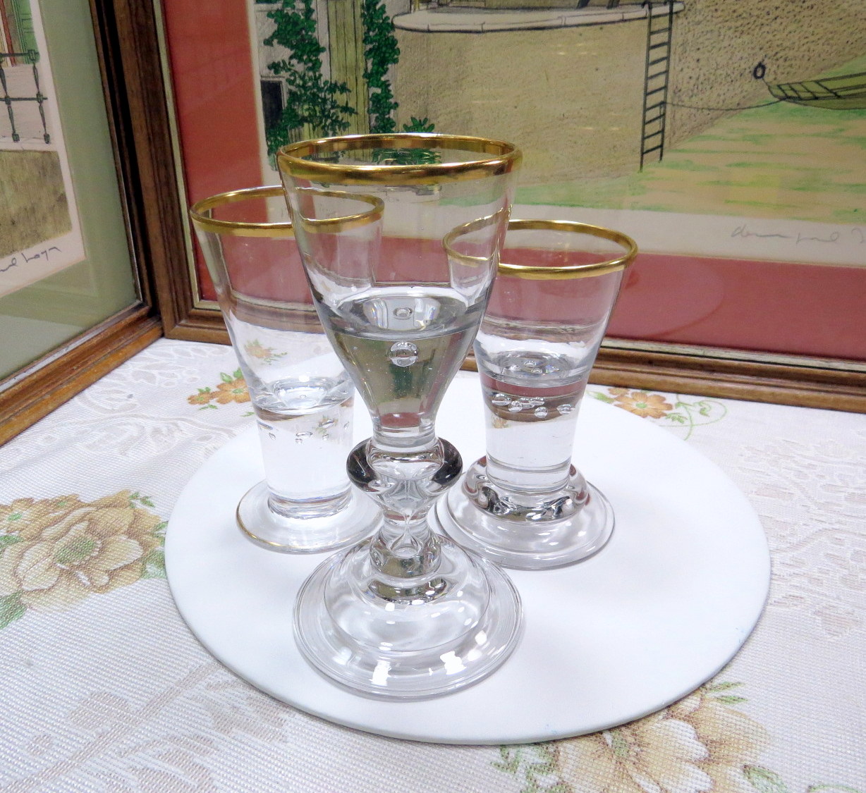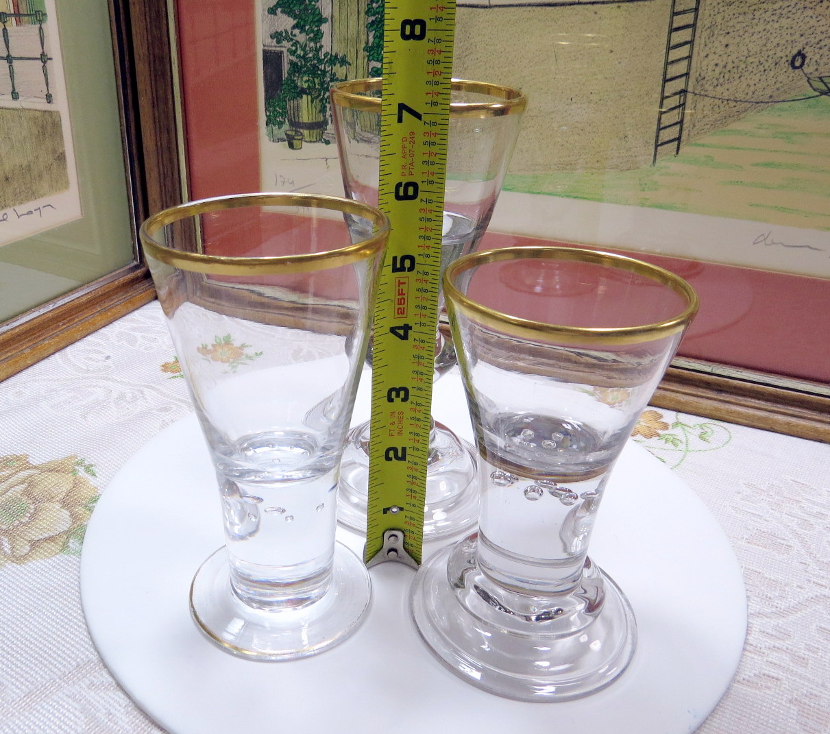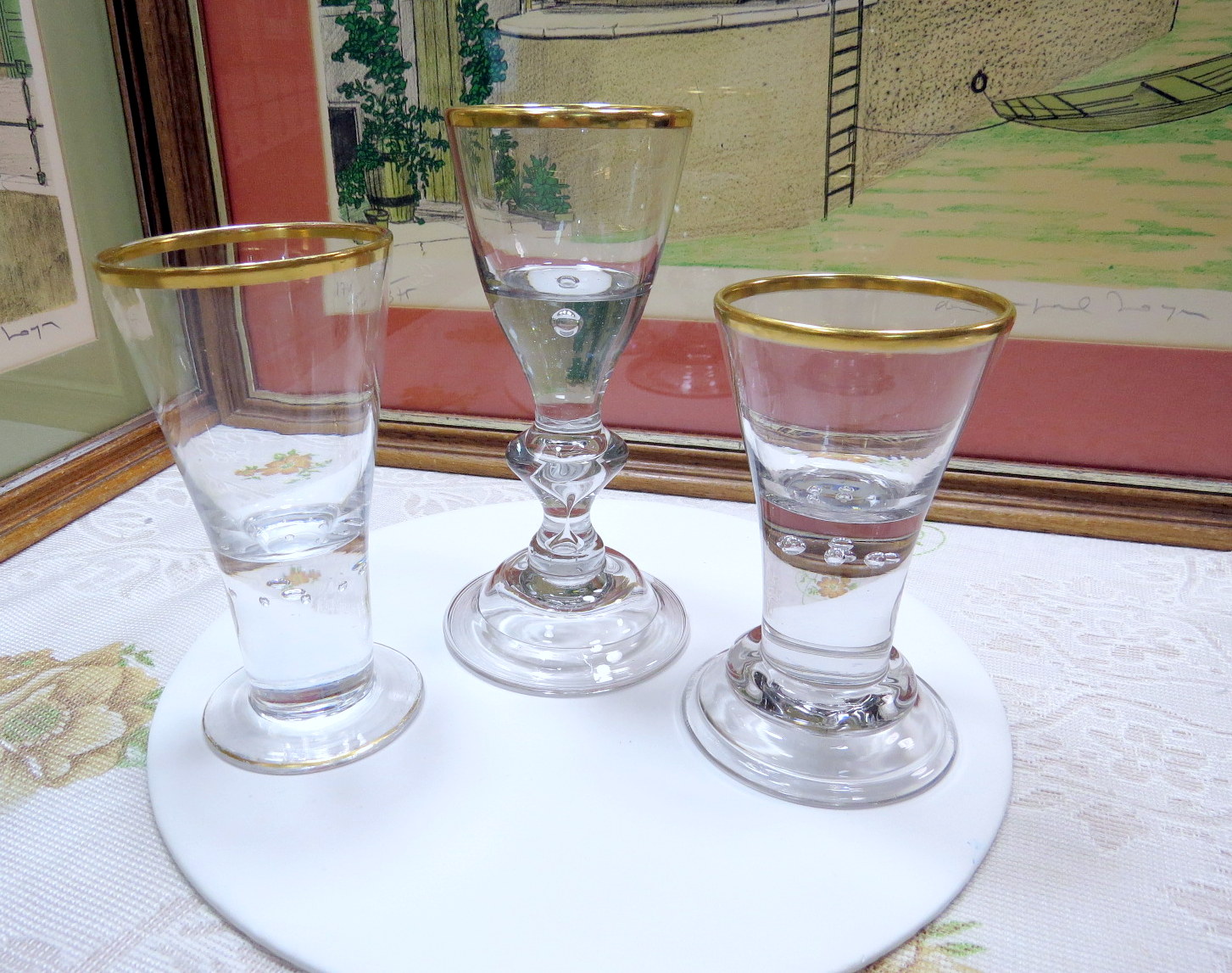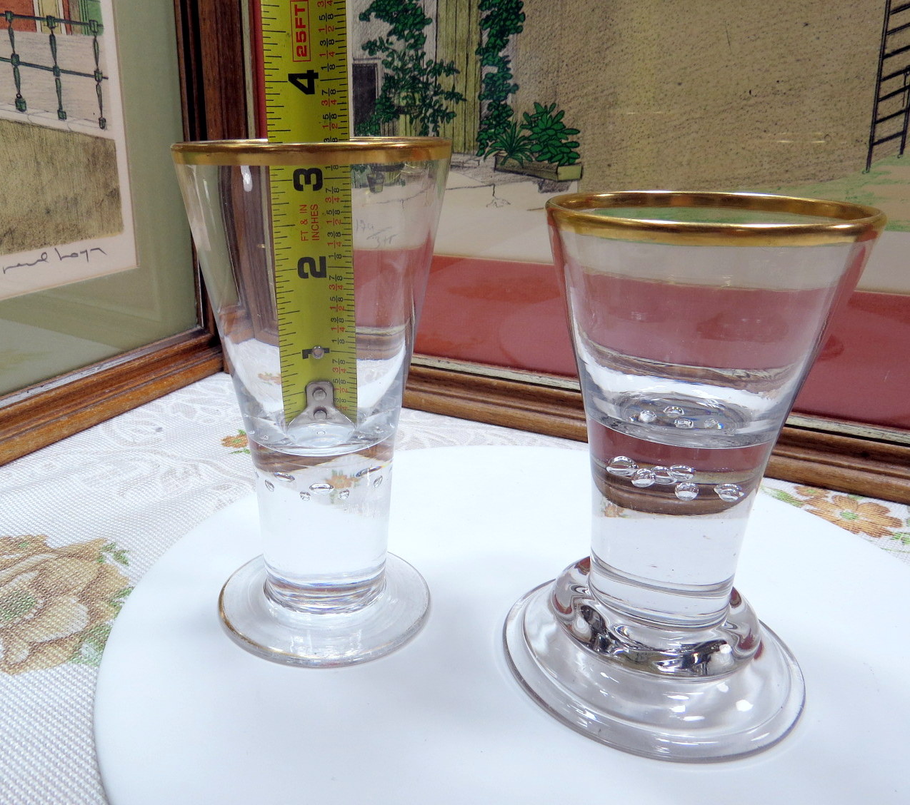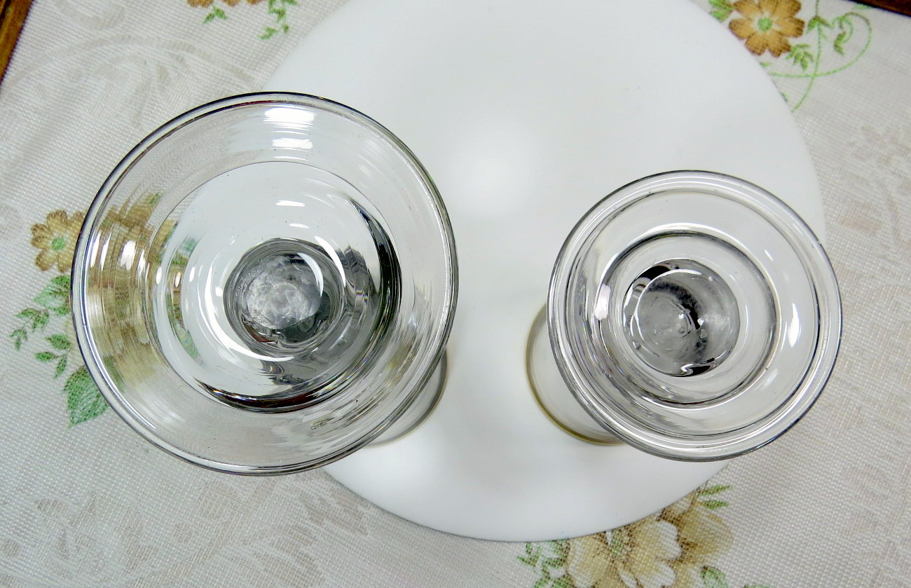 Antique blown heavy feel. Footed goblet has bubble. Flared tumblers have controled bubbles. Solid glass up to the middle of the bell. Semi rough pontil. Roughly polished pontil feels semi smotth to the touch.