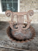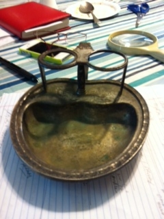 it's heavy metal, base is shaped like 1/2 apple, it has a handle (backside) with 2 openings on top (for pipe or candle)?