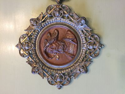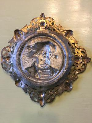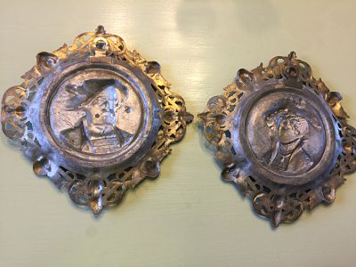 These relief portraits are some type of silver colored metal, possibly pewter. They are very heavy. Each one from corner to corner is 11 inches and is almost 2 pounds a piece. The frame part appears to have been painted a gold leaf color and the portrait part appears to have been painted a copper colored paint. The frame and the portrait is all one piece. There is an attached ring on the back for hanging on each one. I bought these from the goodwill website for $12.99 for both of them. They had them listed as brass but when looking at them, they are not brass. They came from the goodwill in Lufkin Texas. The website had them listed as Henry VIII and his wife but in my research this is just not the case. I need some help identifying these as I haven't been able to find anything else like it at all!! In my opinion they are really interesting and very ornate with the cherubs around the frame.