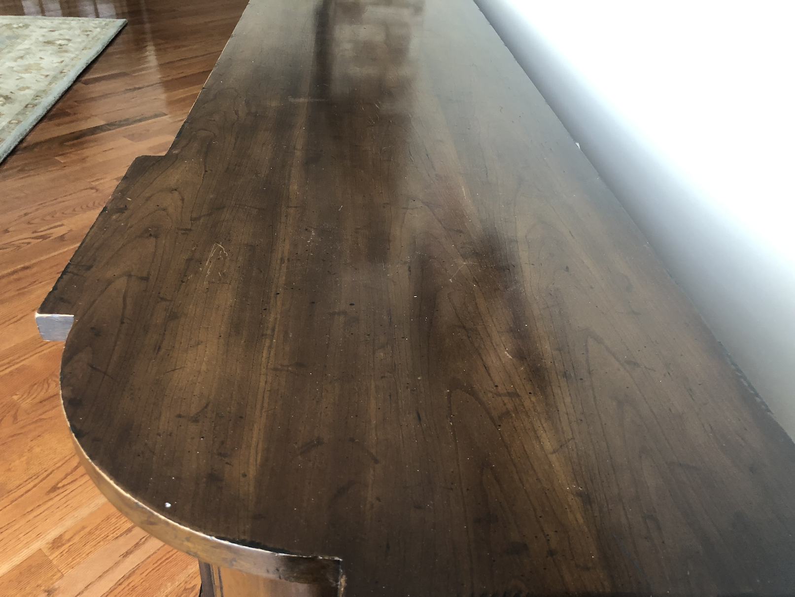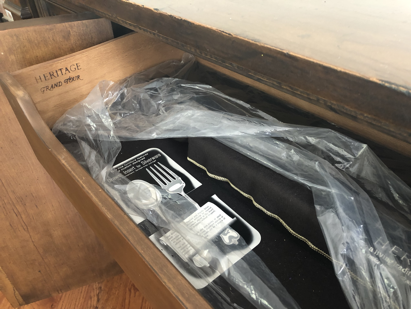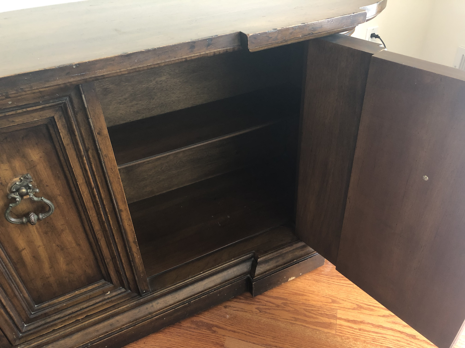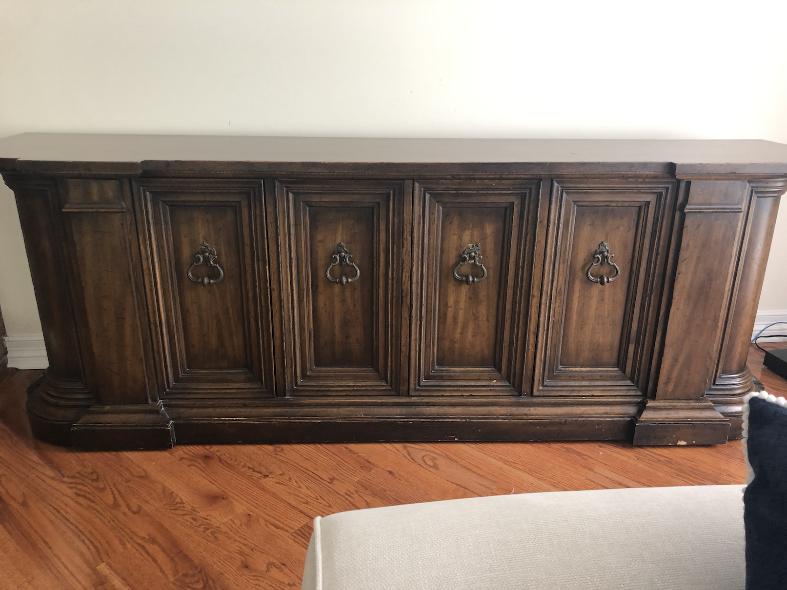 Heritage Buffet. It is solid wood and on wheels. Very heavy. Handed down from parents/grandparents. Not sure how old it is. Buffet is in good condition with minor visible wear.