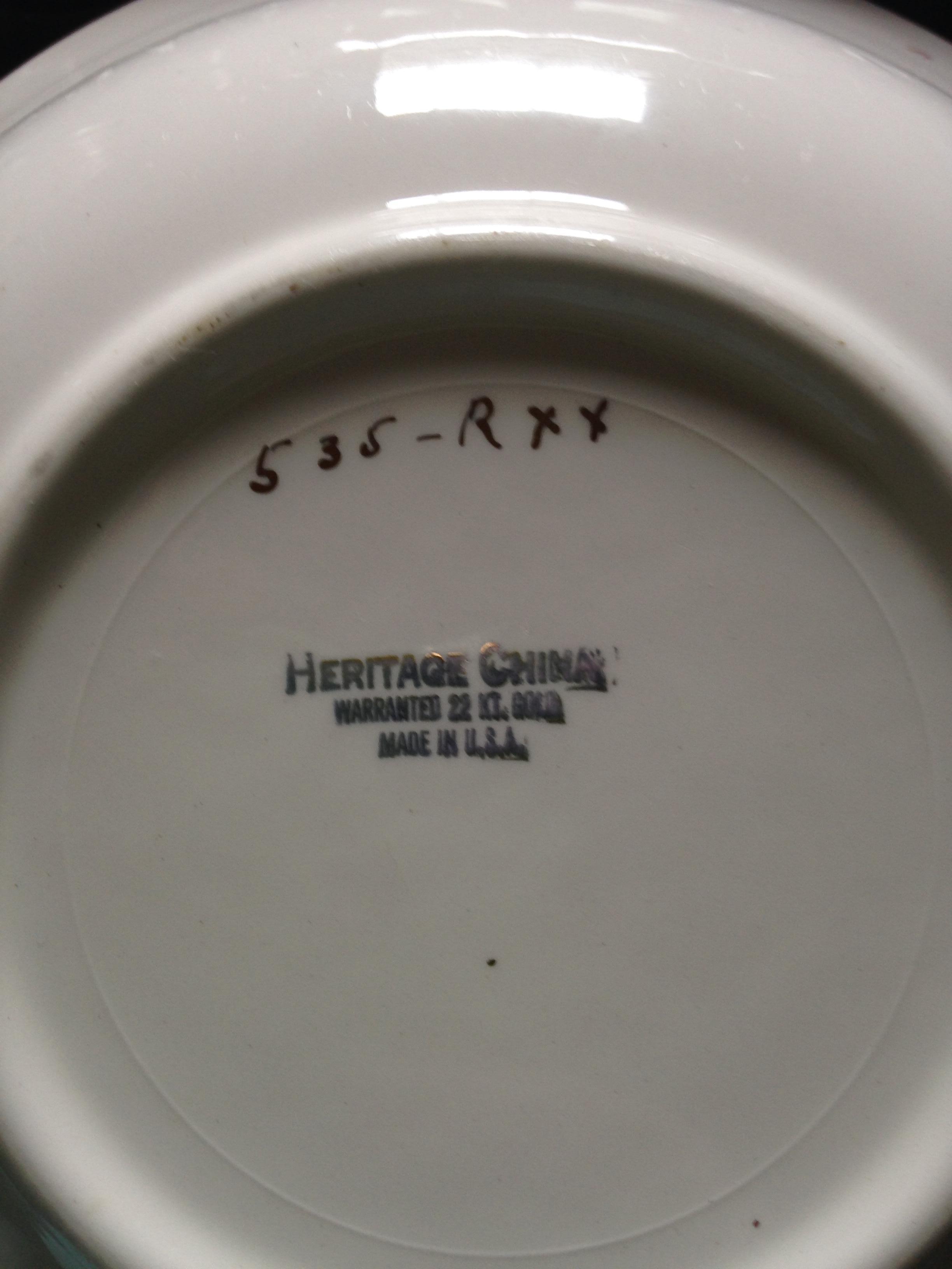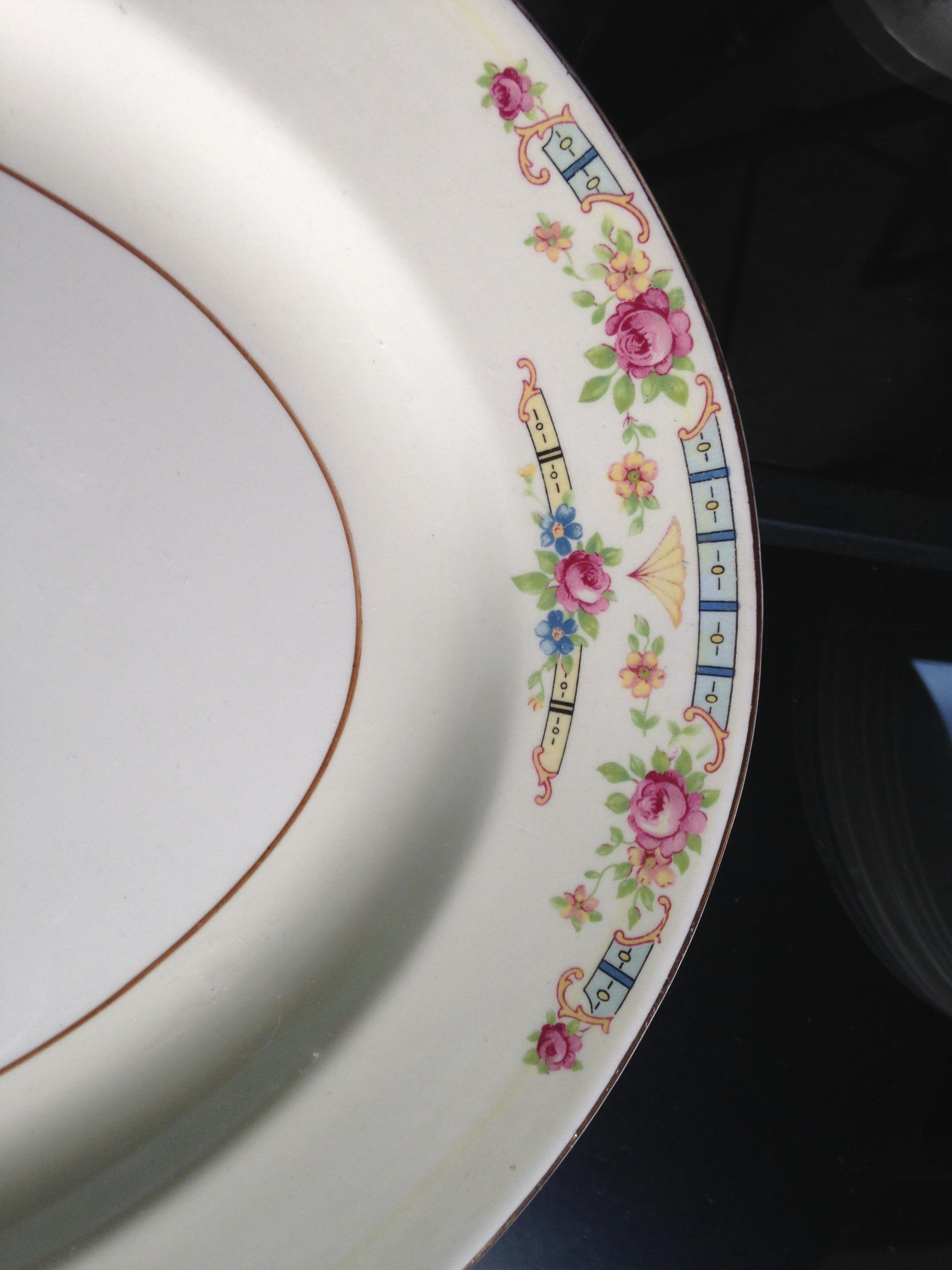 52 Piece Set. 22 kt gold edging, not sure of pattern name. Guessing 1940's. Good shape. 8 cups with saucers, 1 creamer, 1 sugar dish, 8 desert bowls, 8 salad/soup bowls, 8 dinner plates, 1 serving bowl, 1 serving platter, 8 bread & butter plates. All very well preserved.