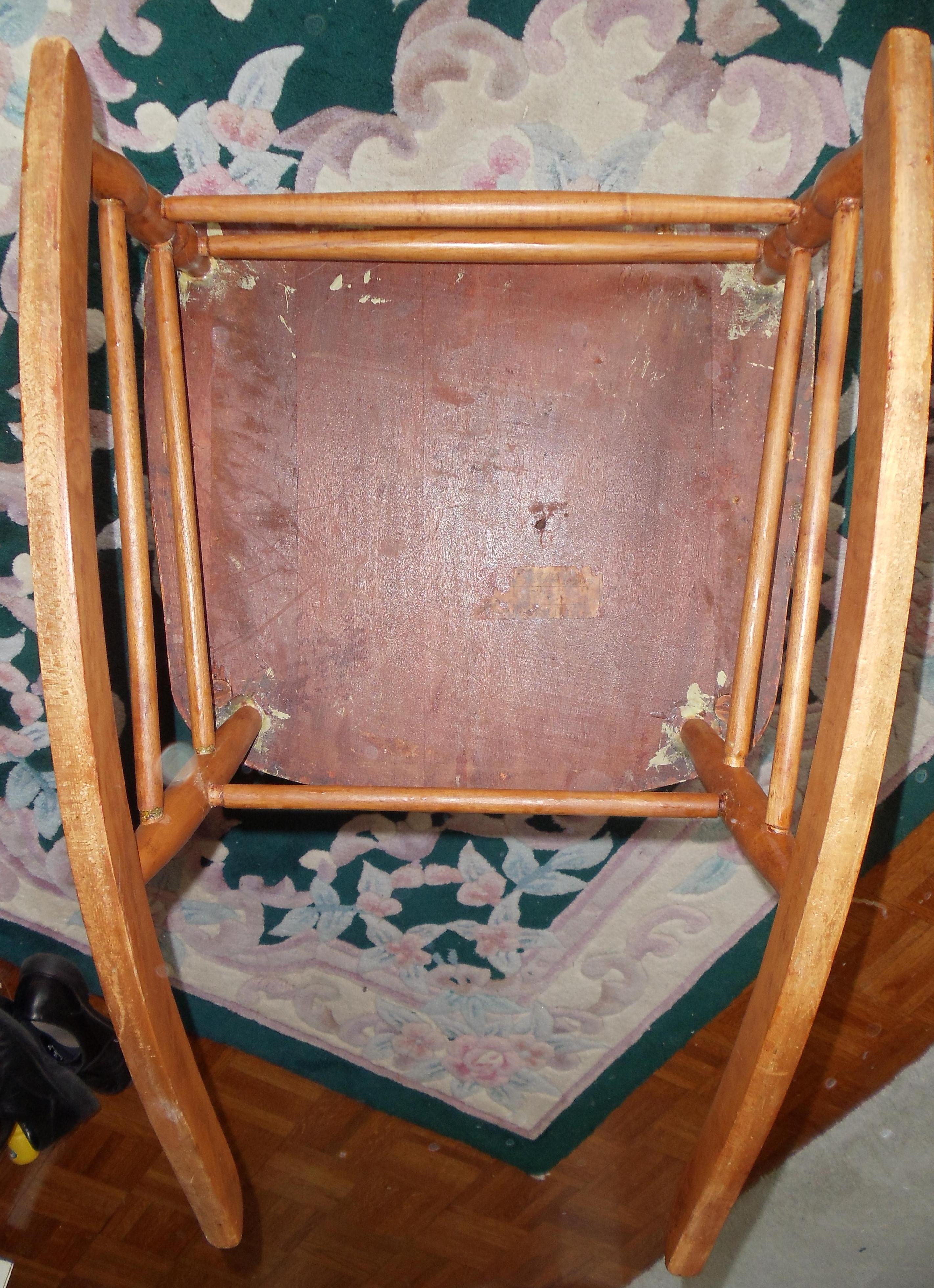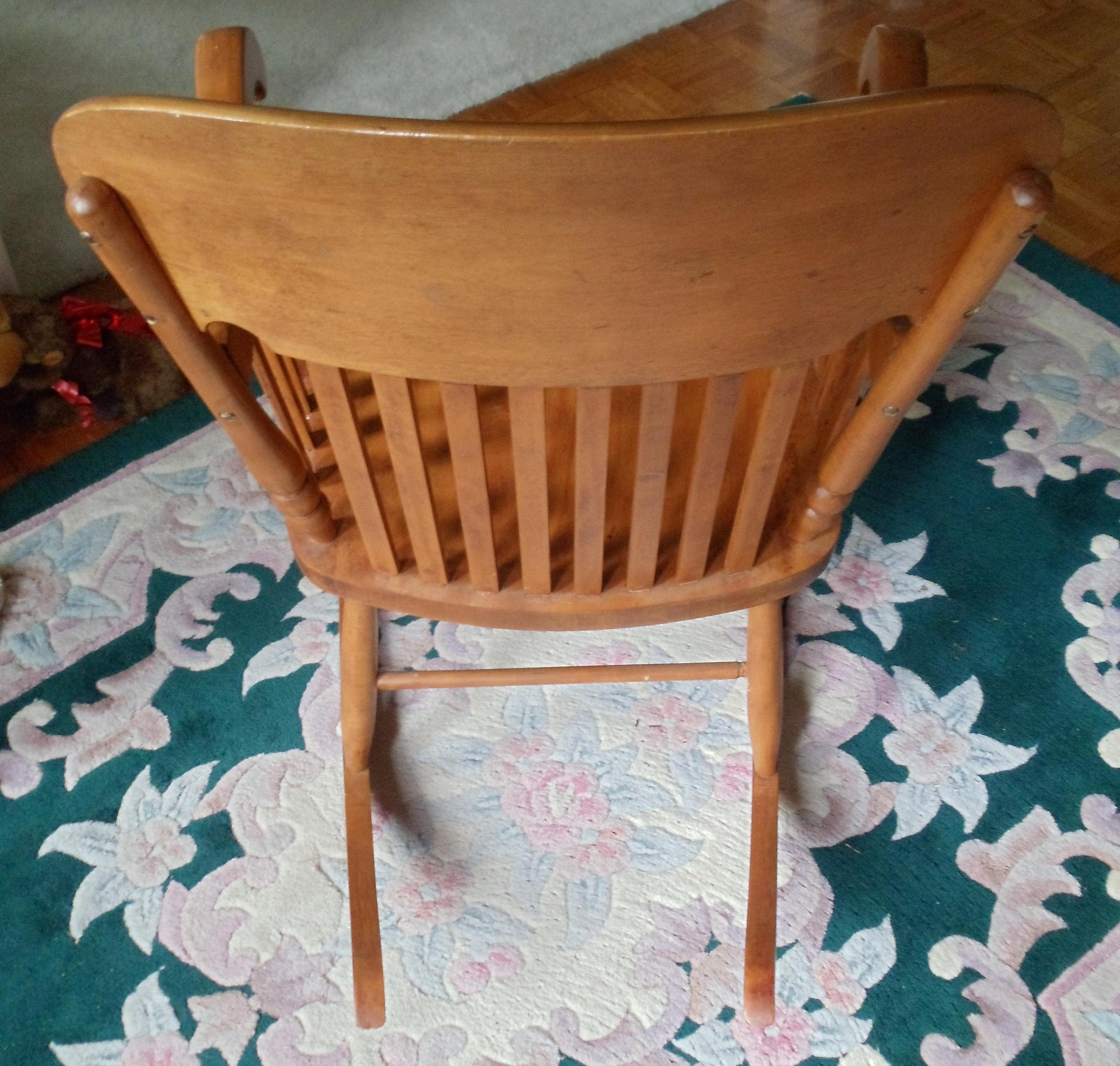 Solid upper backrest with 8 small slats coming down for lower back. 4 small slats on each side with spindle like corner posts and slightly curves arm rests tolling into a smooth claw at the hand end. Two smooth rods commecting the front and rear rocker legs on the right and left side and one in the back connecting right to left. The two in the from conmnecting right to left are more tapered from the center to end.