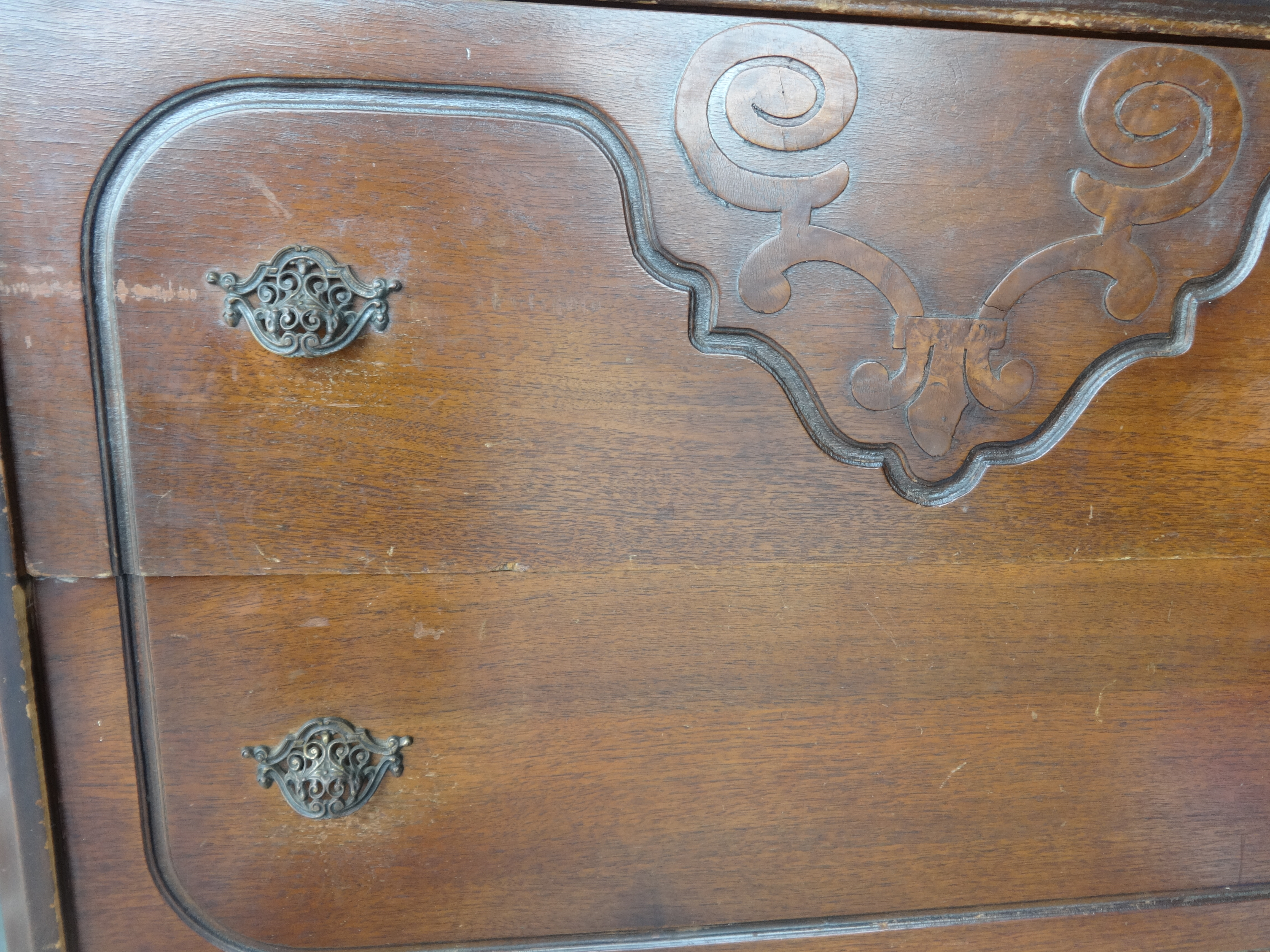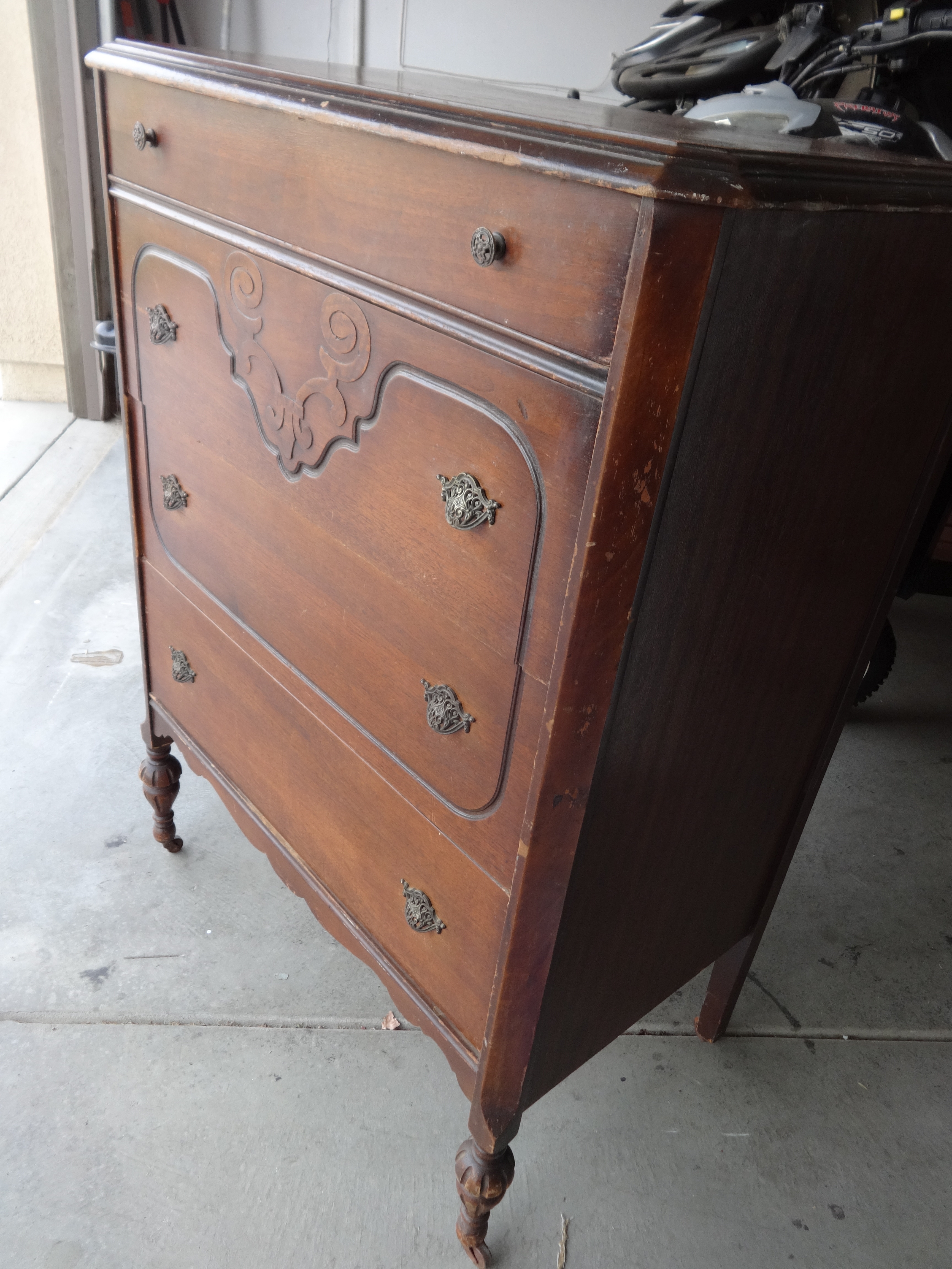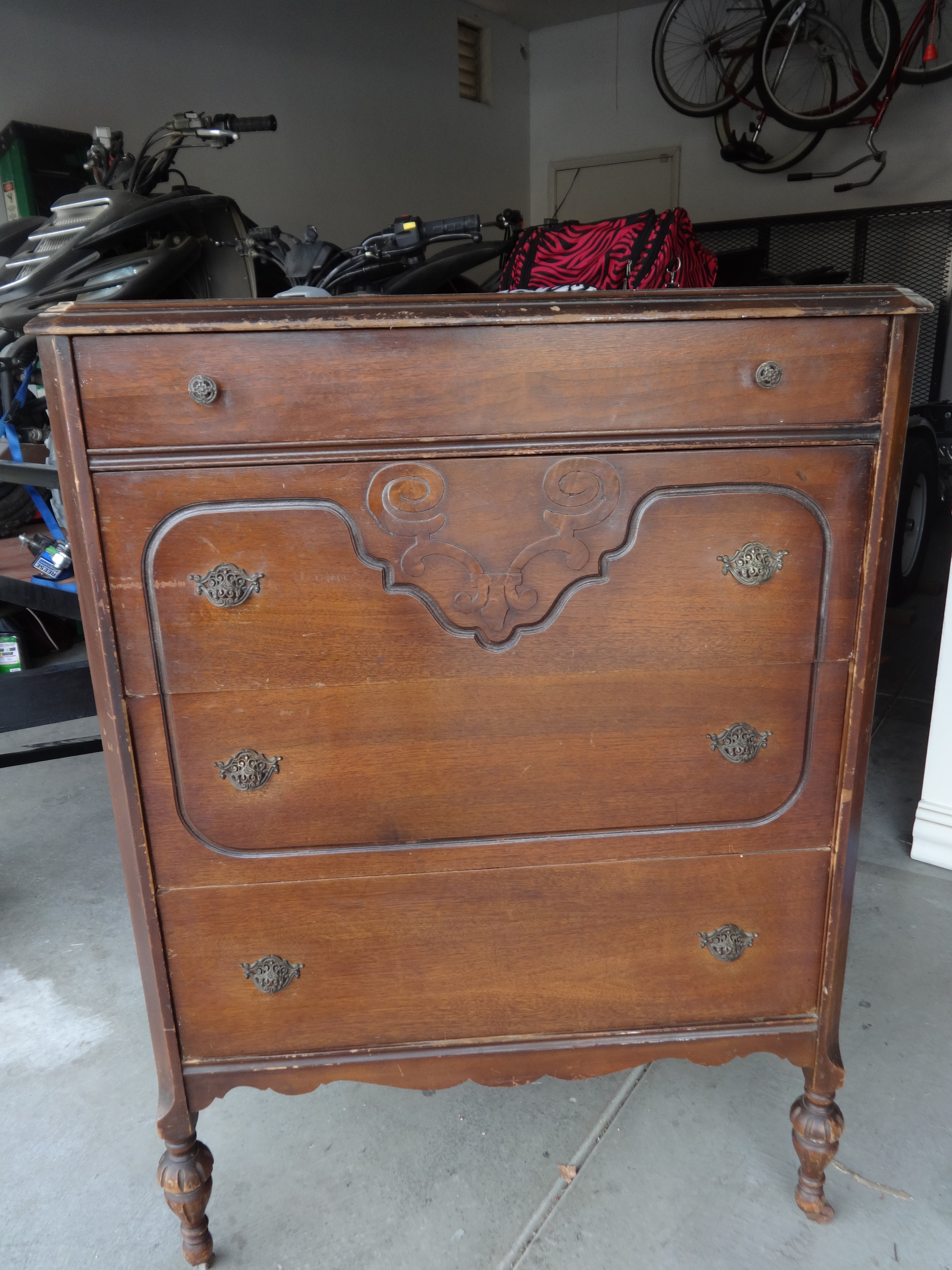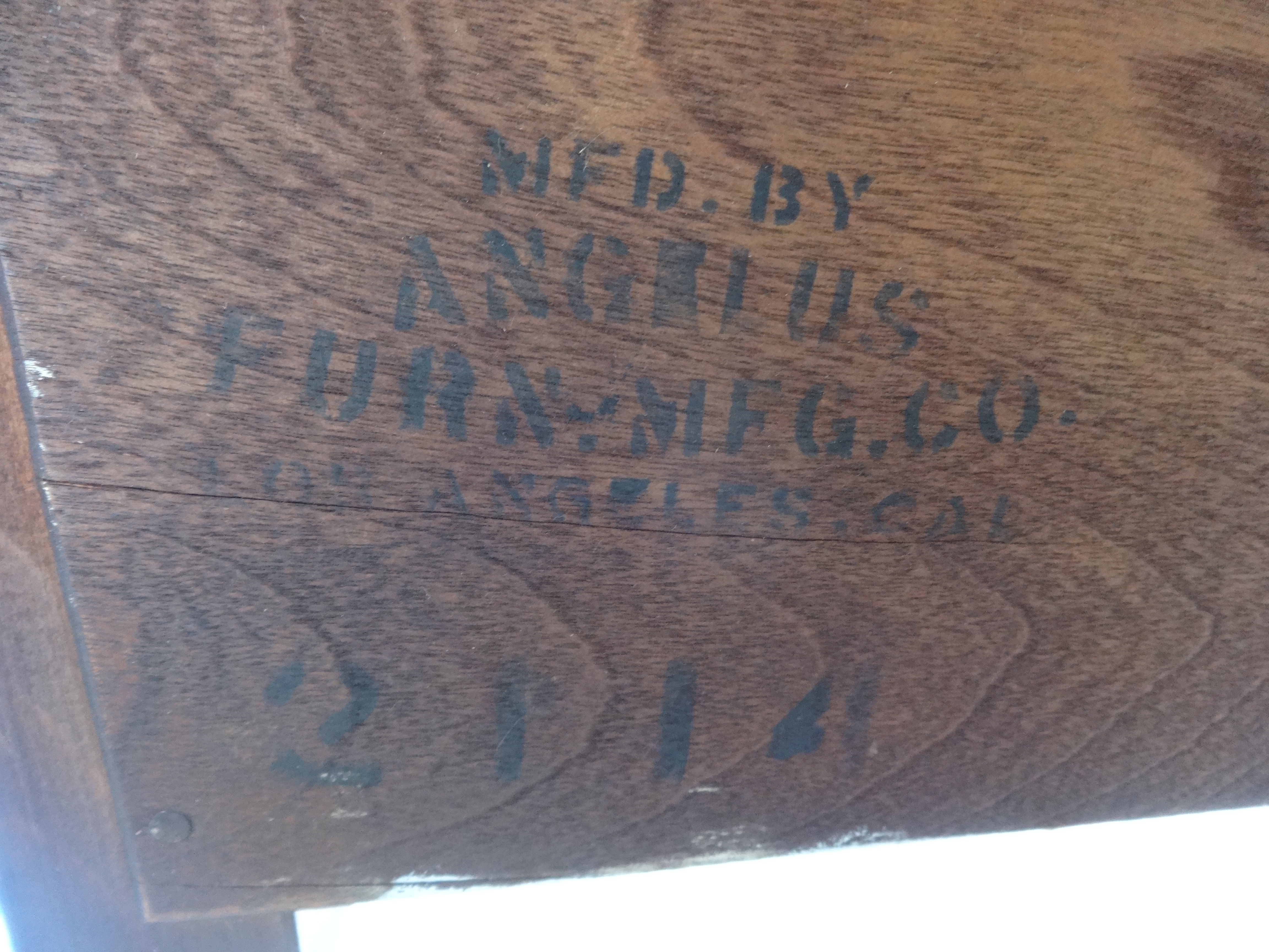 I bought this from a guy about in his 40's that told me it was his great grandmothers and had been passed down through the family. When I first bought it, I intended on repainting it, but knowing it is a family heirloom, I felt kind of guilty repainting it without knowing it's age/value. It appears to be perhaps from the 1920's? 1930's? It is in original condition. All of the wheels are in tact, all the drawer pulls are in tact, the drawers work. No cracks or broken pieces. The finish is damaged (hence, the reason I wanted to repaint it). It is stamped with "MFD BY ANGELUS FURN. MFG. CO. LOS ANGELES, CAL" on the back and I think the number 3114? I am very curious to know the age of this piece and it's approximate market value. Thanks!