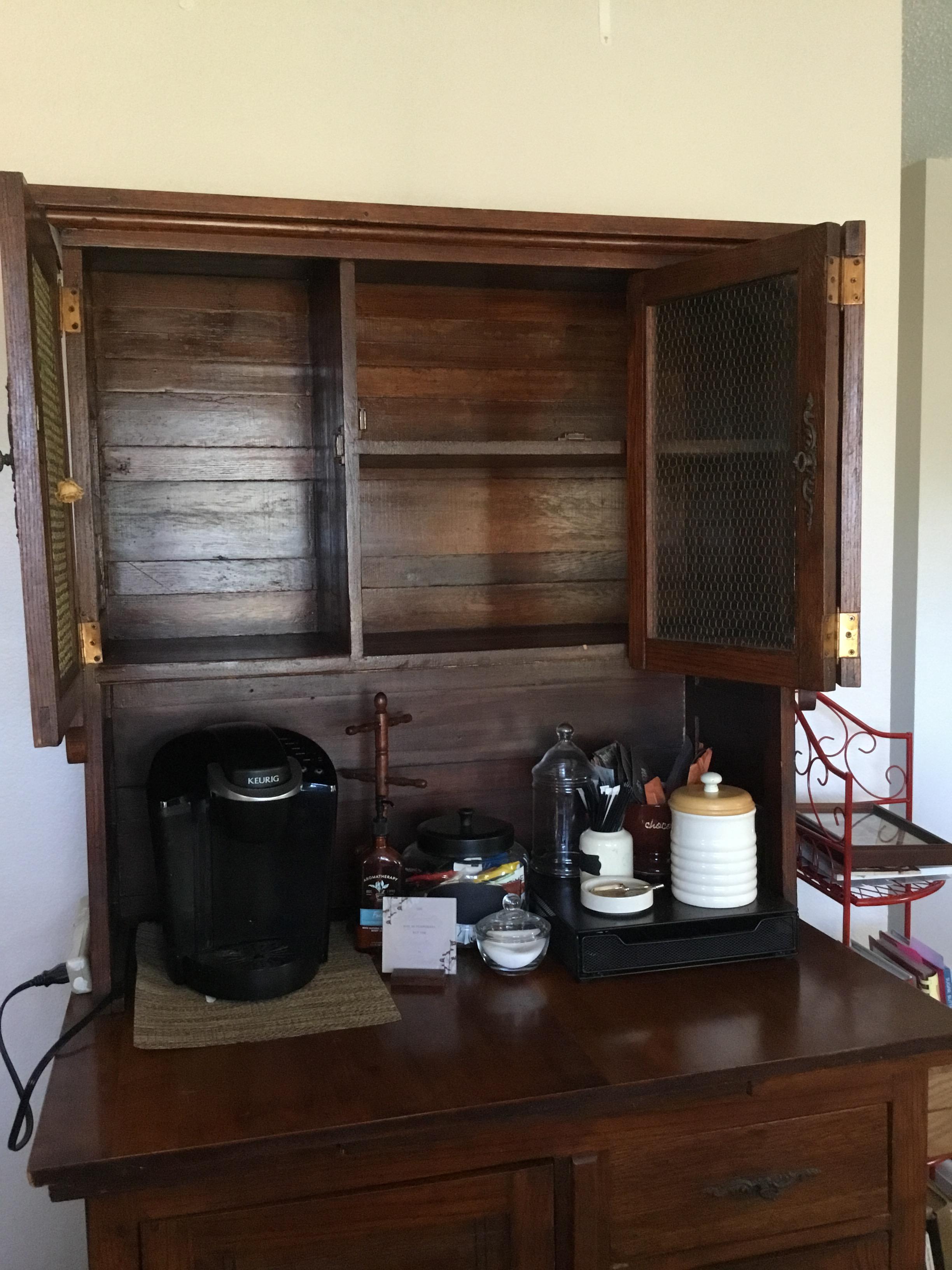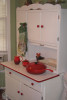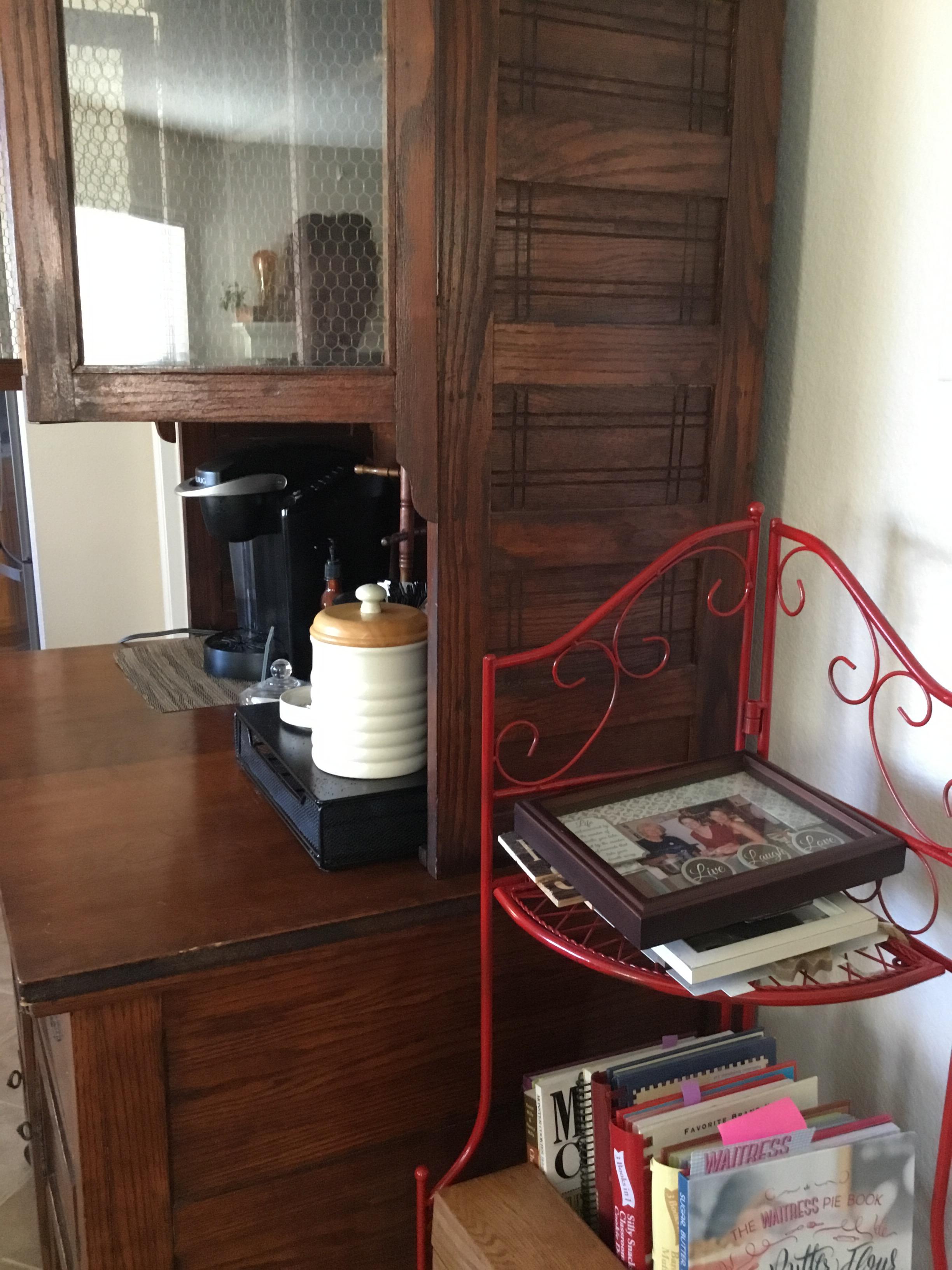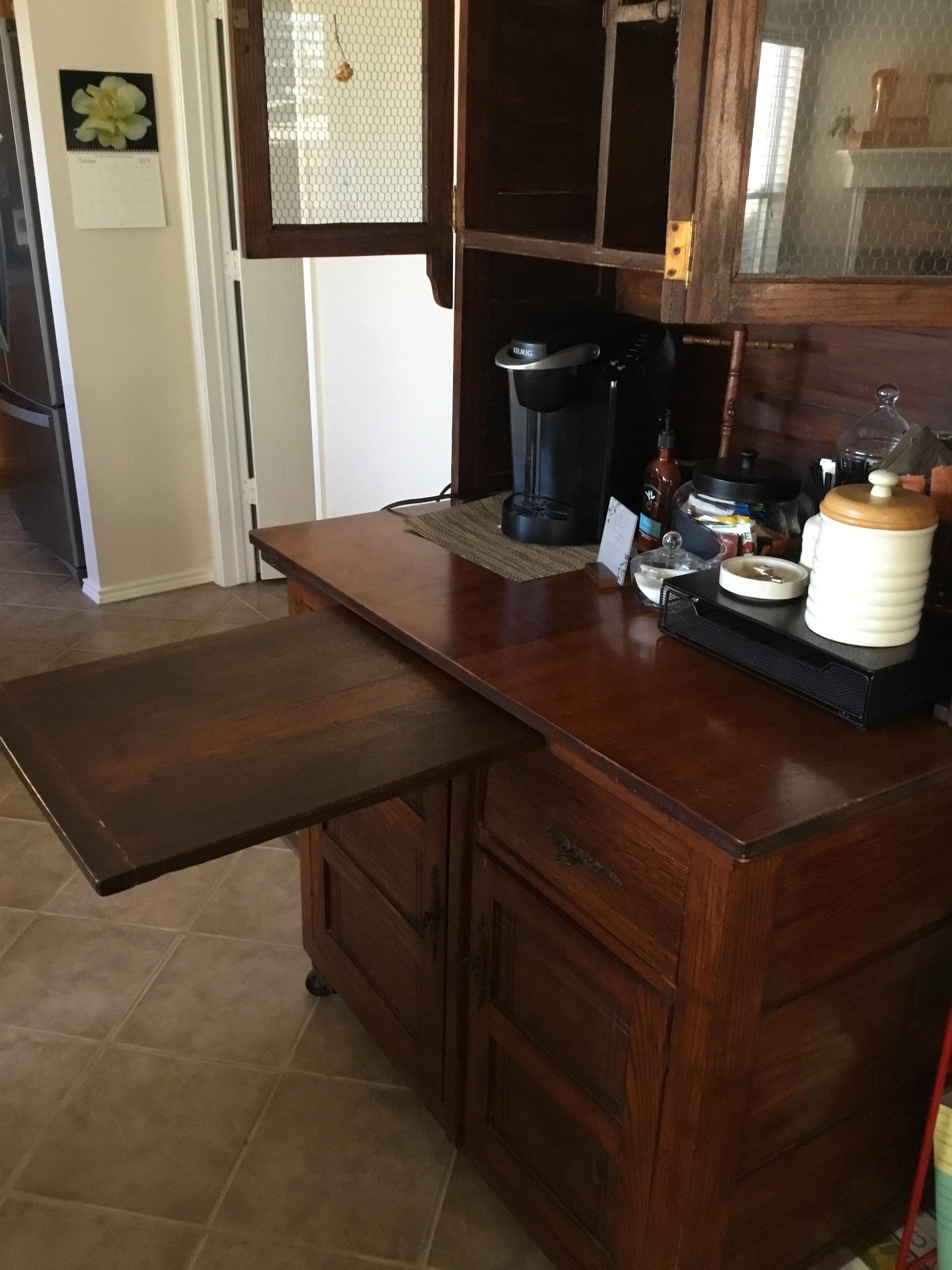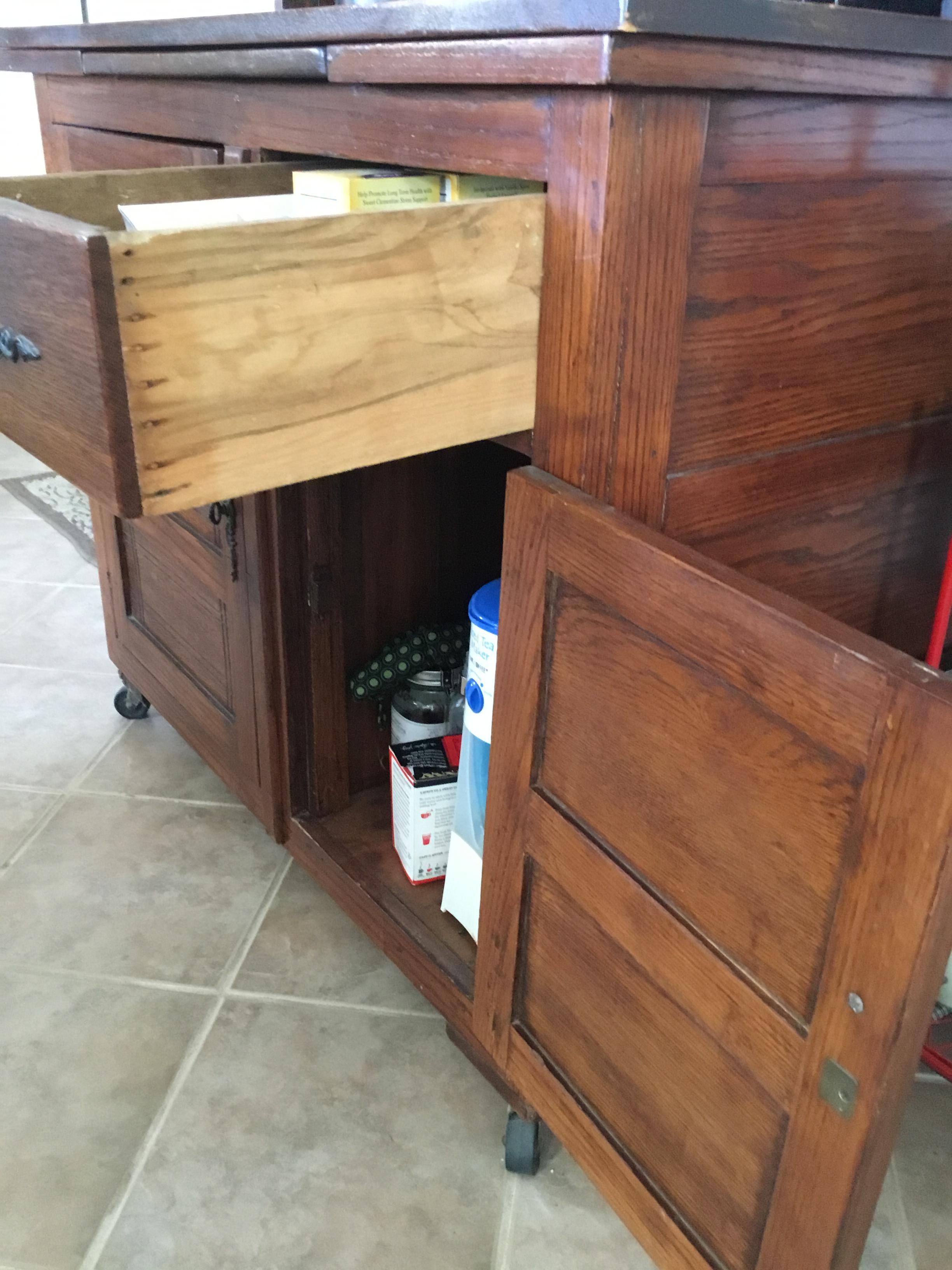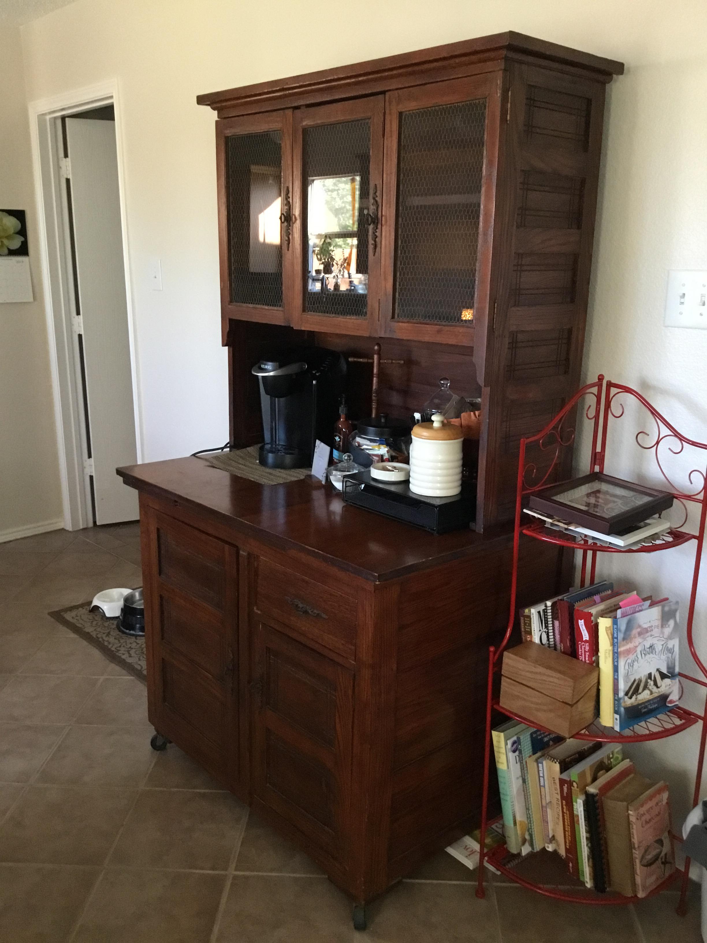 Found this old piece at a Goodwill. No maker marks that I can see. It’s definitely old, but I’m not even sure what to call this furniture. Baker’s Table? Hutch? Hoosier Cabinet? Sideboard? It has been through a remod, but even that seems vintage at this point.
