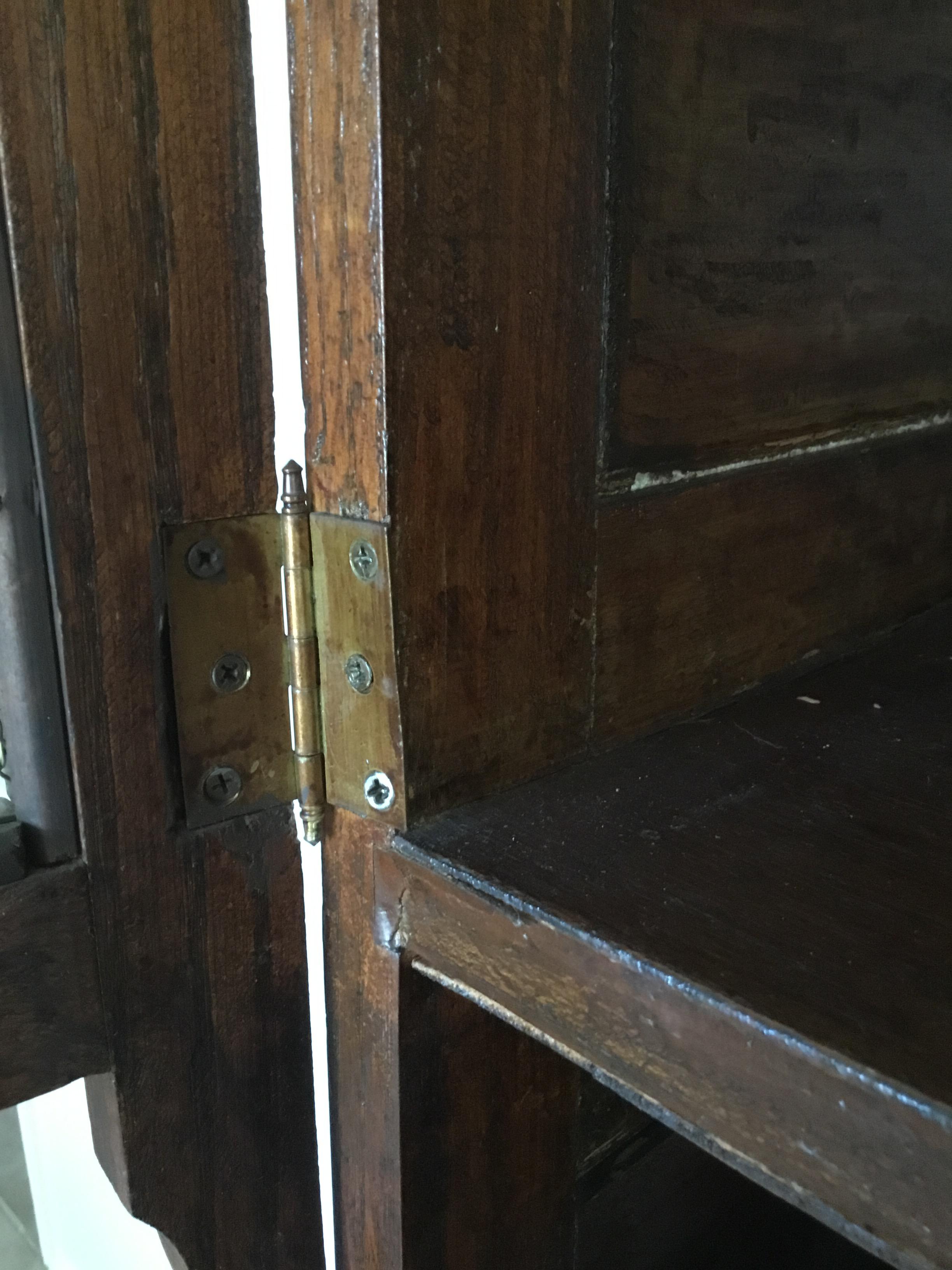 The piece needed stabilizing, so while I had the hutch off, I removed the unoriginal veneer from the underside of the full length shelf and found a hole in the center of the left cabinet...presumably for a flour sifter to pass through.