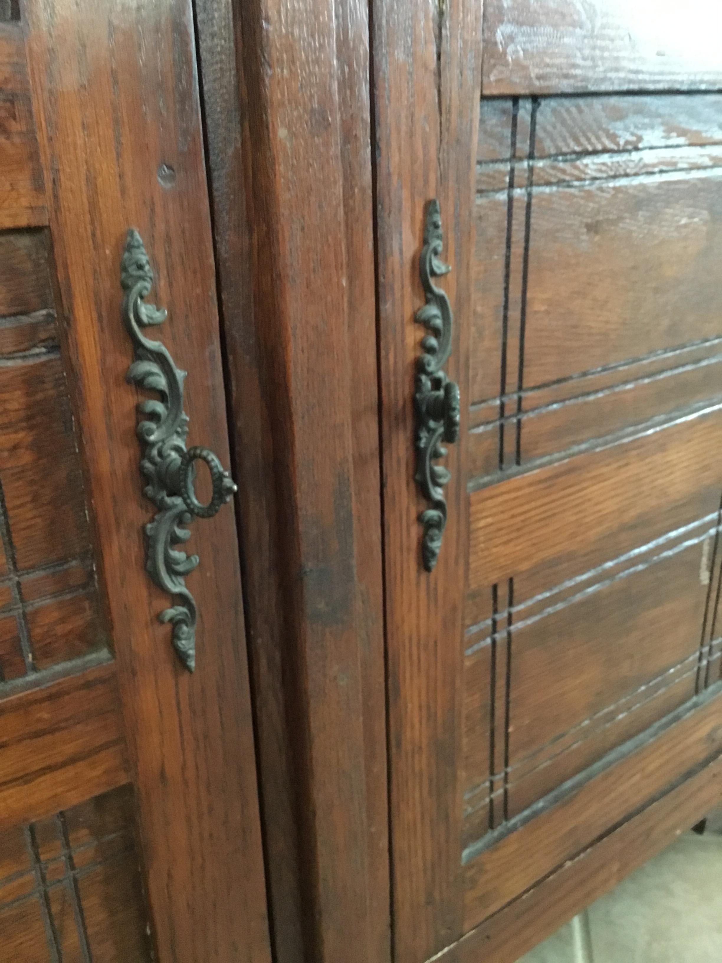 The hutch and base are independent pieces. The “tabletop” seems to be a replacement, but the slide out wooden workspace is original. There are two glass doors with brass chicken wire on the hutch. One of them is a bifold, which I can’t find as a common feature in pieces like this online. It’s quite possible they were reconfigured. The one and only drawer has the only unstained wood, but the inside of the lower cabinets is stained and slatted like the exterior sides. The geometric carving in the panels is the same on the base doors and hutch sides.