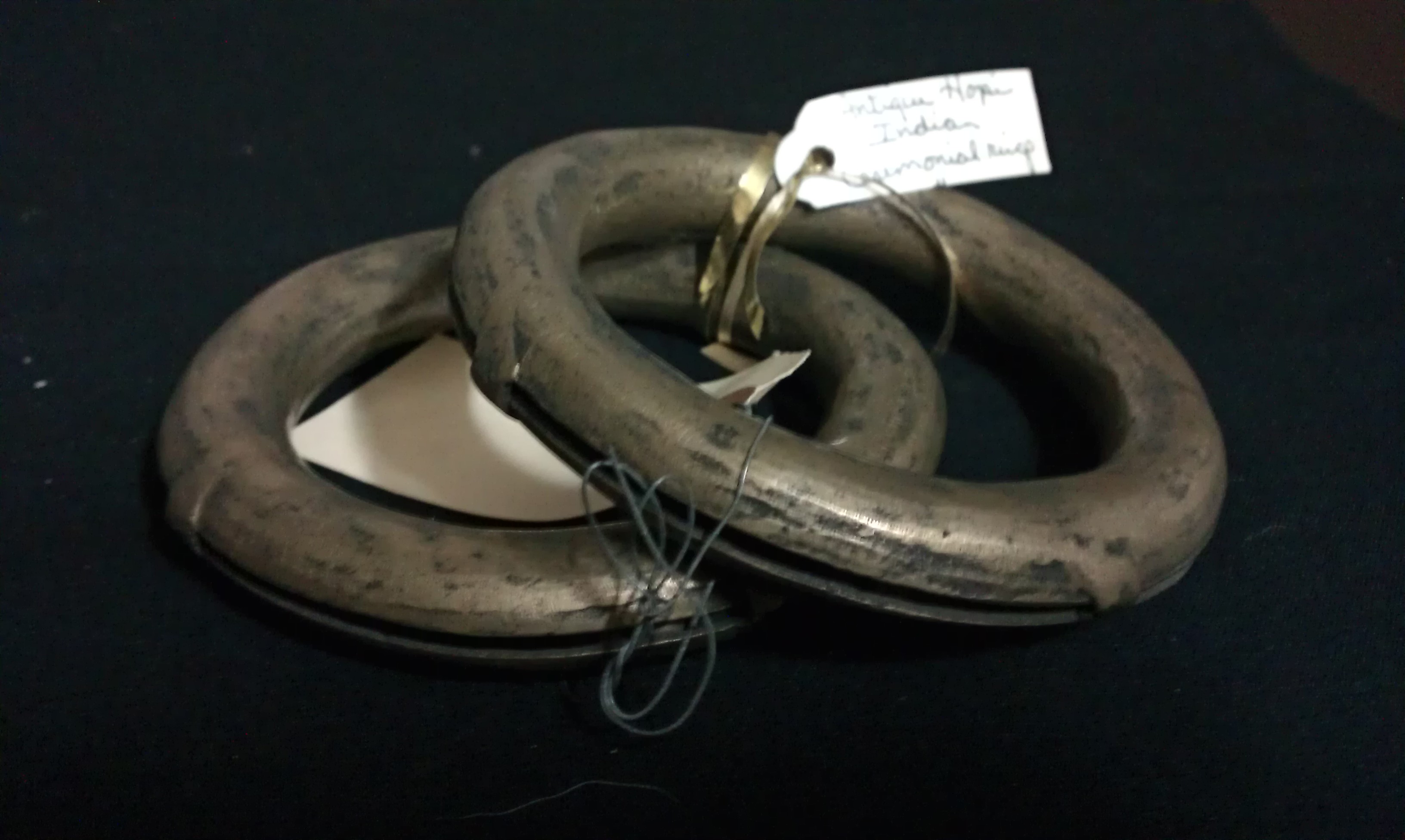 There wasn't much I can find about these rings. I was asked by a friend if I could possibly sell them for her. However, the buy was a rather impulsive one on her part at an auction a while back. I mean to say that she barely knows anything about them either. So I found this site and posted this to see if anyone with more knowledge of the objects would be so kind as to enlighten me. It would be greatly appreciated.
