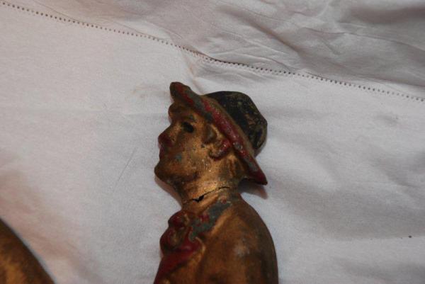 The horse and rider are gilded. The harness is painted red and black. The rider's hat and boots were painted red and black, one boot is gilded. The horse's tail was broken off, a leg slightly cracked, and the rider's neck was cracked when packed improperly by the moving company we used. The horse is still mounted on the arrow, which appears to be in good condition with some wear and crackle to the paint. No markings on the horse or mount. I need to find out the value of the piece prior to being broken and current value so I can settle a claim with the moving company.