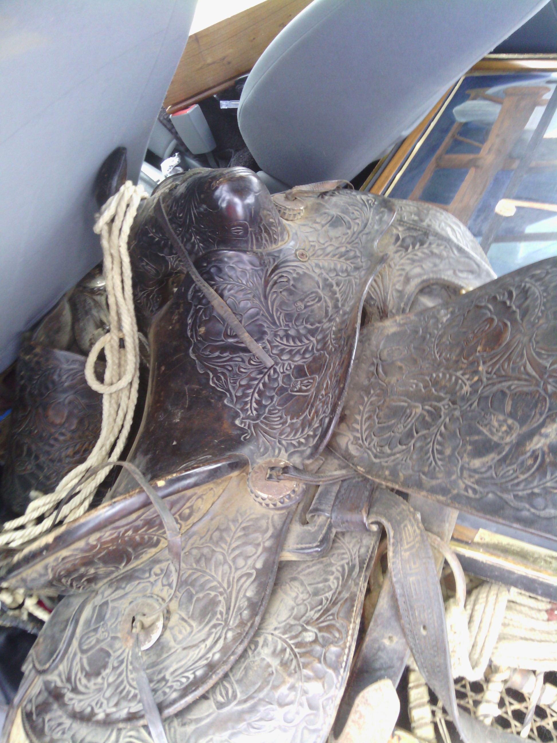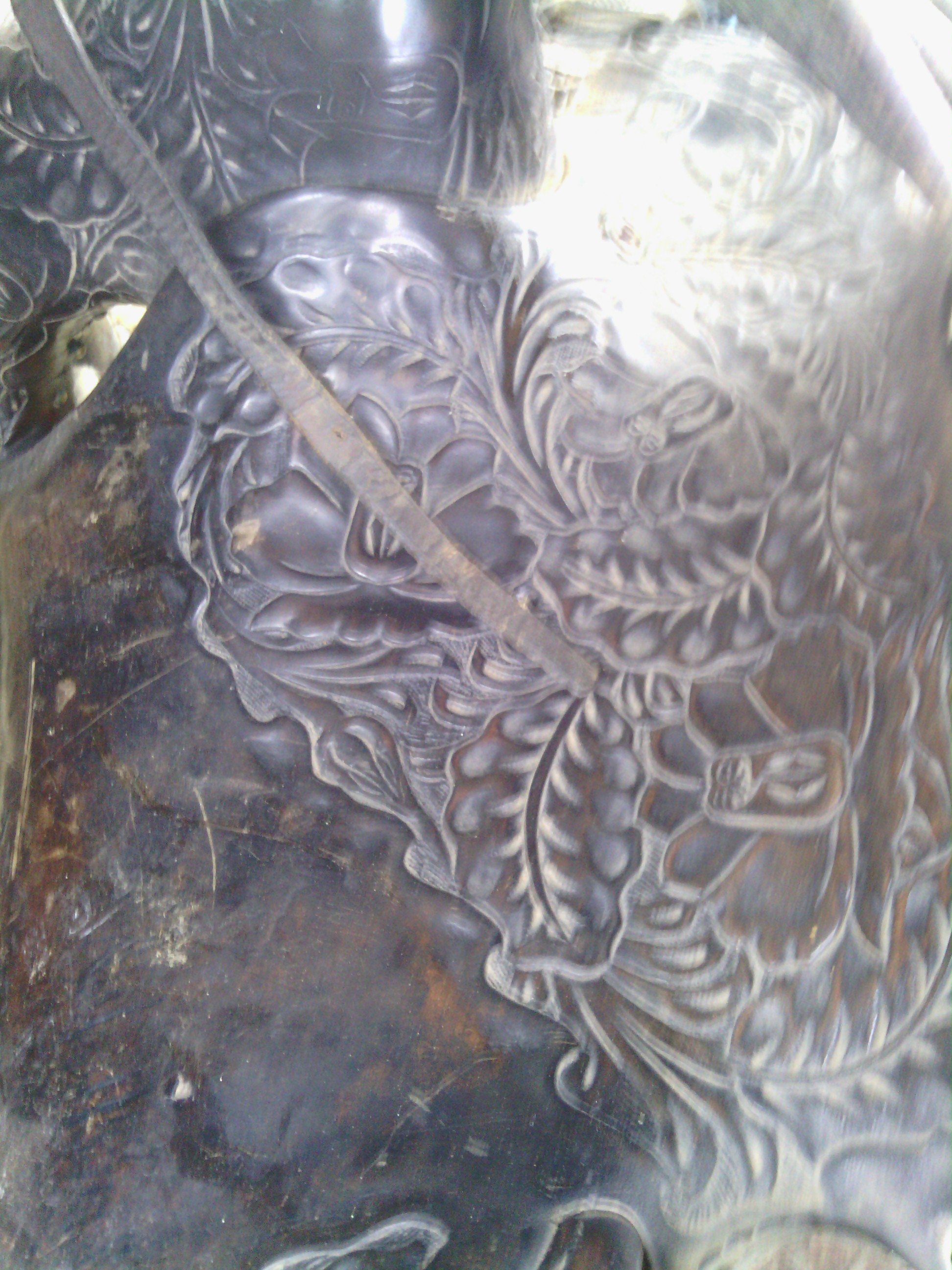 I am unsure of this saddle's age, but know it belonged to my grandmother before my father was born in 1961. It is tooled leather and in very good shape for the age. The tooling is engraved to be a floral design and the stirrups are enclosed with leather. Metal stirrups.