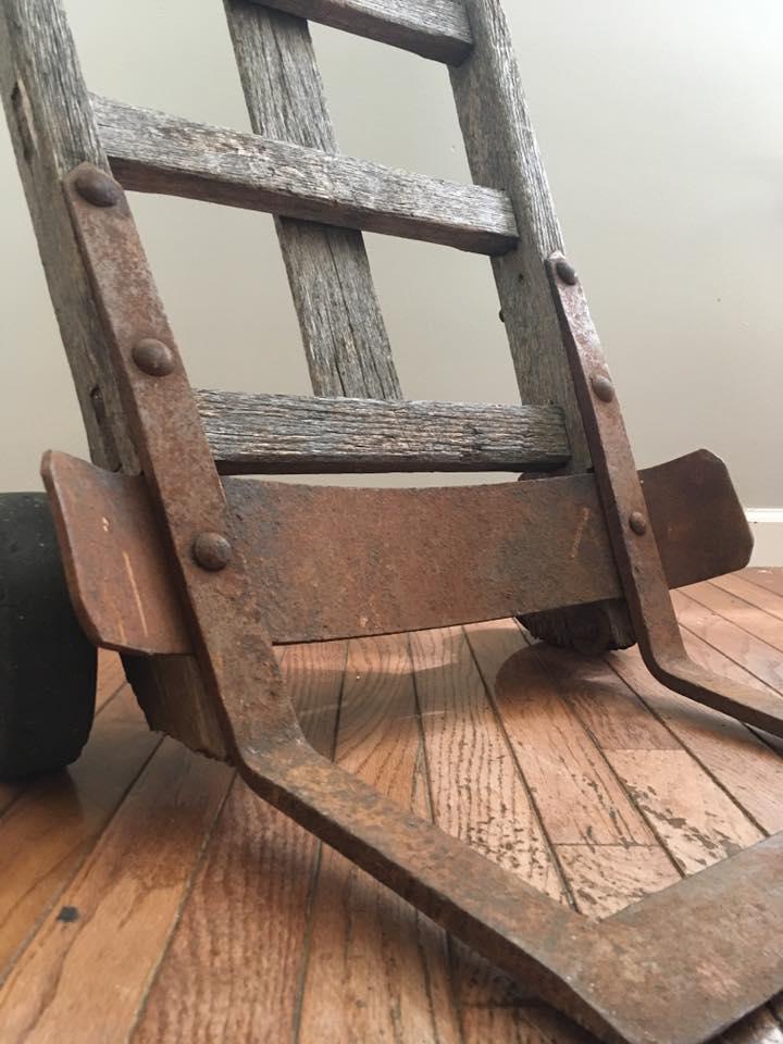 One handle was broken and it looks like the original owner or Maker made an original fix with the same wood and bolts of the rest of the Dolly. Adds a lot of charm.