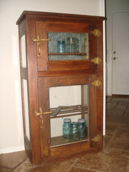Does anyone have information regarding this piece. Date, what is was actually used for. We were given it from a friend. We were told that it is a cooler/refridgerator. It has 2 doors that open. Glass enclosed around wood so you can see inside. Inside is lined with metal. We don't know history of this piece or have seen anything like it.