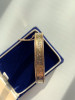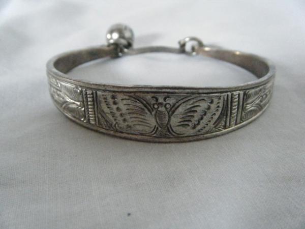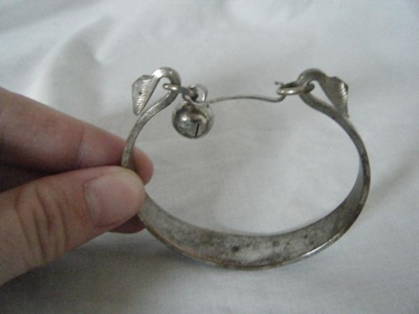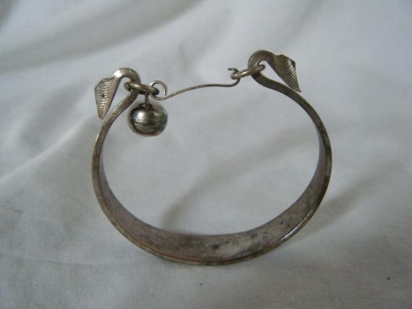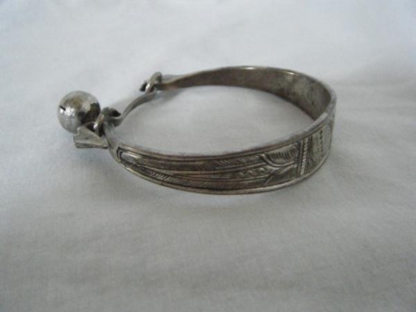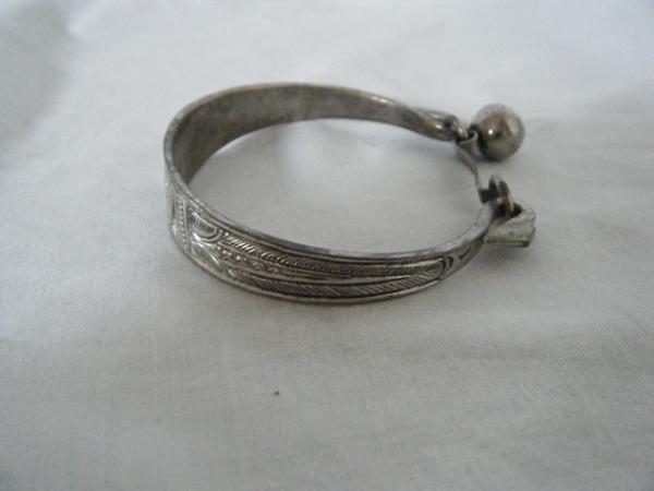 I don't know much about this bracelet, but it was definitely handmade from iron or some other heavy dense metal because it does not bend at all. I've never seen another bangle bracelet with this type of clasp/closure before. The little ball or charm hanging off is actually a bell and the designs were deeply engraved by hand (design is not symmetrical). I've researched many vintage jewelry reference books and to from everything I've read, this seems to be from the Arts & Crafts period at the end of the 19th century; maybe even Egyptian Revival. I had it listed on eBay, but I cancelled the auction because I couldn't shake the feeling that I was going to end up selling it for $10, only to see the same one on Antiques Roadshow with an enormous appraisal value!