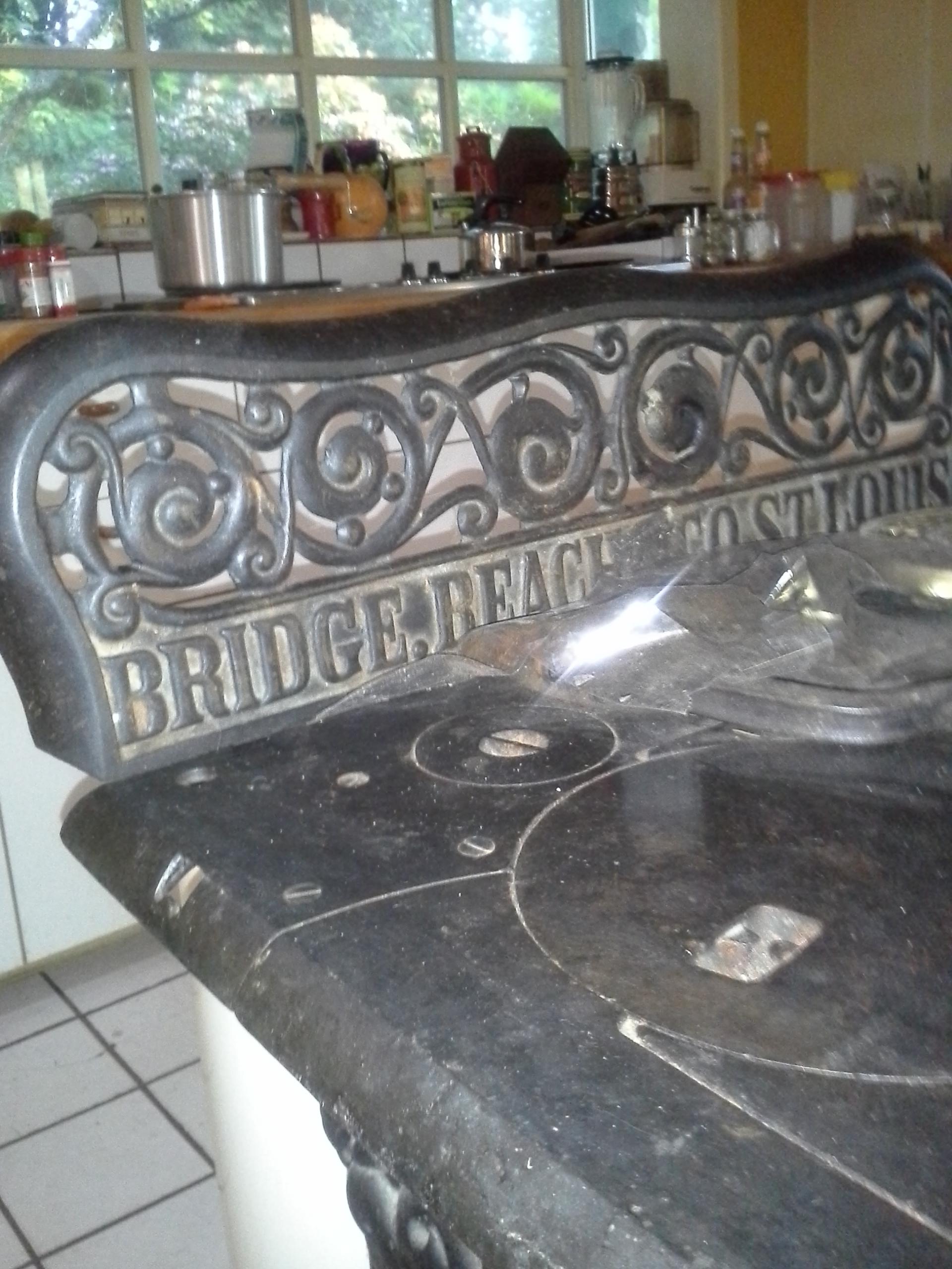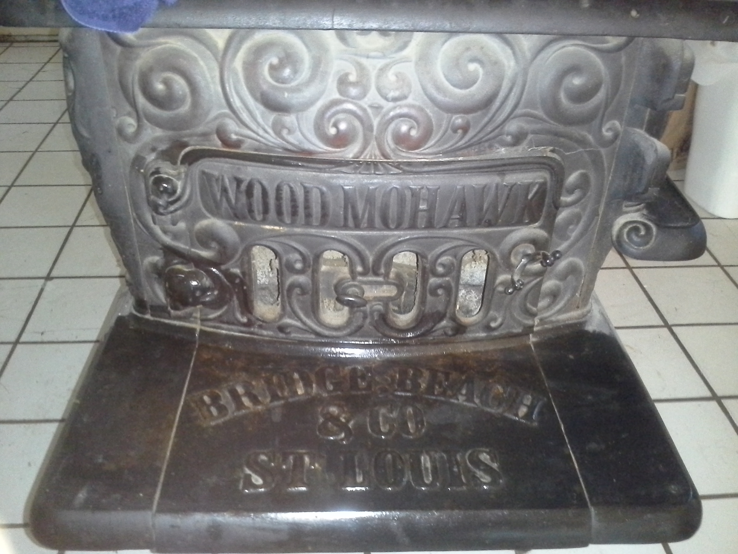 This is a Bridge Beach & Co. wood stove made prior to 1865 in St. Louis "Wood Mohawk" No.48-18