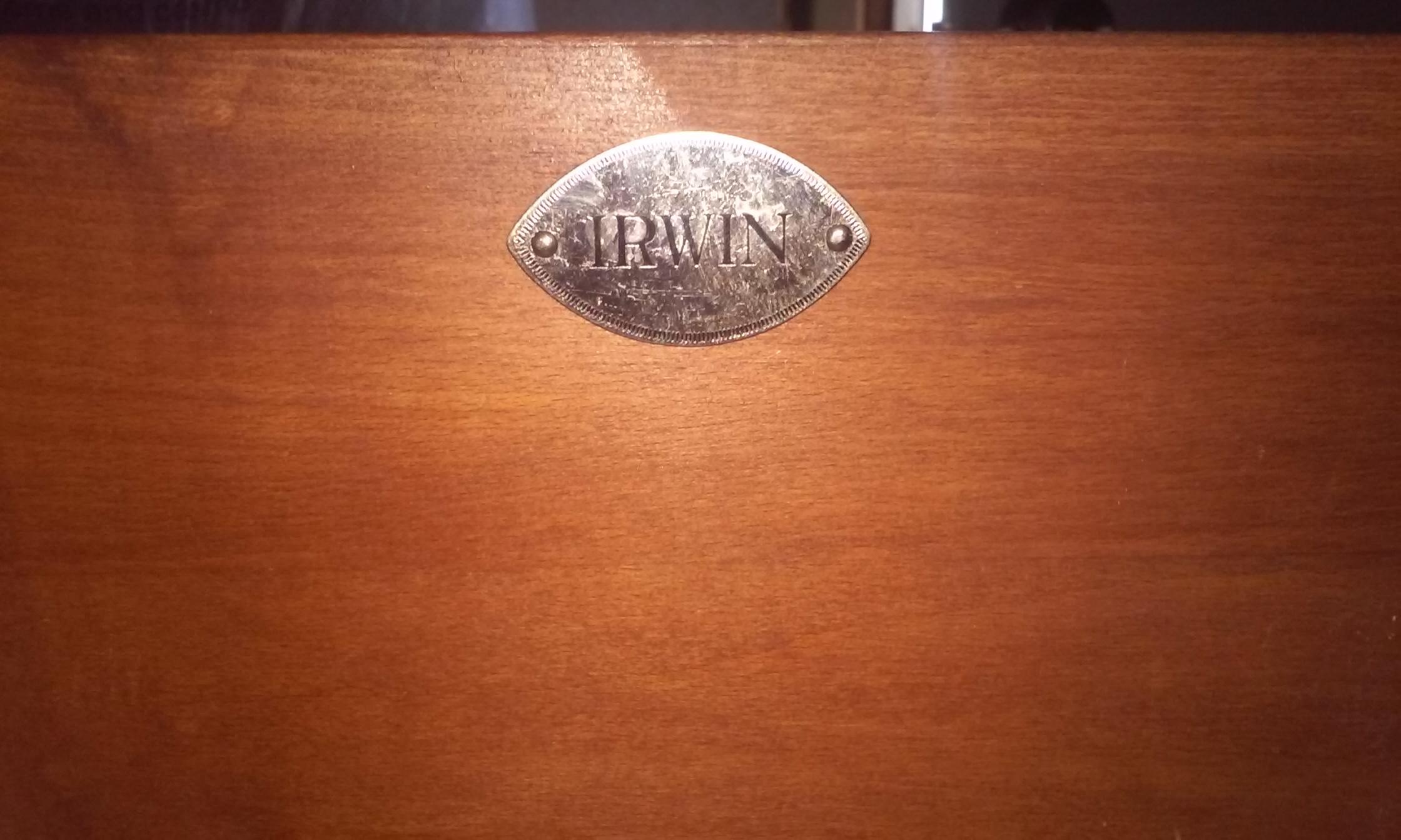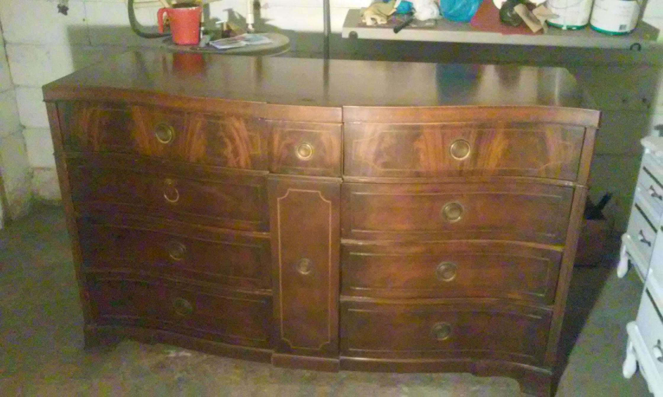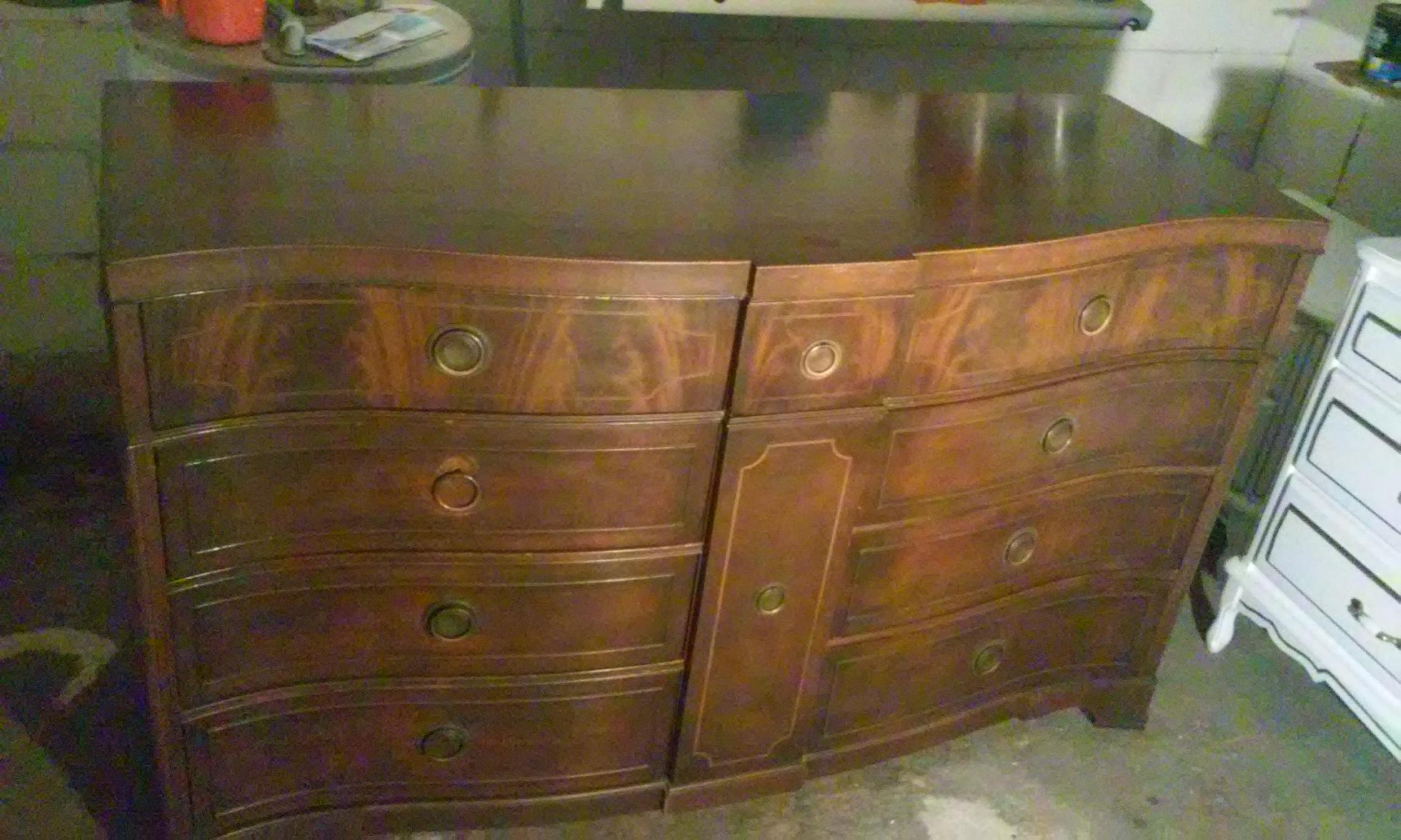 Brown Dresser with round handles, 9 drawers and one door.