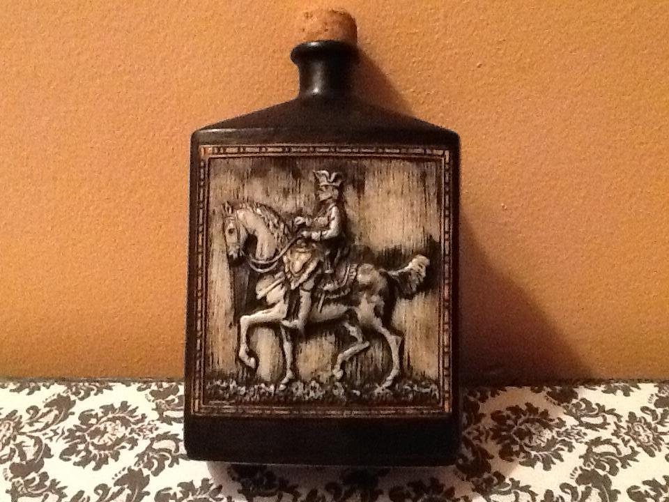 Porcilen or ceramic made in Italy, bottle of wine,black with looks like raised etching or carving of European man on horse, some kind of white stone in back ground. Don't know age, or maker
