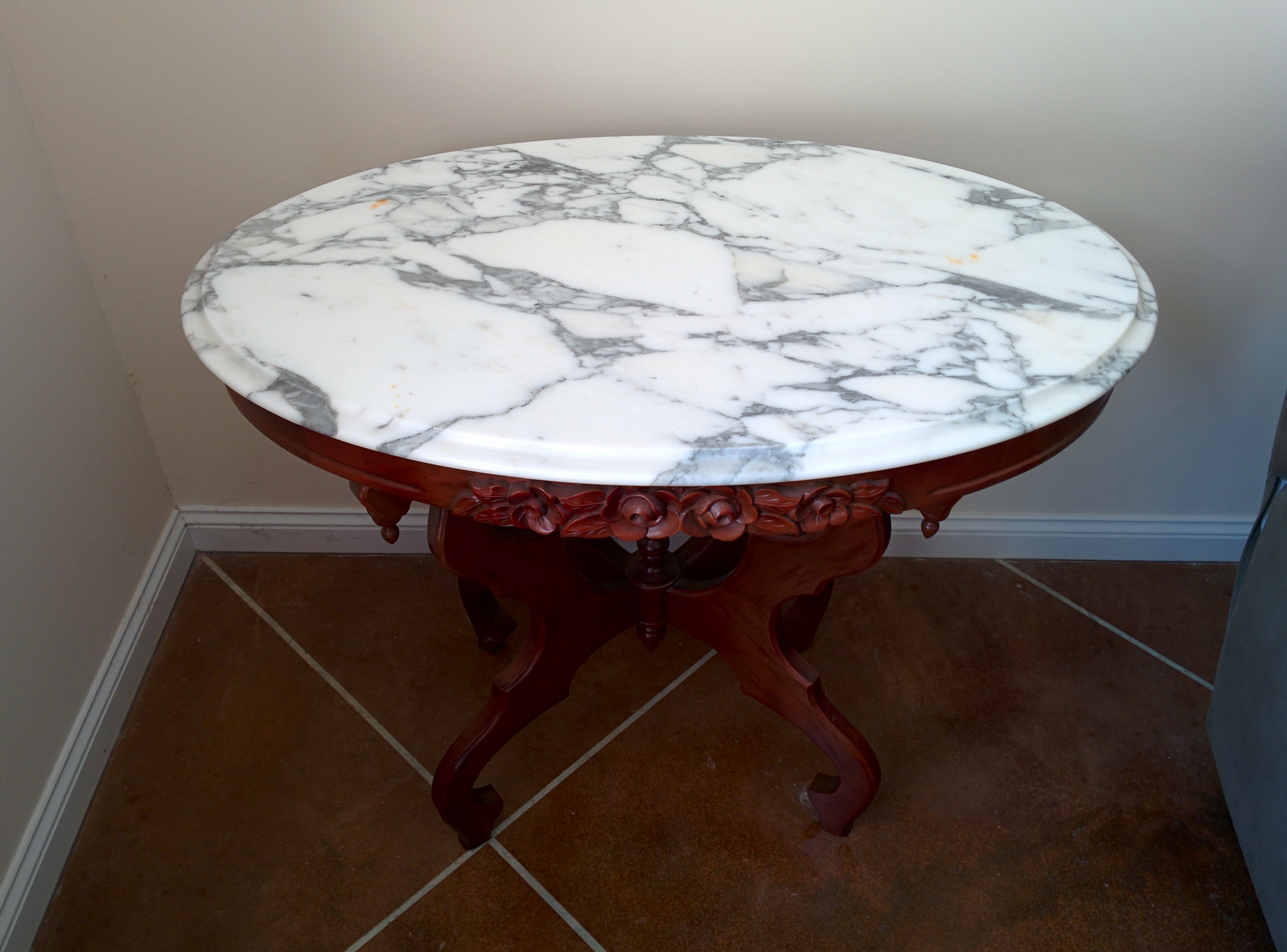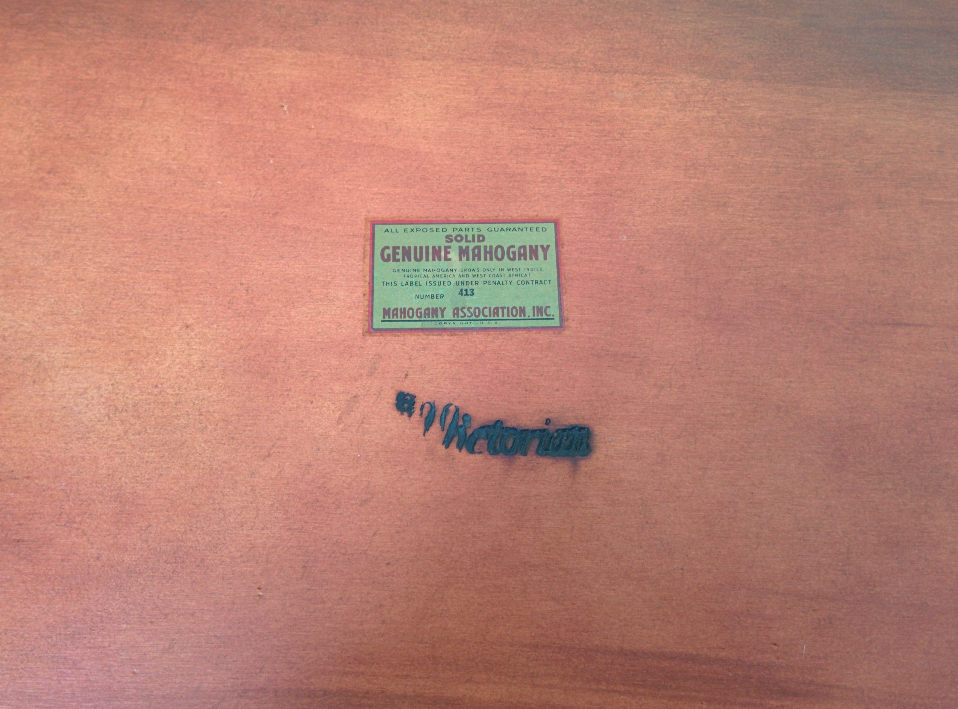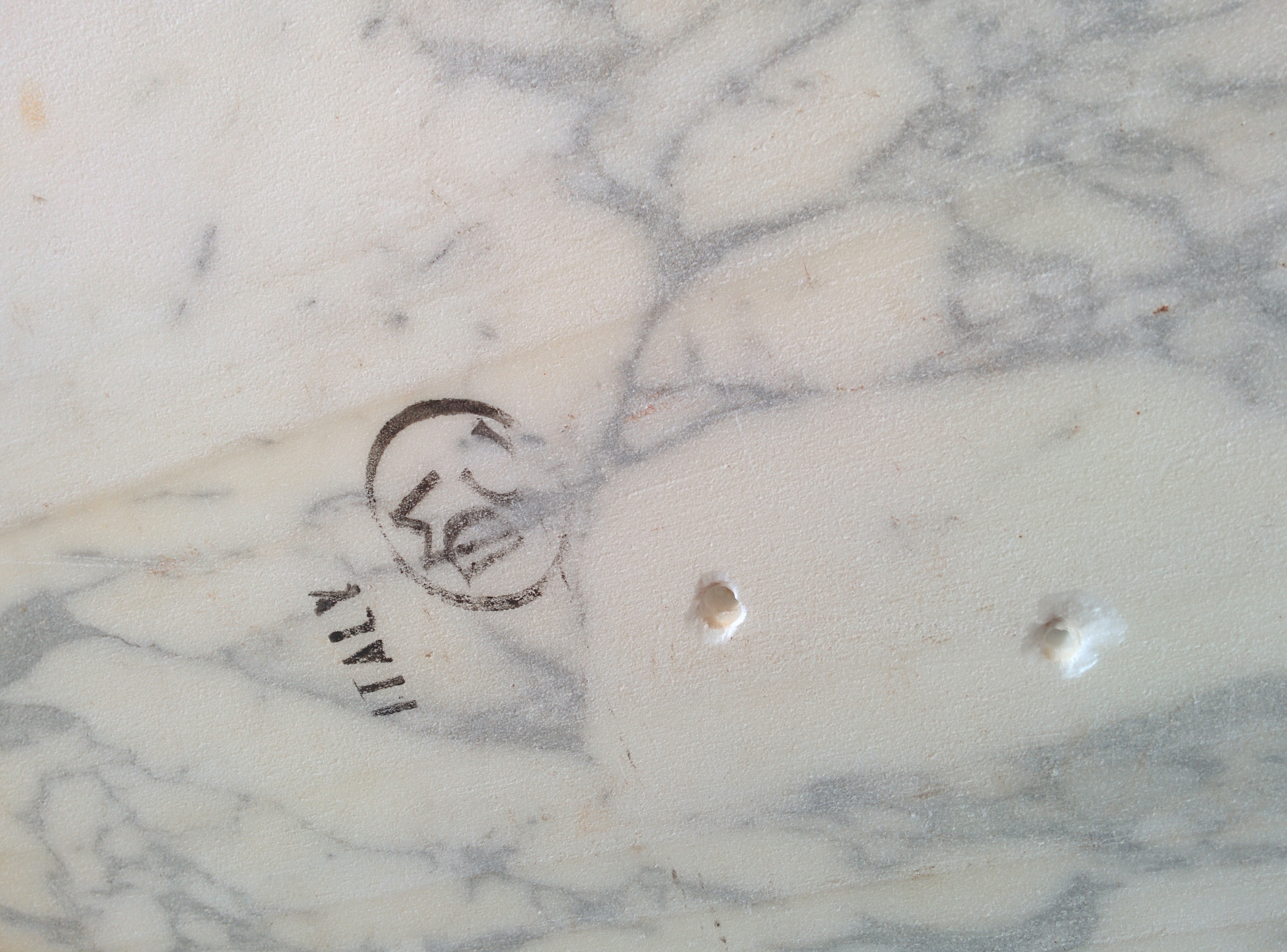 Hey guys, looking for some sort of identification and/or valuation on this table. The marble top is stamped Italy with some sort of (MDC) or (DMC) Hallmark (pictured). The wooden table base is stamped Victorian and labeled with a Mahogany Associations Inc. Number 413 sticker.