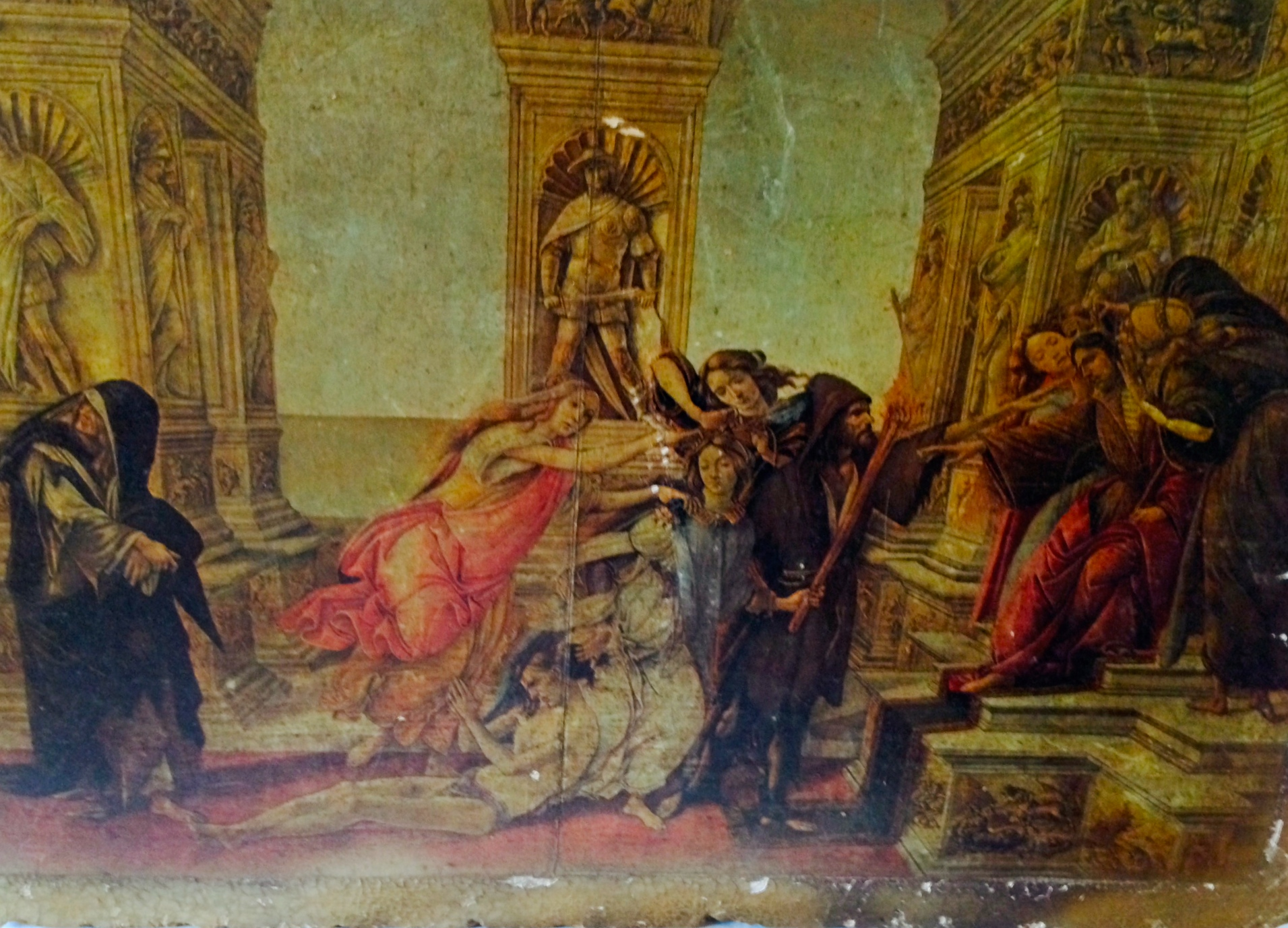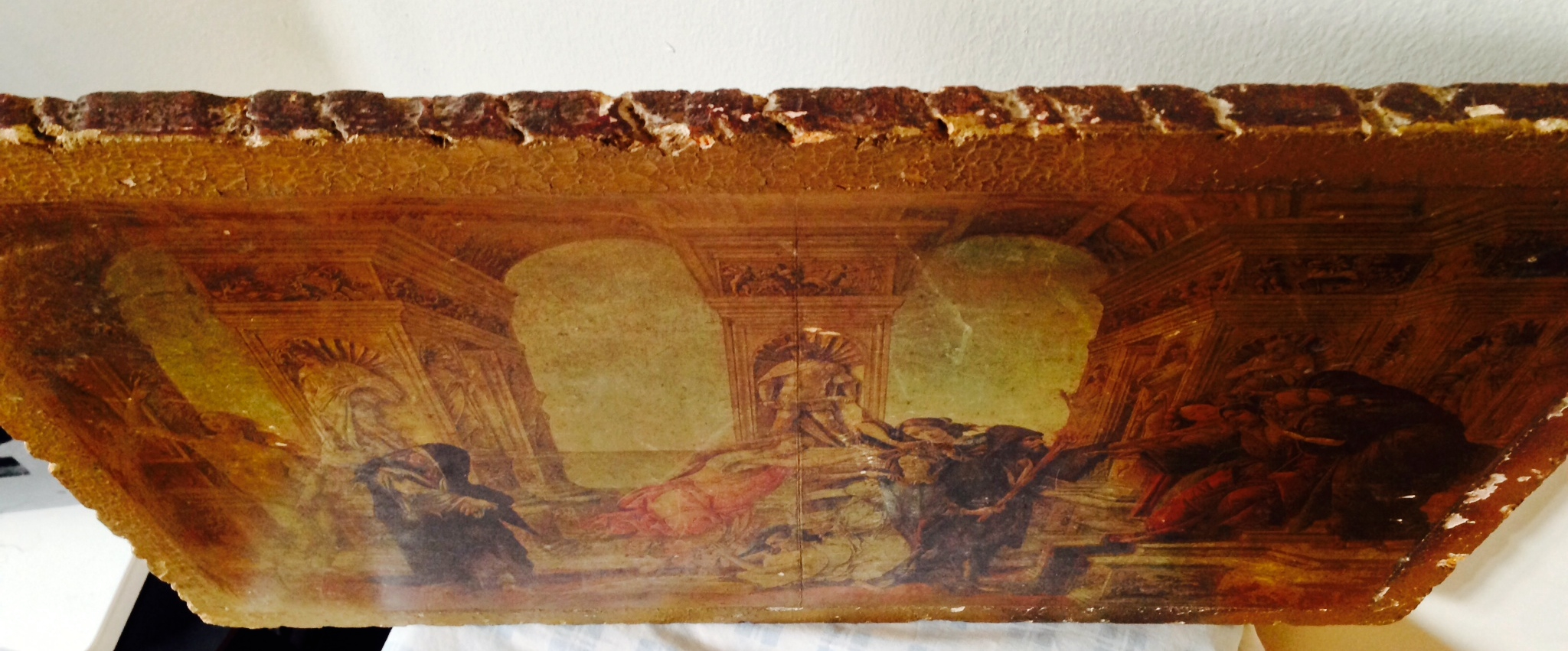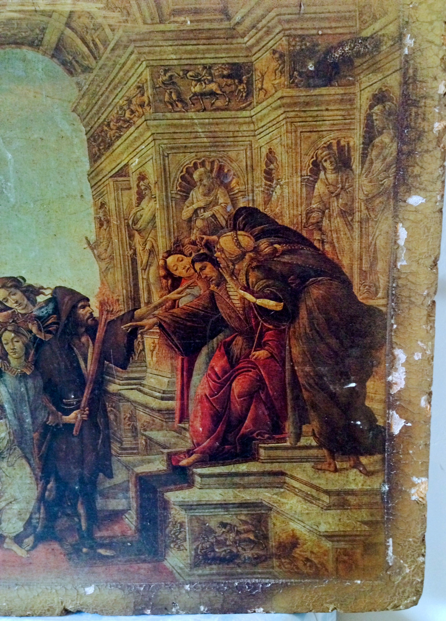 Vintage Antique Antique Italian Renaissance Calumny of Apelles Botticelli Old Print on Wood Probably 17thCentury.The Old print quality is great. Although it has been damged in different parts as you can see in the image, It is really a great art work.