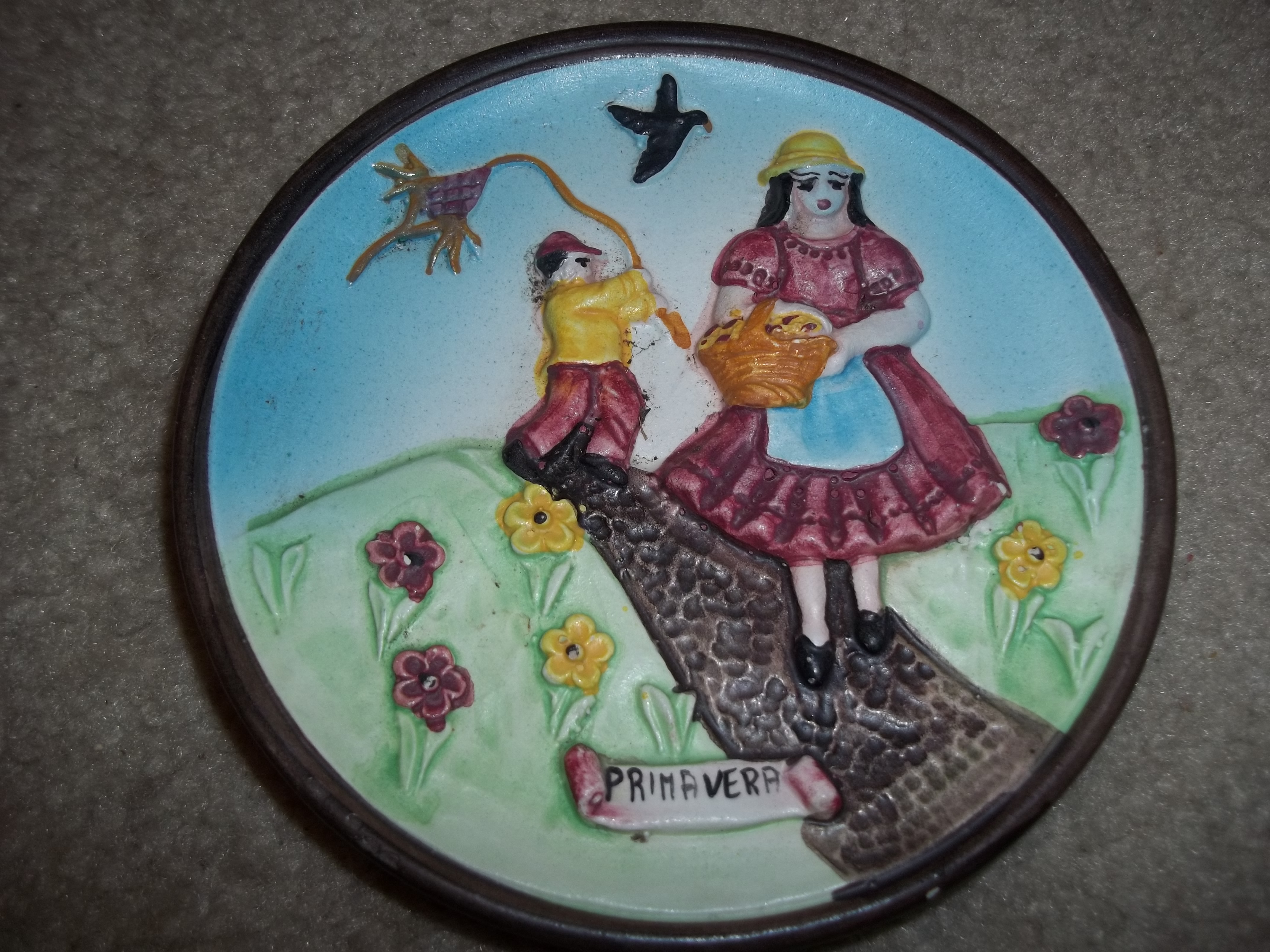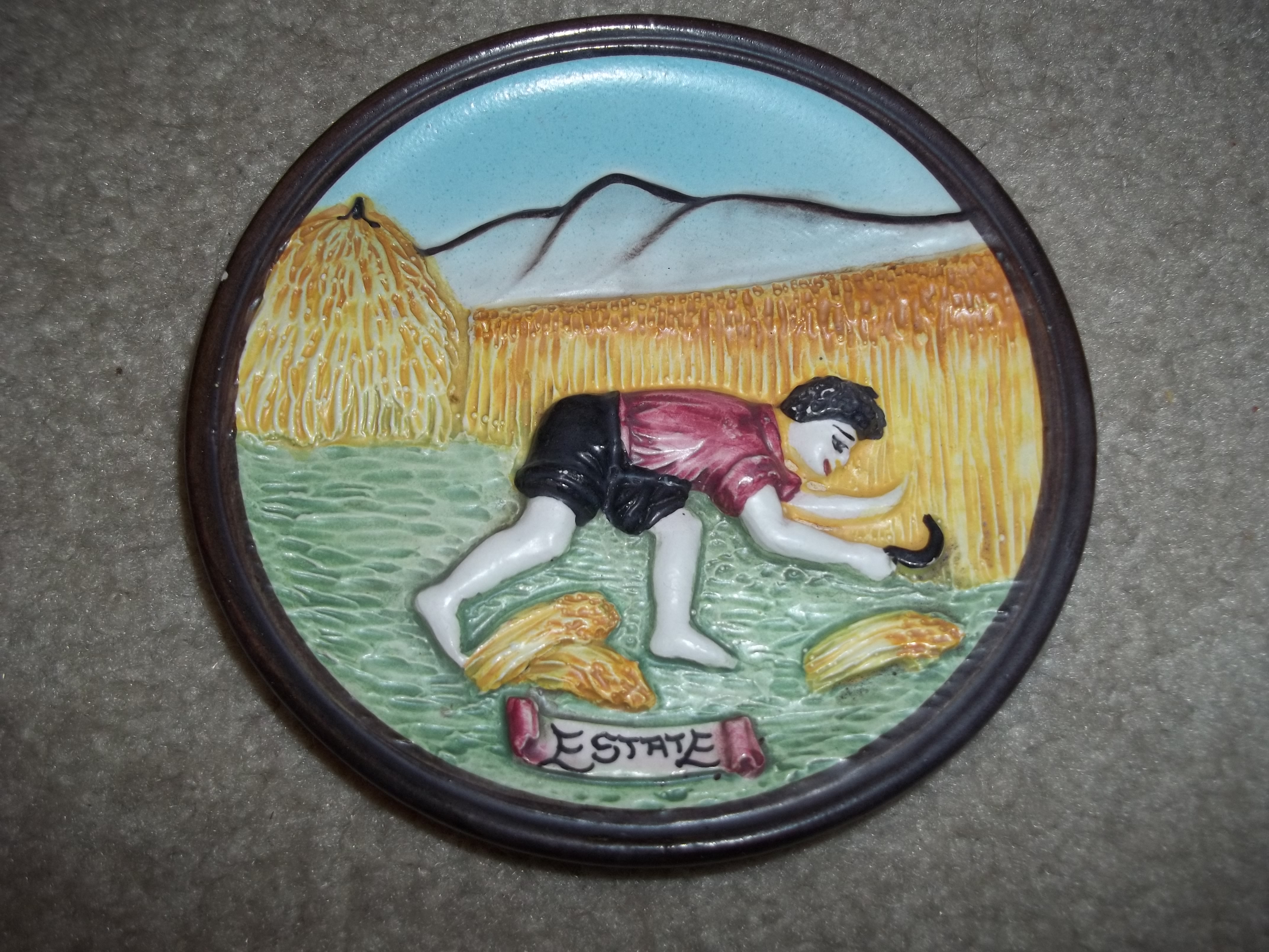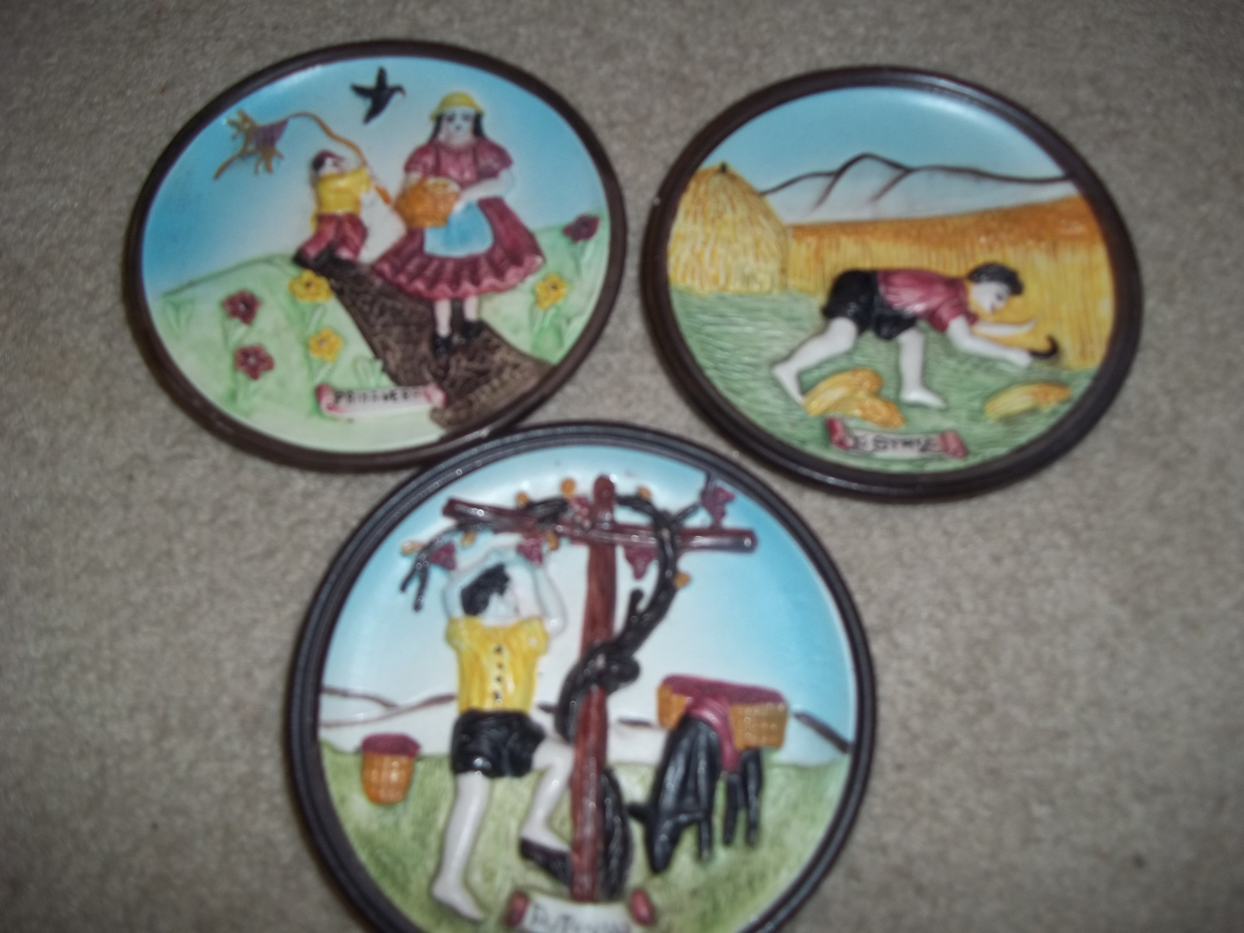 These 3 wall plaques are embossed with the seasons written in italian, don't have the winter one. They have a brown trim around and pastels colors. They seem to be handmade and hand painted. they seem to be rare, can't seem to find them any where on the internet. Thanks