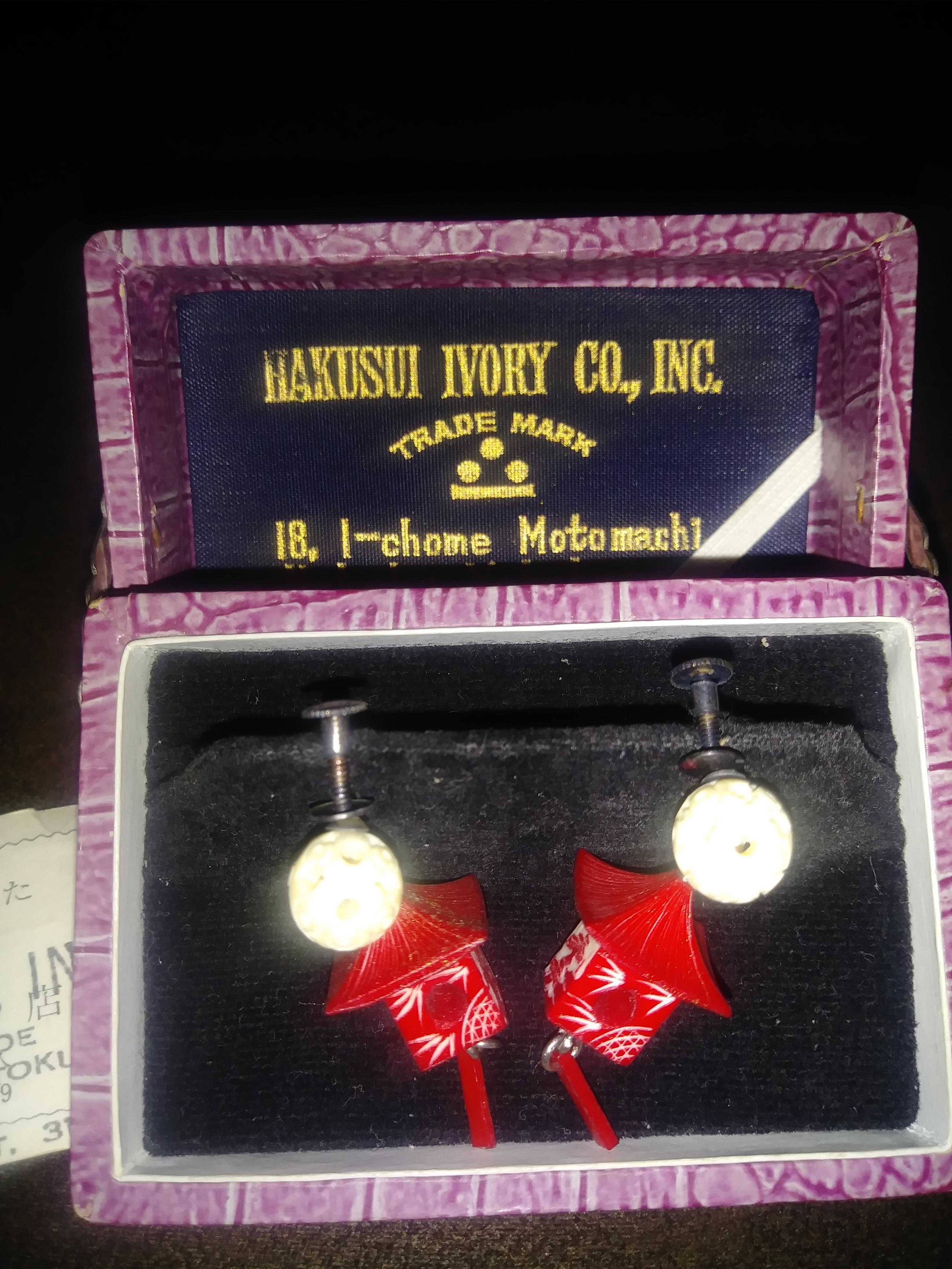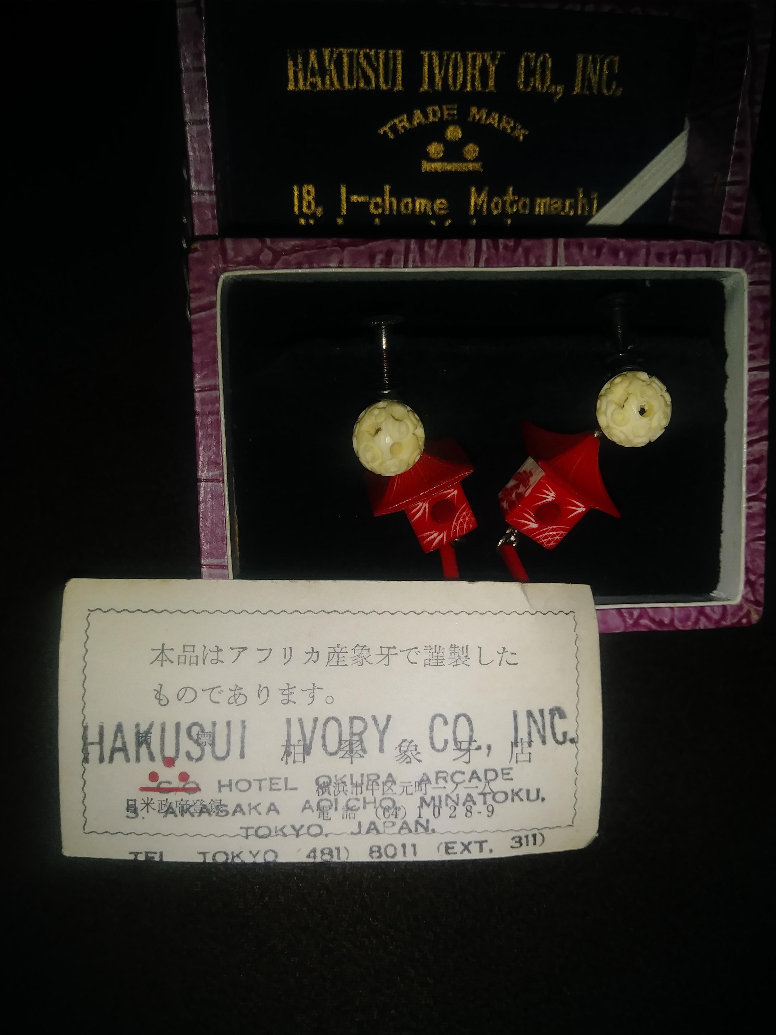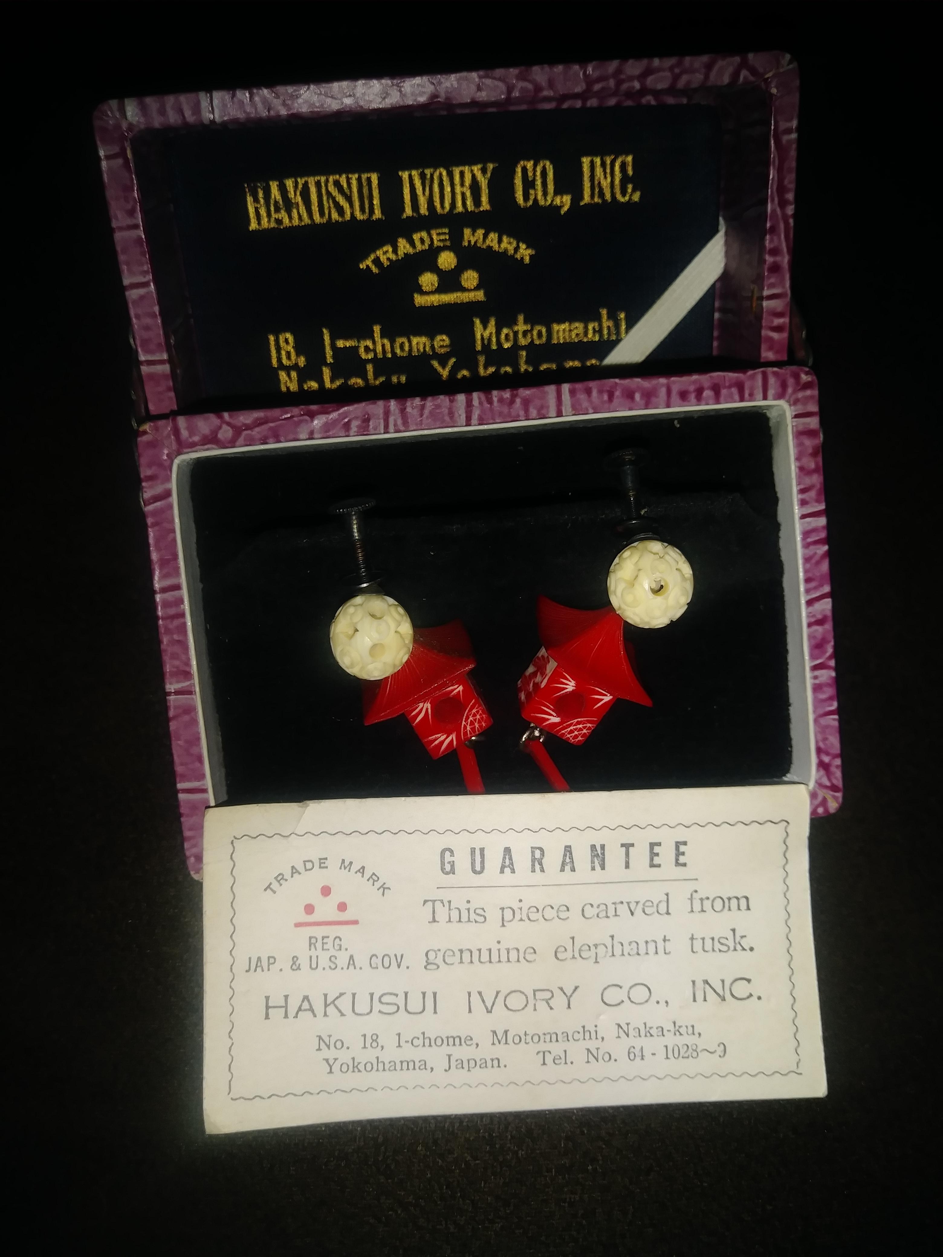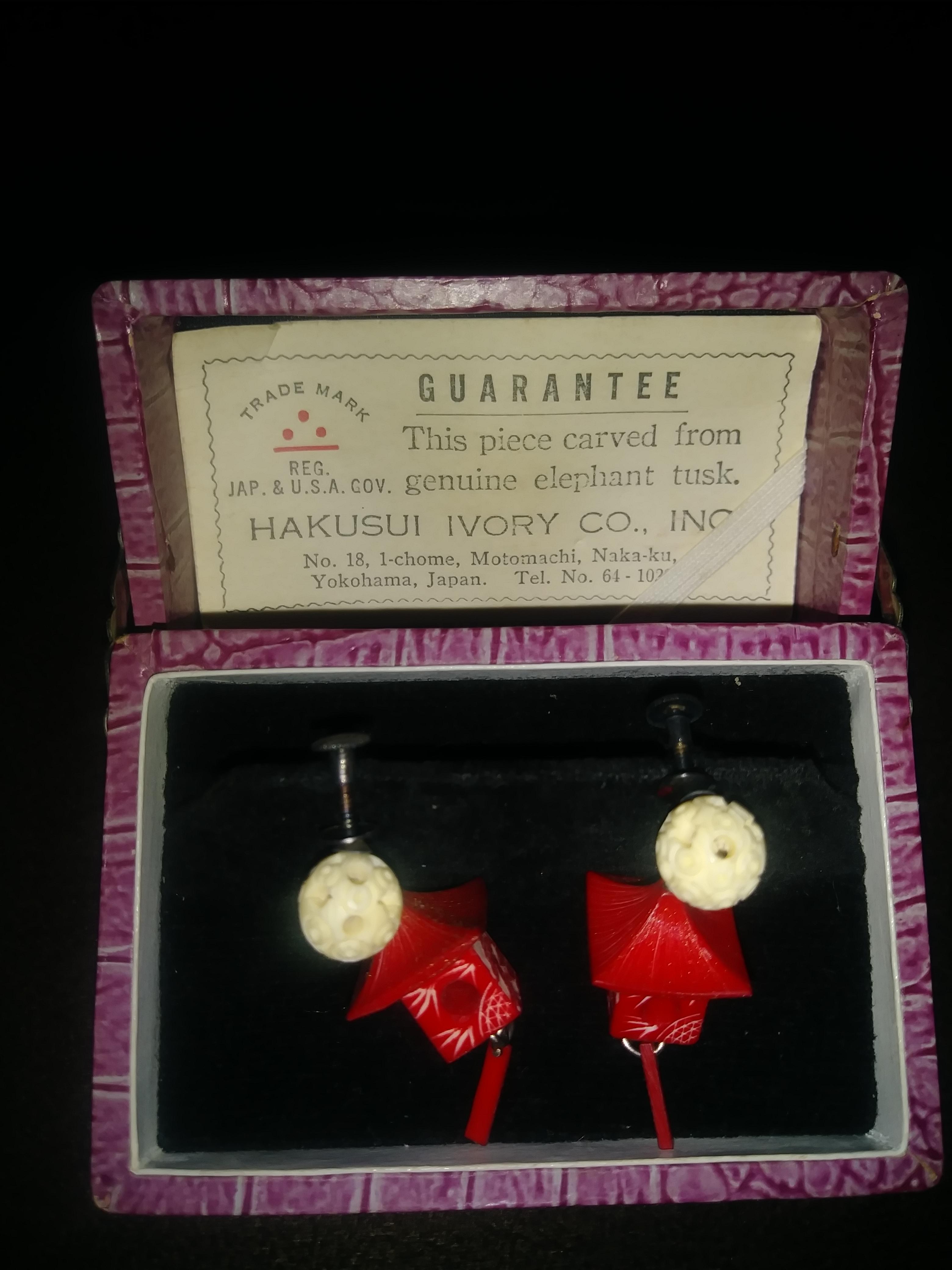 Carved Genuine elephant tusk earrings Hakusui ivory co.inc No.18, 1-chome, Motomachi, Naka-my.Yokohama,Japan