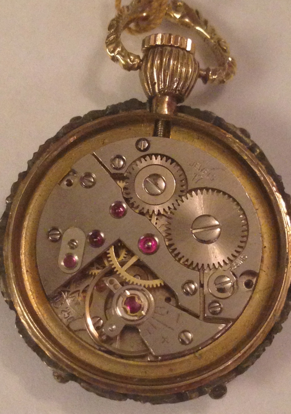 I have an antique pendant pocket watch. It is swiss made with 17 jewels and it also says IWO on the clock face. It is covered with diamonds and rubies and on one side there is a hand painted lady painted on blue enamel. She has two diamonds in her hair. The watch itself I was told is gold under silver but I found another pocket pendant exactly like it on ebay that says its white gold on gold but it also does not have the painted lady on it. I don't know the year or any of the history of the watch but I would just love to know where it came from. The watch is in working condition. it also keeps time. I will also post the link for the similar watch on ebay that is going for $1,200.00.