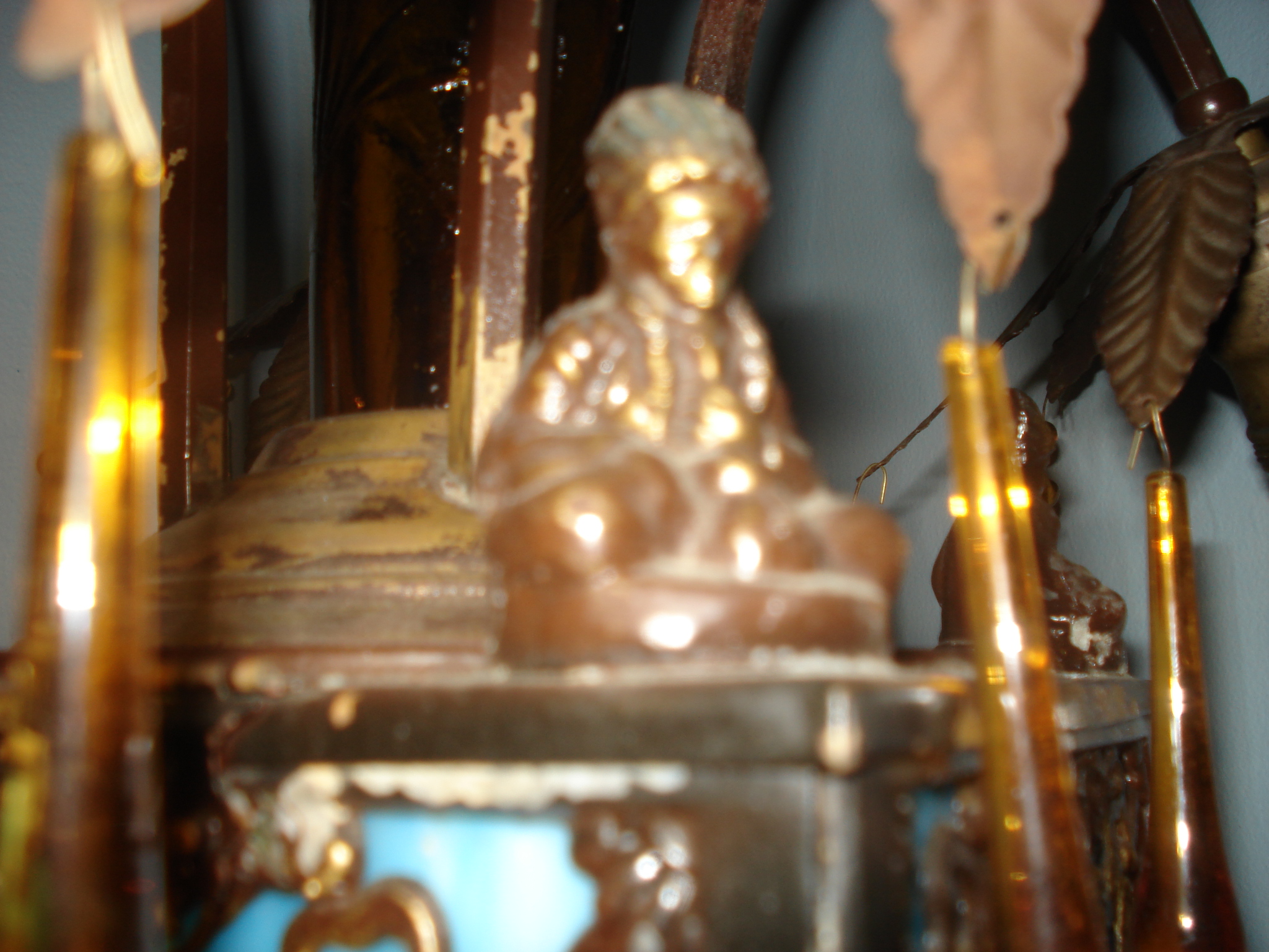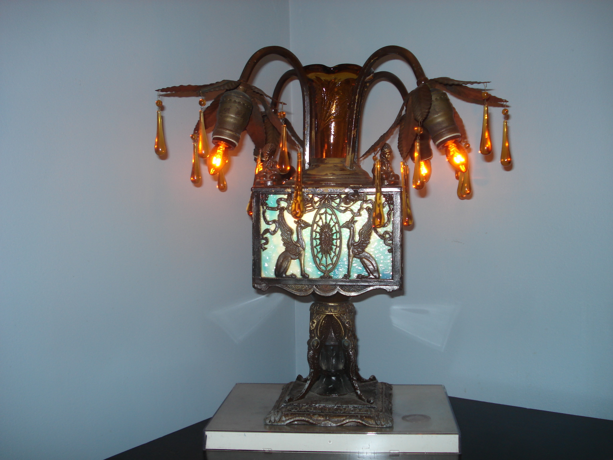 This a lamp that a family friend purchased sometime in the the early 1980's.  My wife recently had the arms brazed as they were beginning to hang low.  And it was rewired.  It was missing some of the amber chandelier crystals.  So, about five or six are new, and the rest were on the lamp when we got it.  I belive it has jade in it.