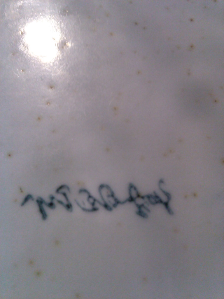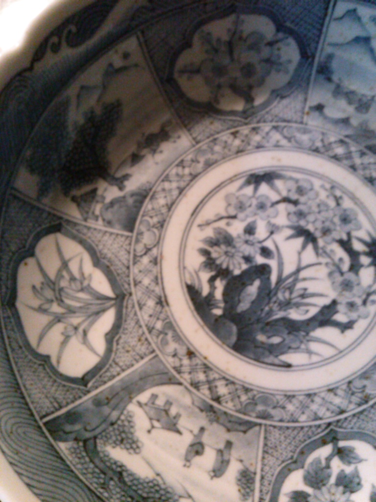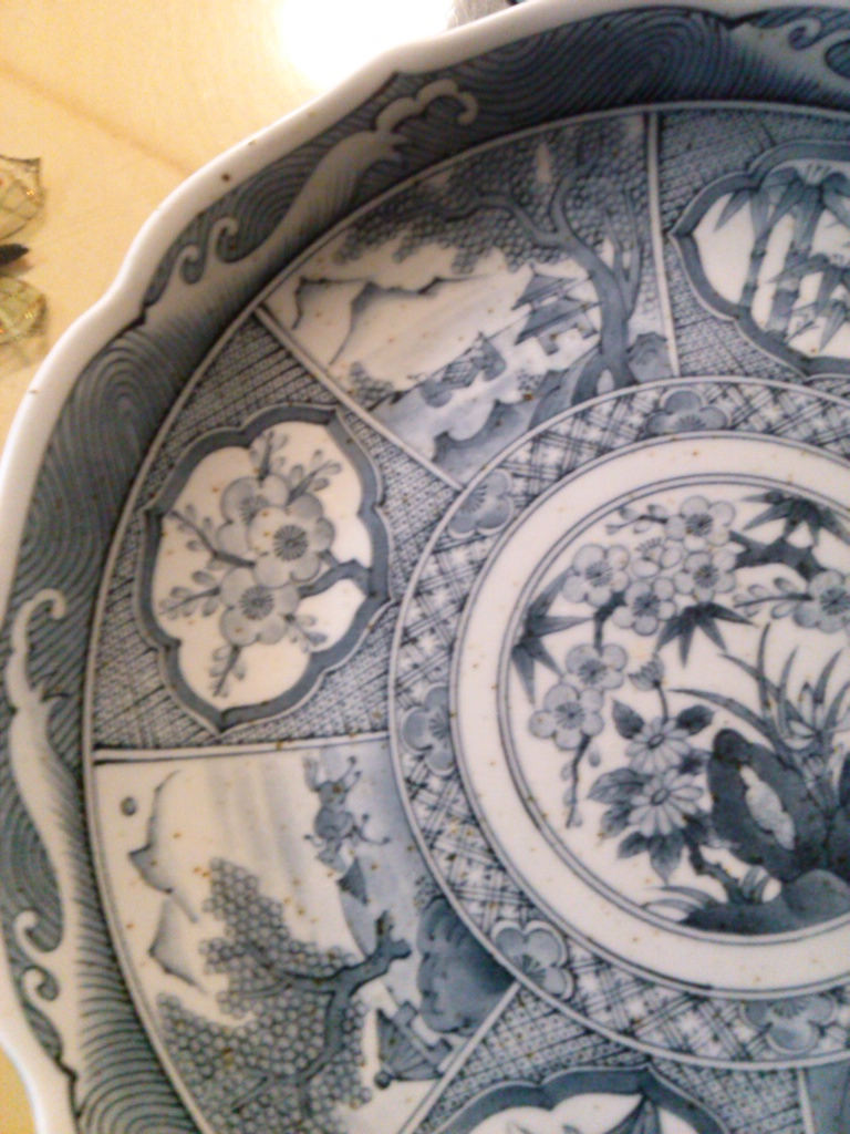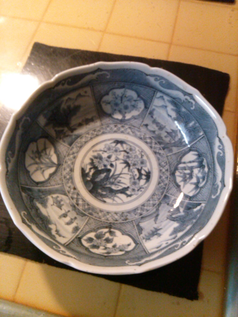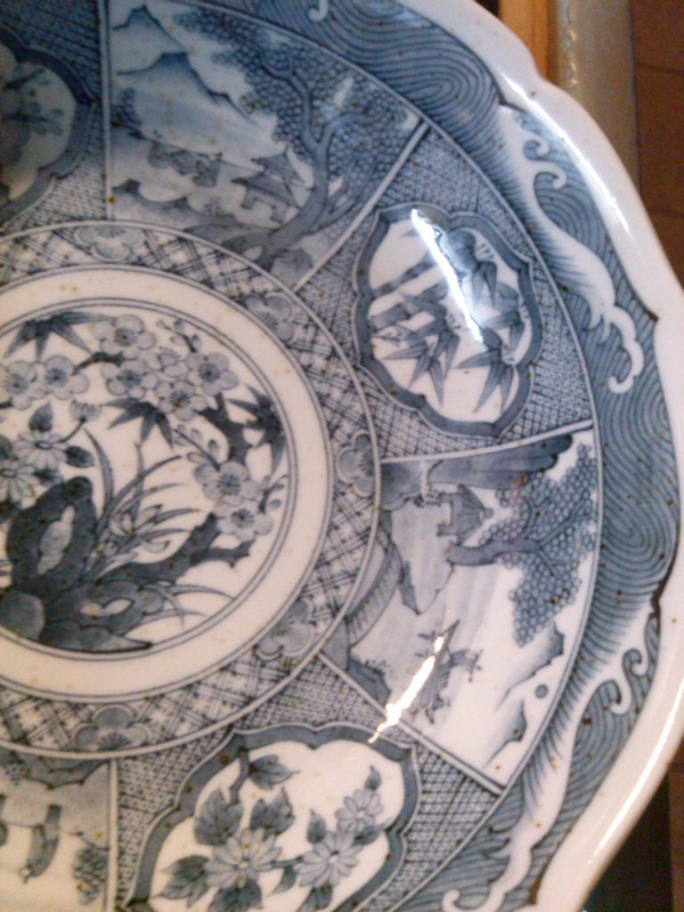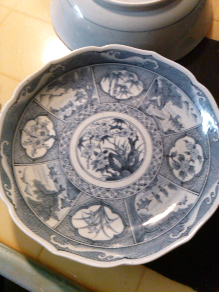 My husband's father gave us these for free today. I have looked online endlessly for at least 5+ hours. I would like to know what they are, where and when produced, and the price. I collect blue and white dishes. I want to know so I can display appropriately. They are quite heavy. They have tiny brown specks in the material. I don't know what that means. It is not dirty. It is all over in the actual material it's made of. The signature on the bottom is hard to read. I couldn't find a match for them either. Also it is accompanied by a made in Japan sticker. The plates measure 10 inches, the side depth is about an inch. Like large saucer or salad plate. The bowl measures 10 inches, the depth is 2 1/2 to 3 inches. The finish is not smooth. Appears hand glazed. Any help would be appreciated. Thank you so very much in advance for any info.