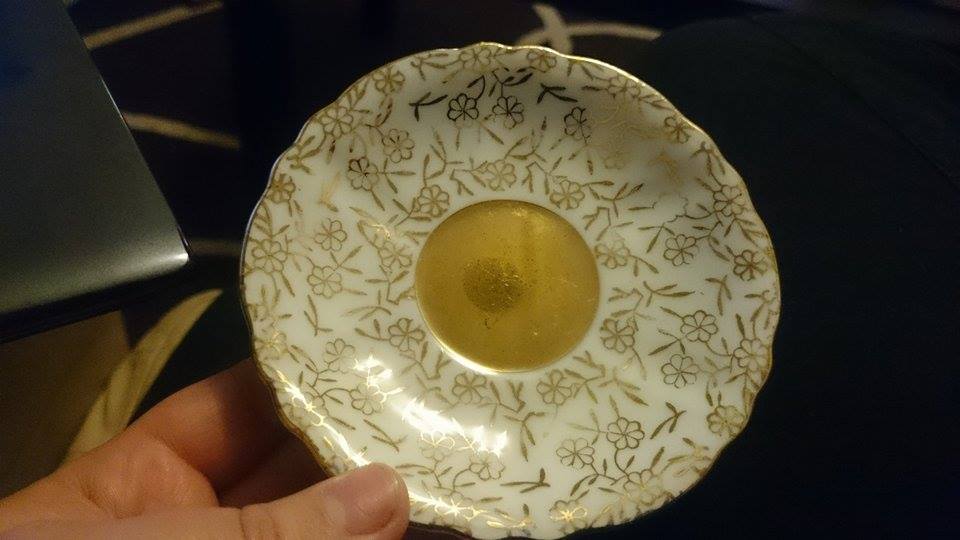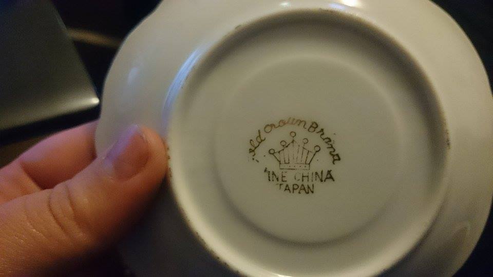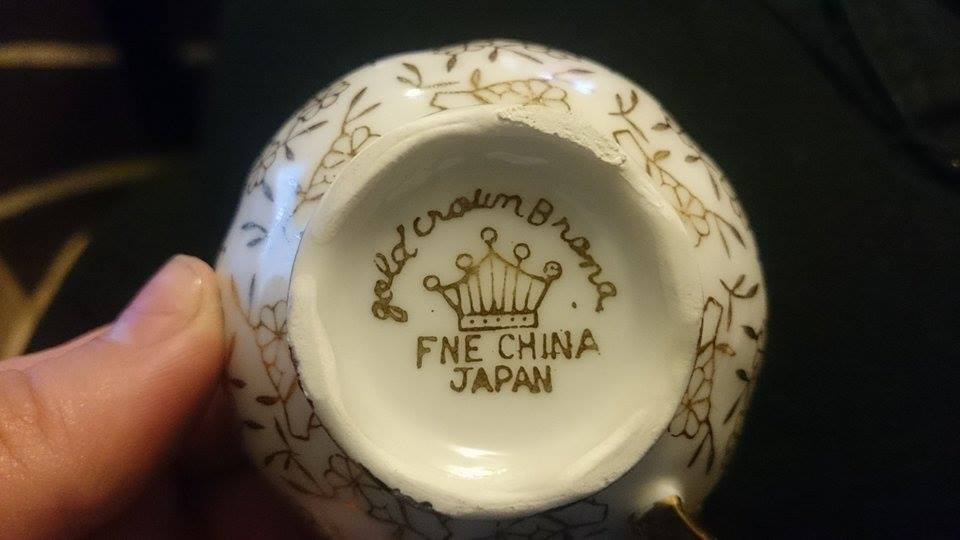 "Gold Crown Brand" and "Fine China Japan" written on bottom of items
