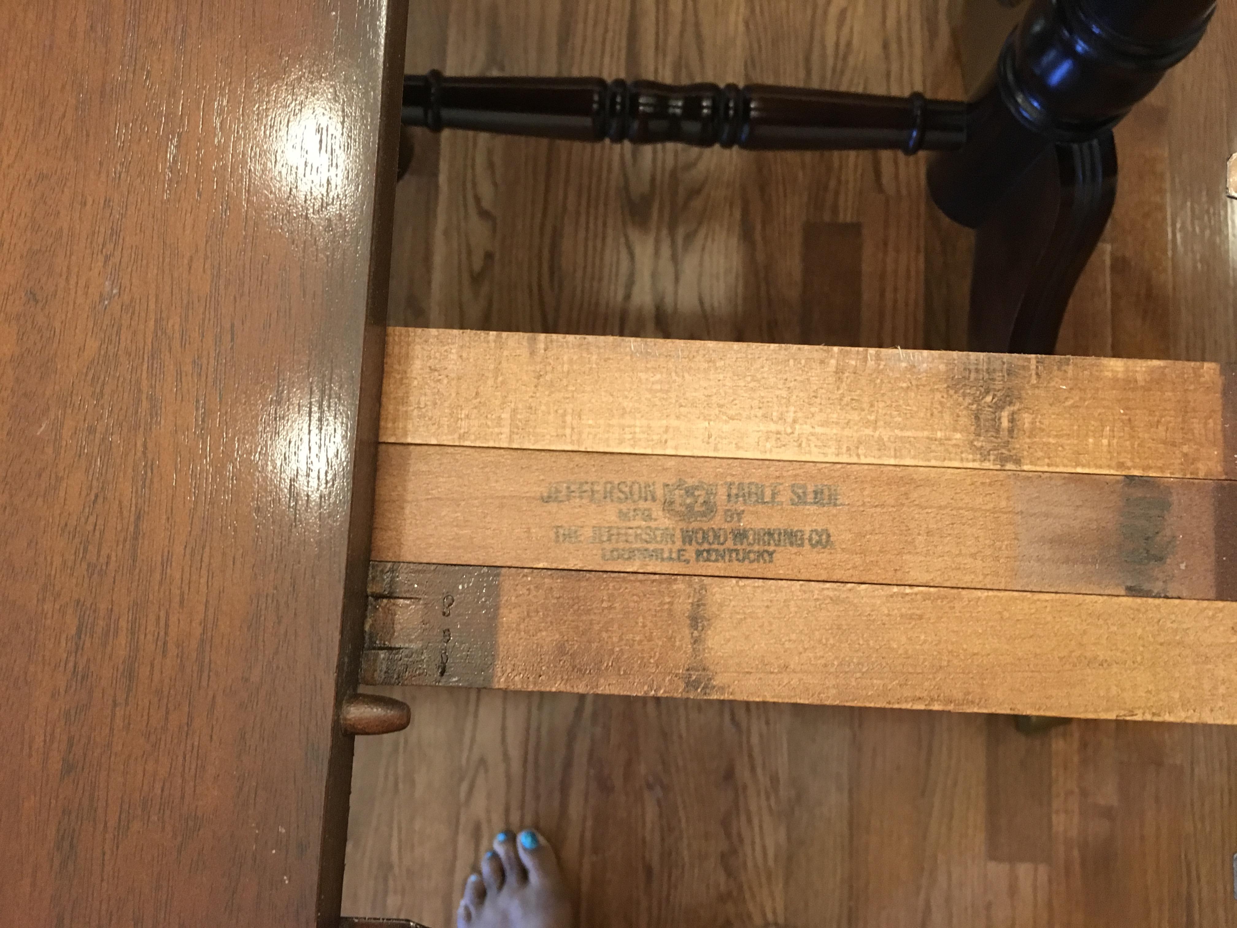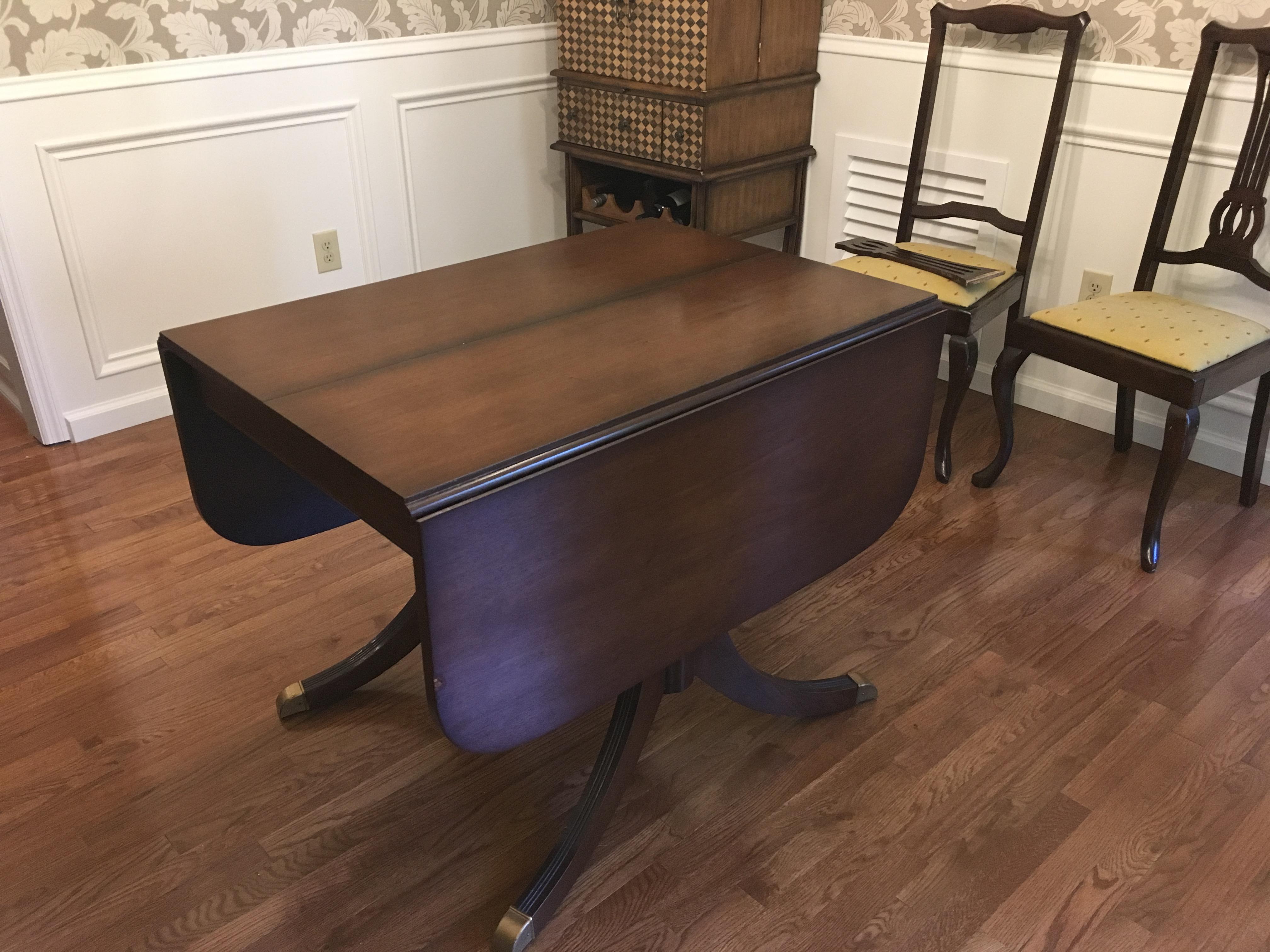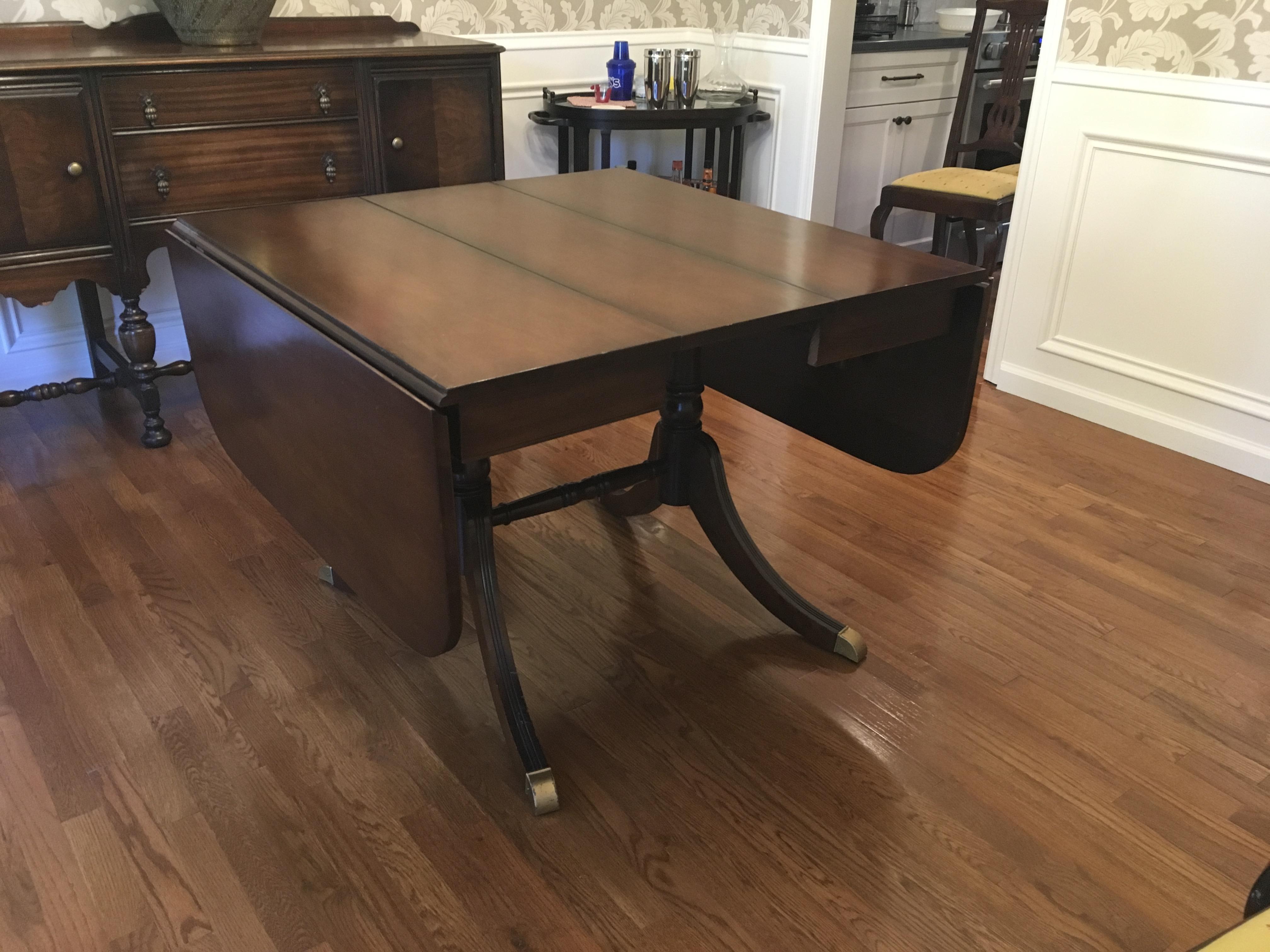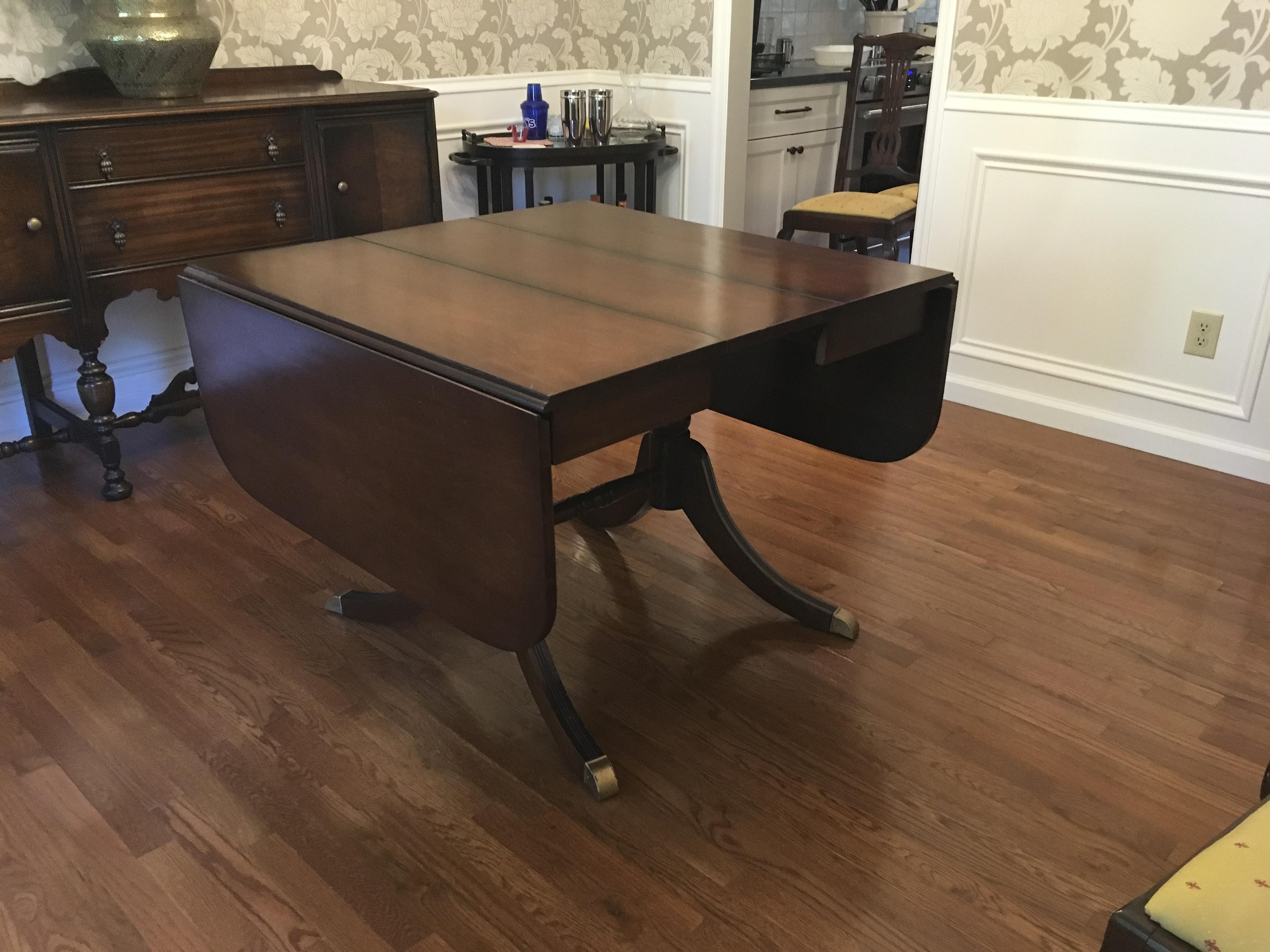 Jefferson ez pull drop leaf table with one leaf. Can seat up to six, four or two. Was refinished by me. Has a pull ring to open table to remove or insert leaf.