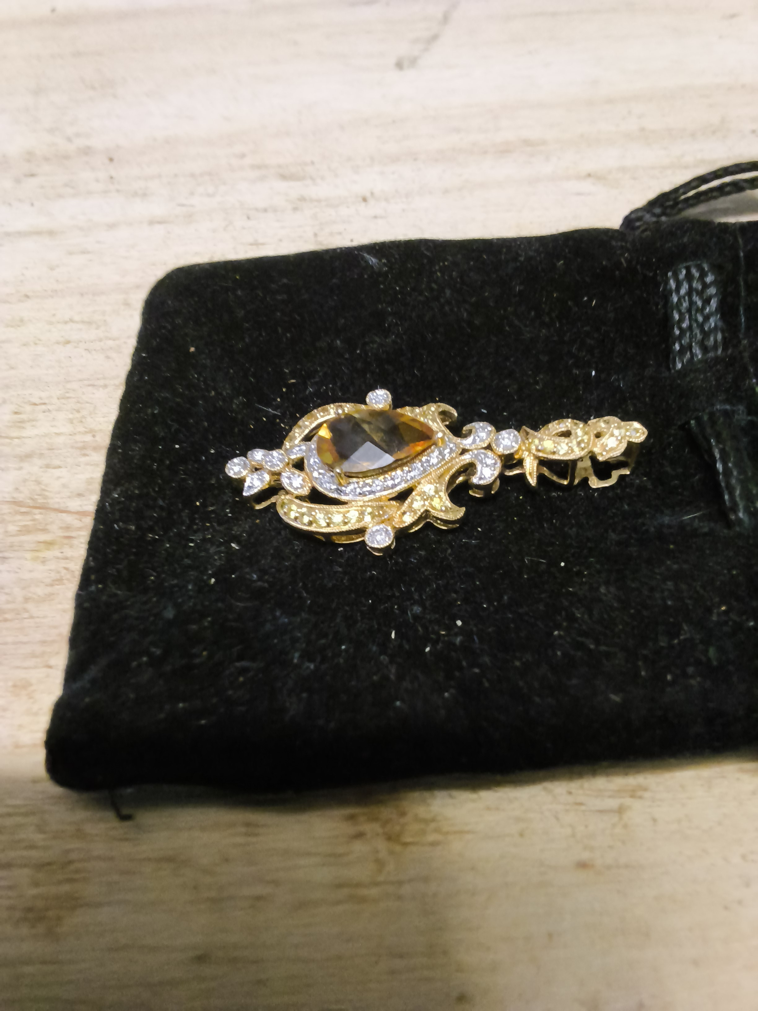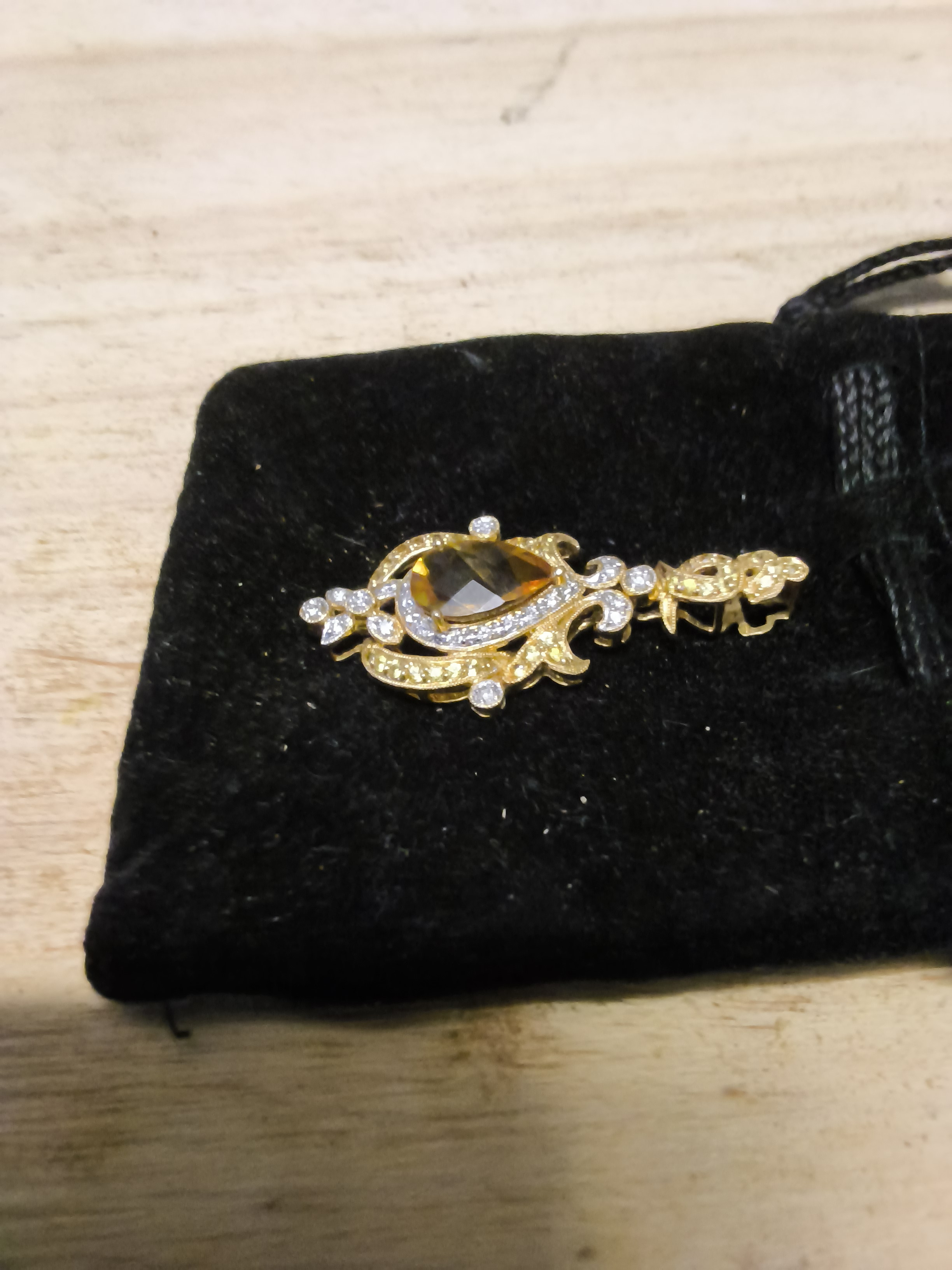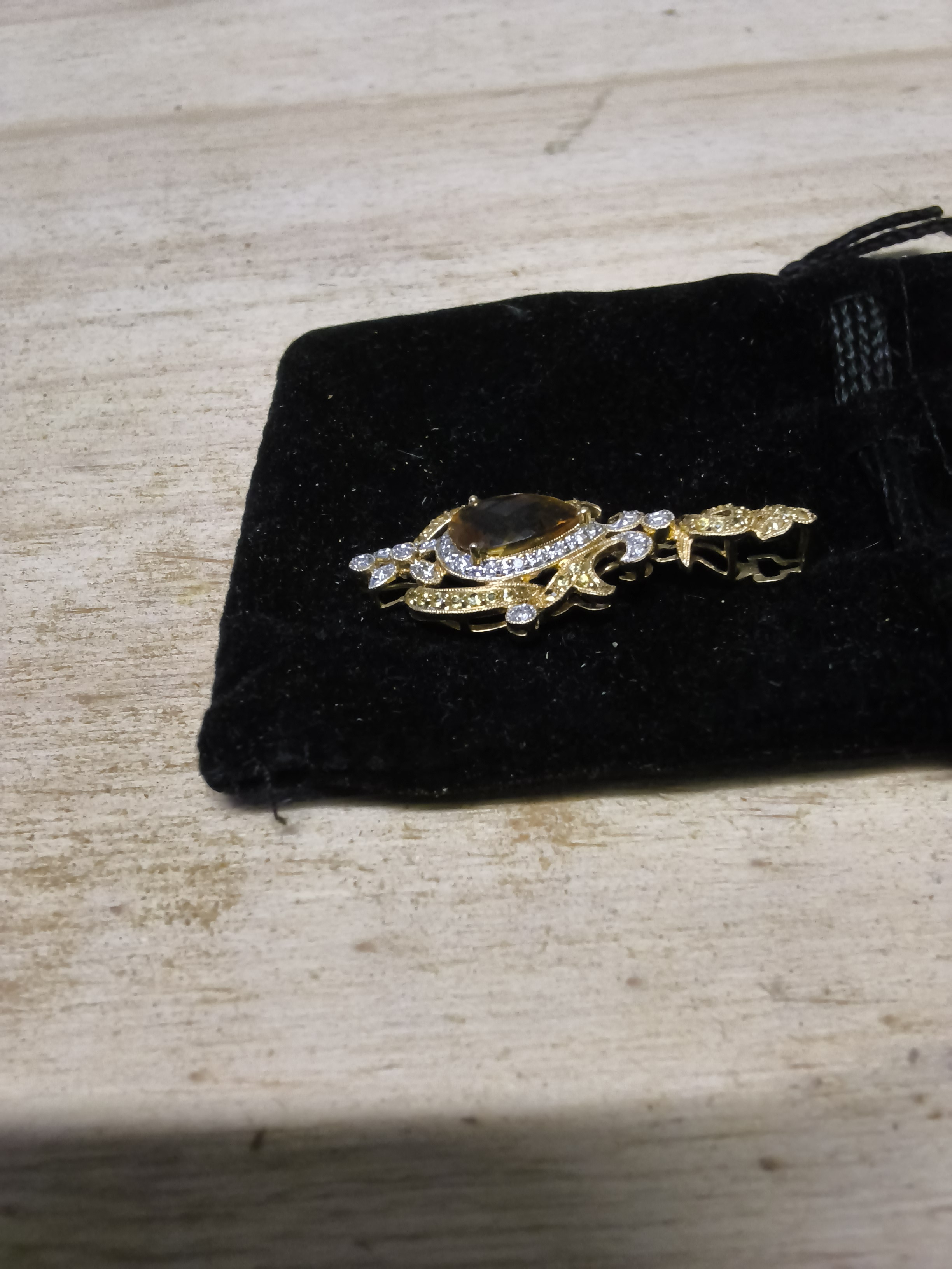 Description Possible early european lower drop broch from 2 or 3 peice necklace / broach or head weare in 18 k , large yellow center pear / tear drop stone , Overall desighn looks like royaly coat of arm's ??? ..