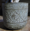 This is a very interesting item, it's hard to put it down when you start to look at it there is lots of designs on it but I don't know what they are, it's bronze lots of patina all over it and about 10" tall and about 7" wide it stand very study on these three legs and a dragon head on the handle, i got it for only two bucks because we all was thinking it was some old farming tool and we didn't know what it was so they just wanted to get rid of it I knew it looked interesting so I got it and took it home and put it in the storage shed moved it around for a couple of years until I seen the show "The Antique Road Show" and they had one on the show and it looked just like this ons.