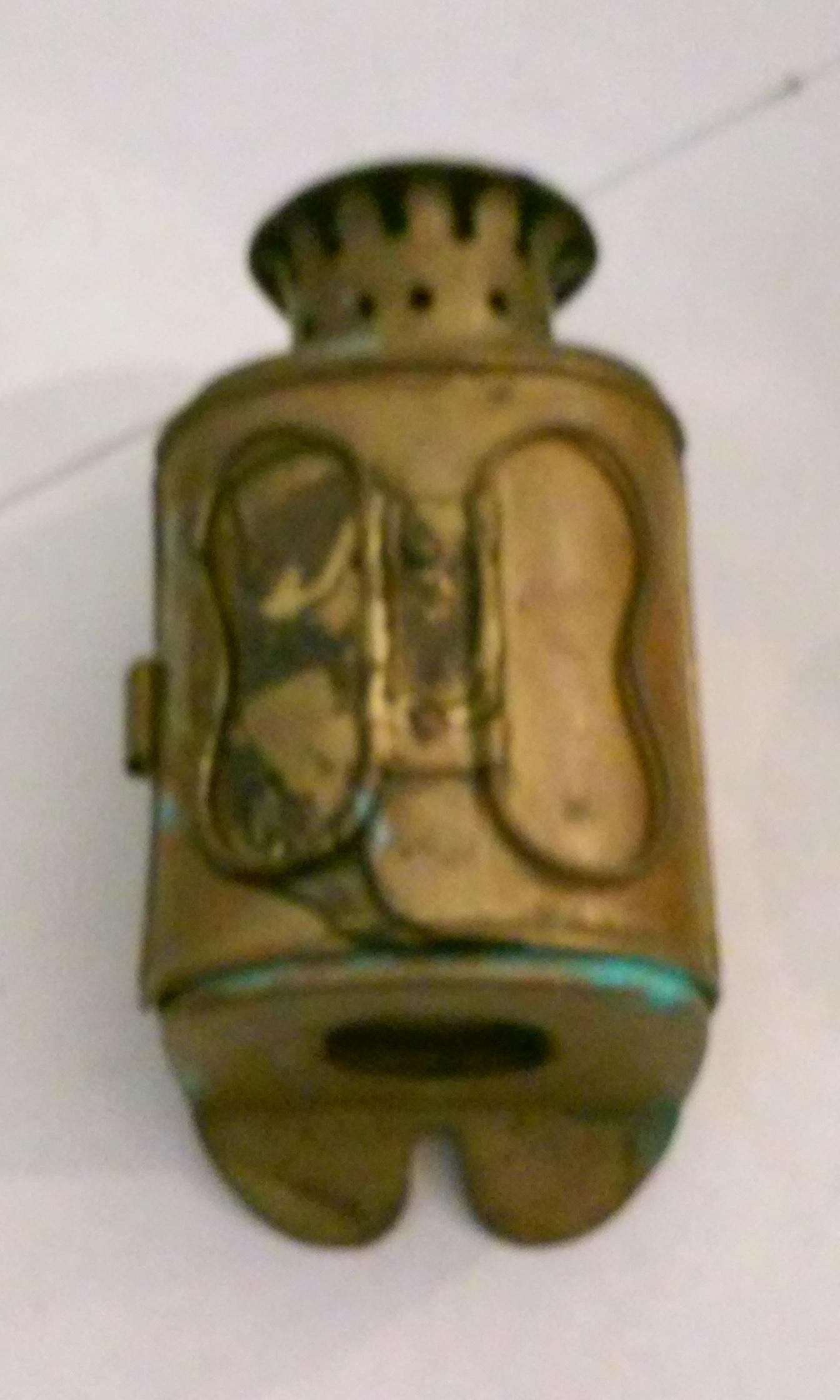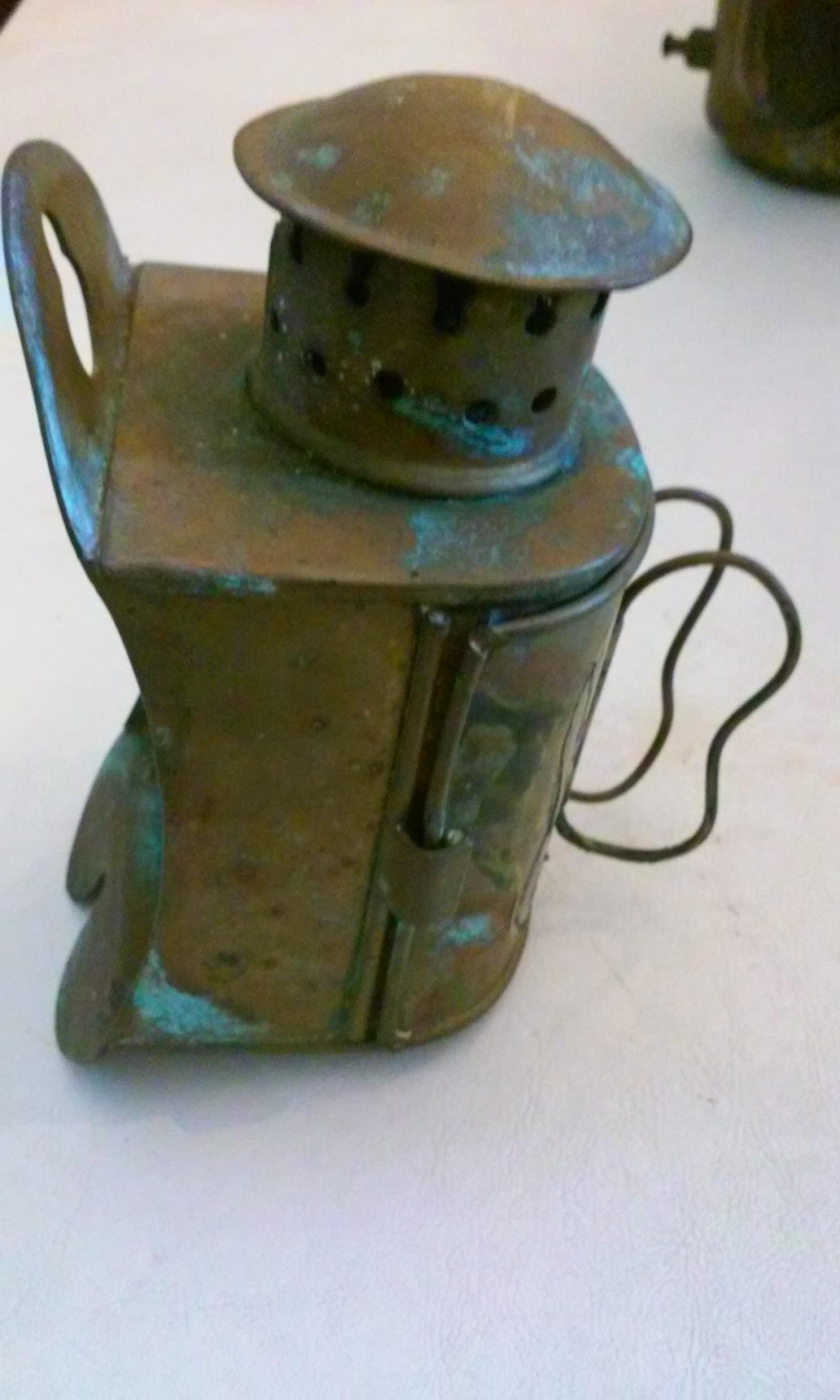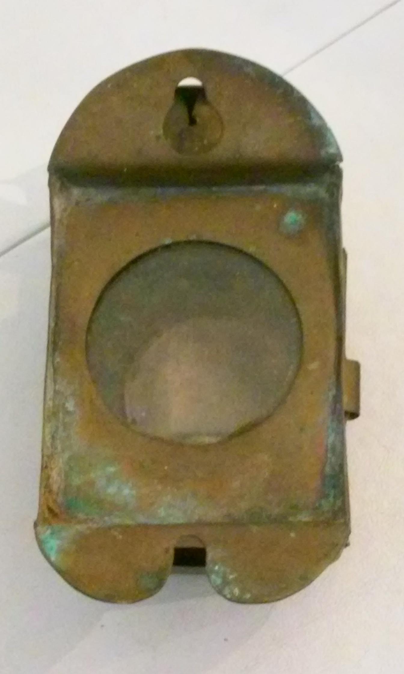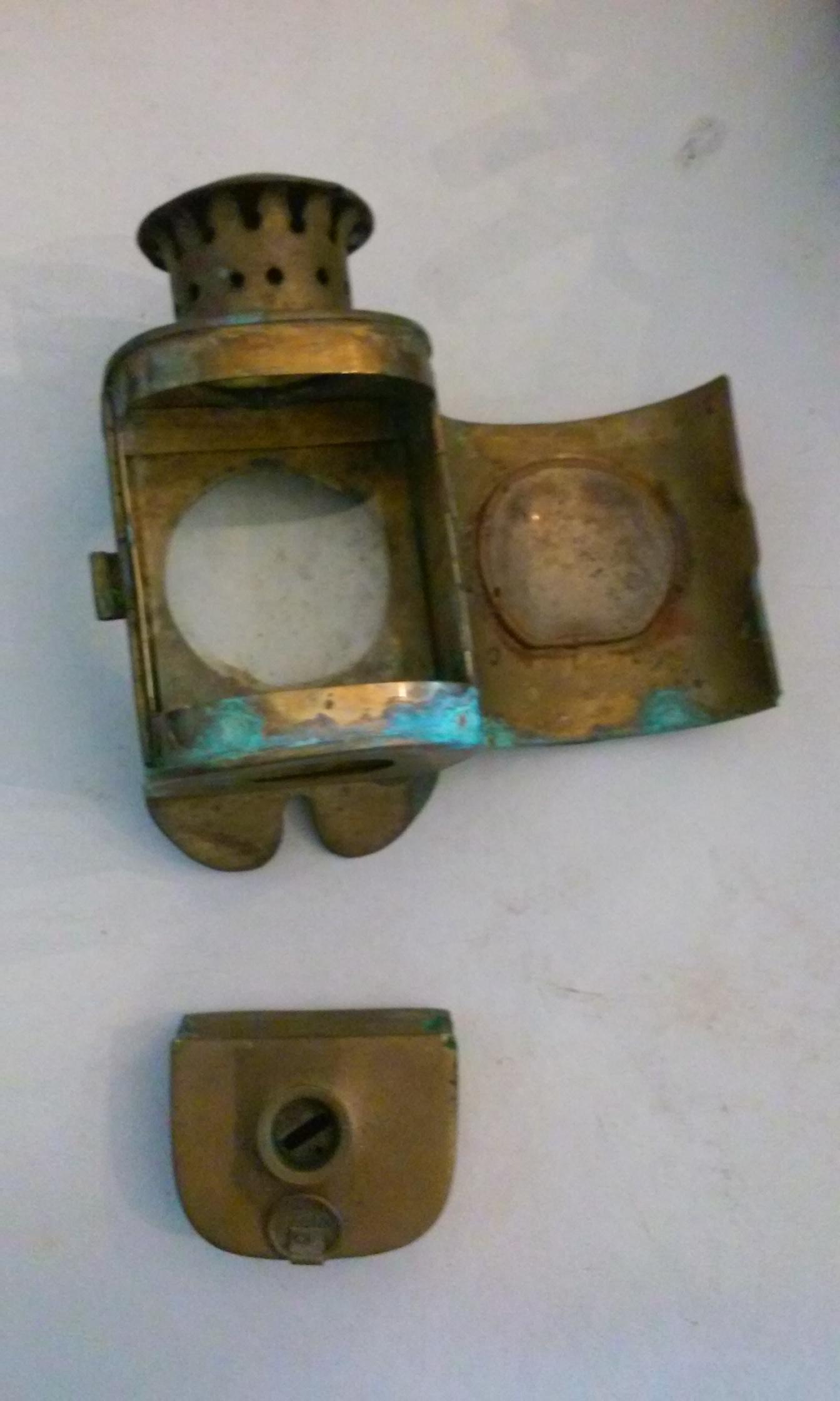 I beliebe it to be from the mid to late 1800's its made of brass the back door has two hooks on it i believe to put on a helmet or a belt i also believe that because of the hole at the bottom of it that it can be used with a candle also instead of kerosene