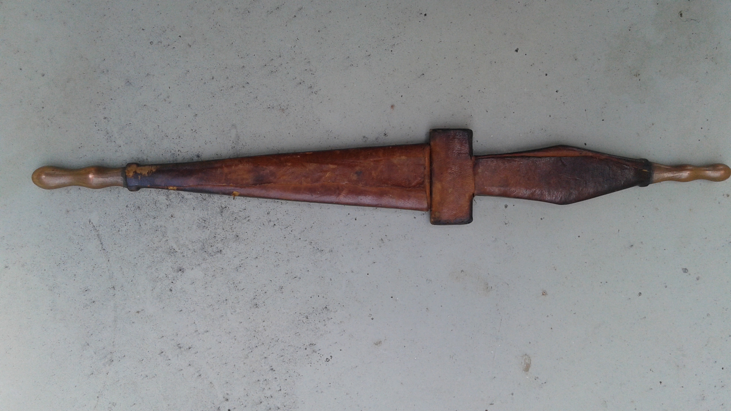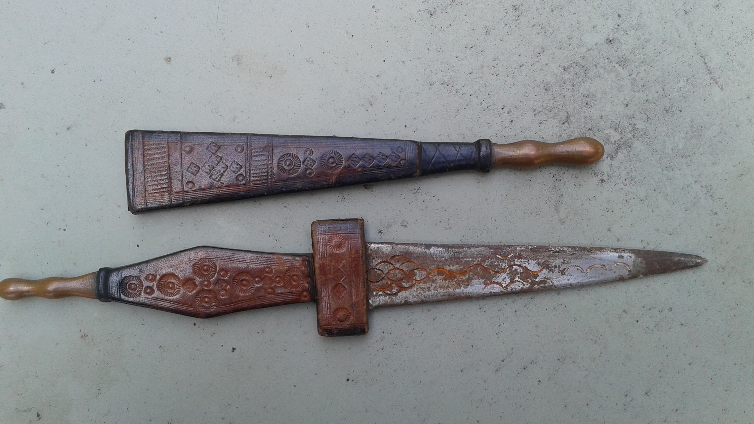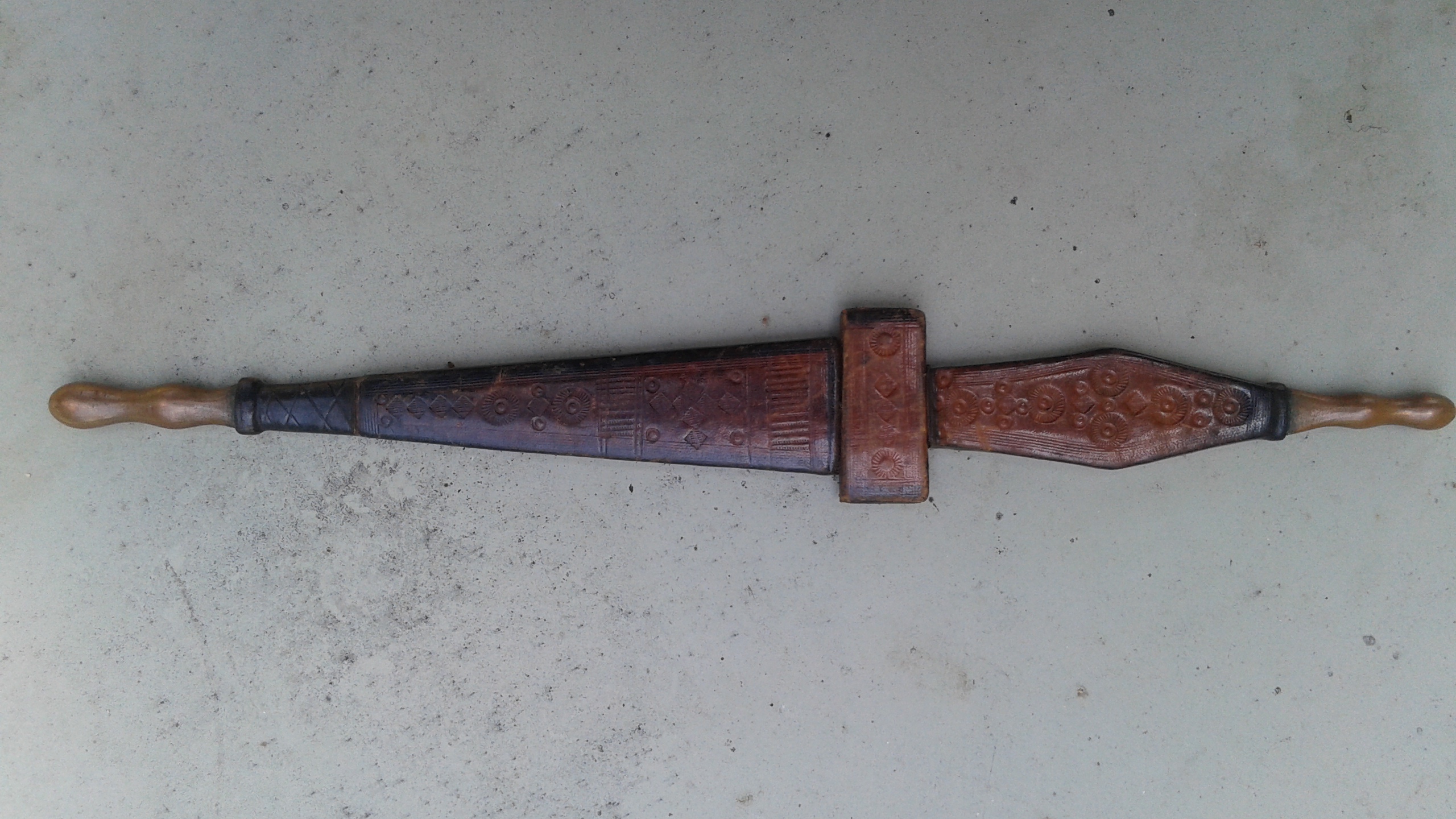 Description I have a old knife that was given to me from my dad when i was 5 years old i am now 40 yrs old and something tells me its worth alot of money.It has some type of old symbols ingrited in the blade and the handle and case is old leather with brass or copper tips.Take a look at the pics and give me your input please.