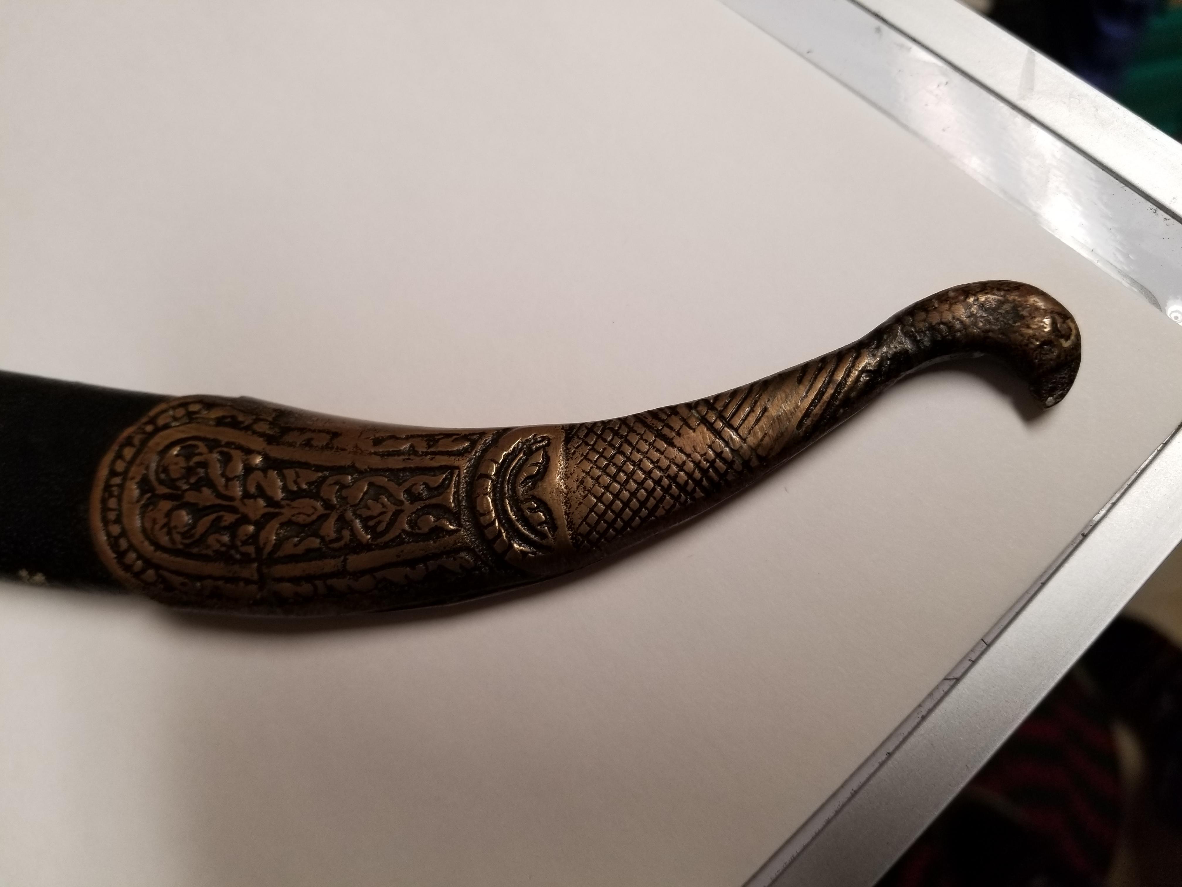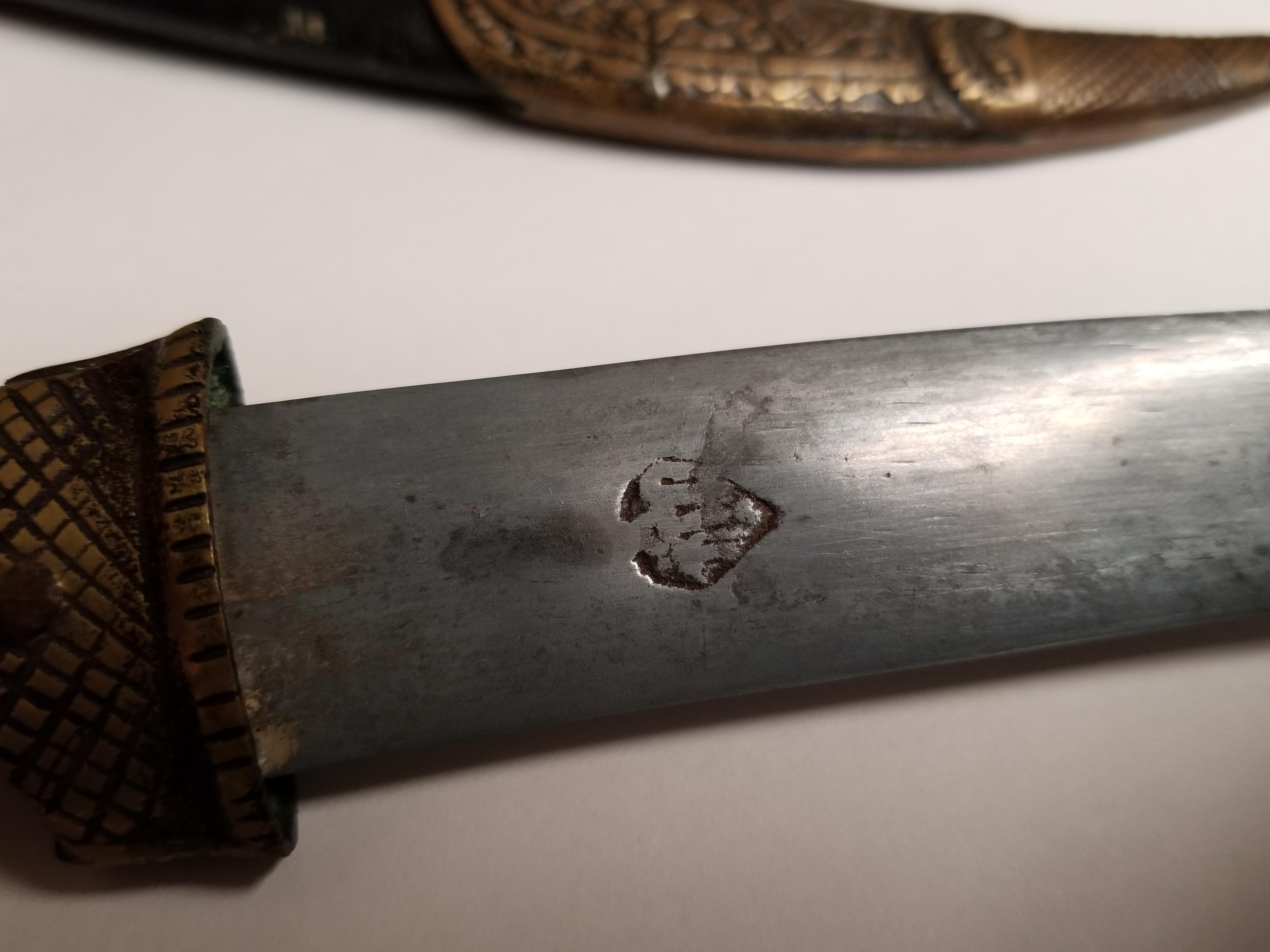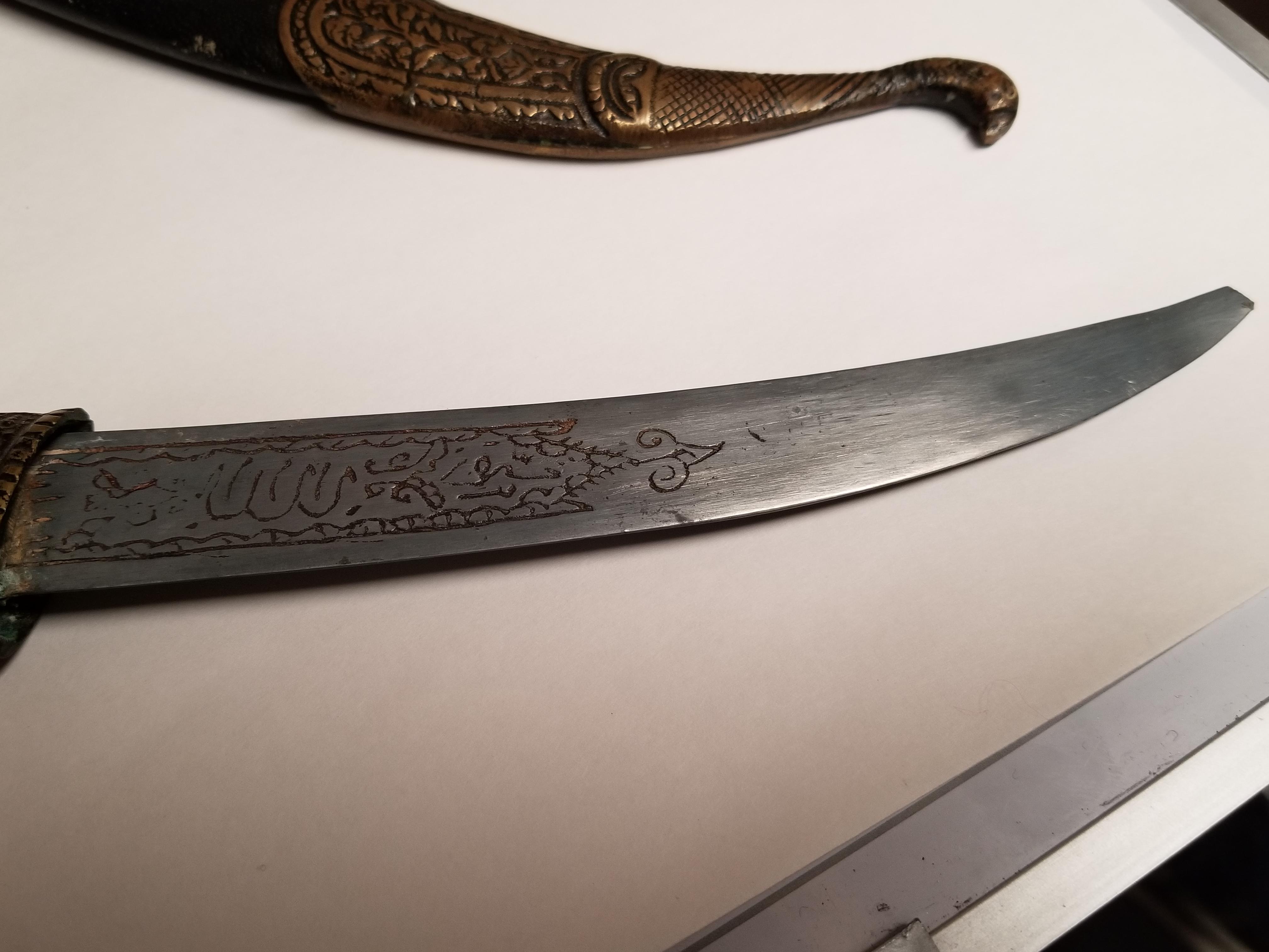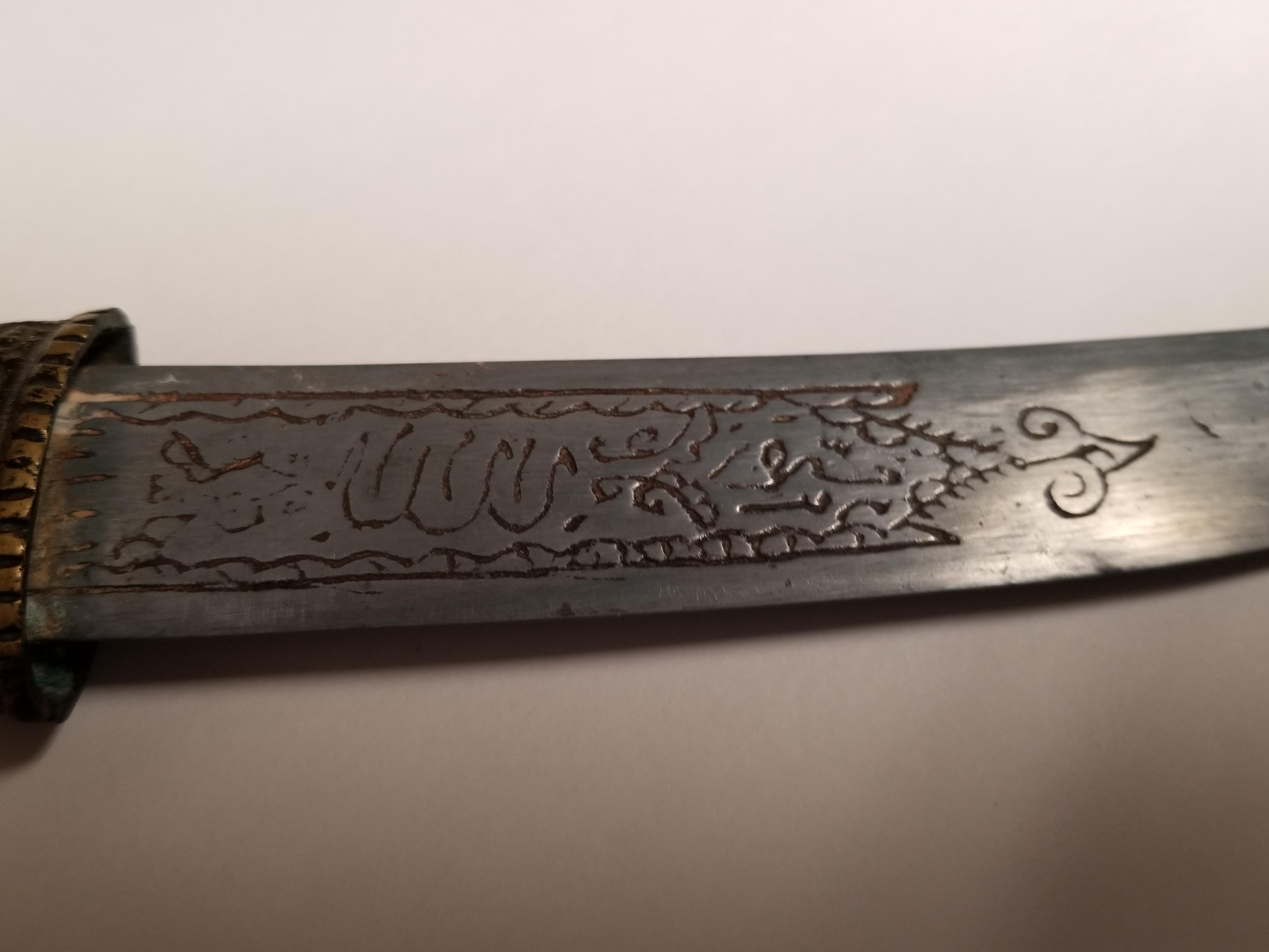 Numerous etchings in brass on sheath and hilt as well as on blade