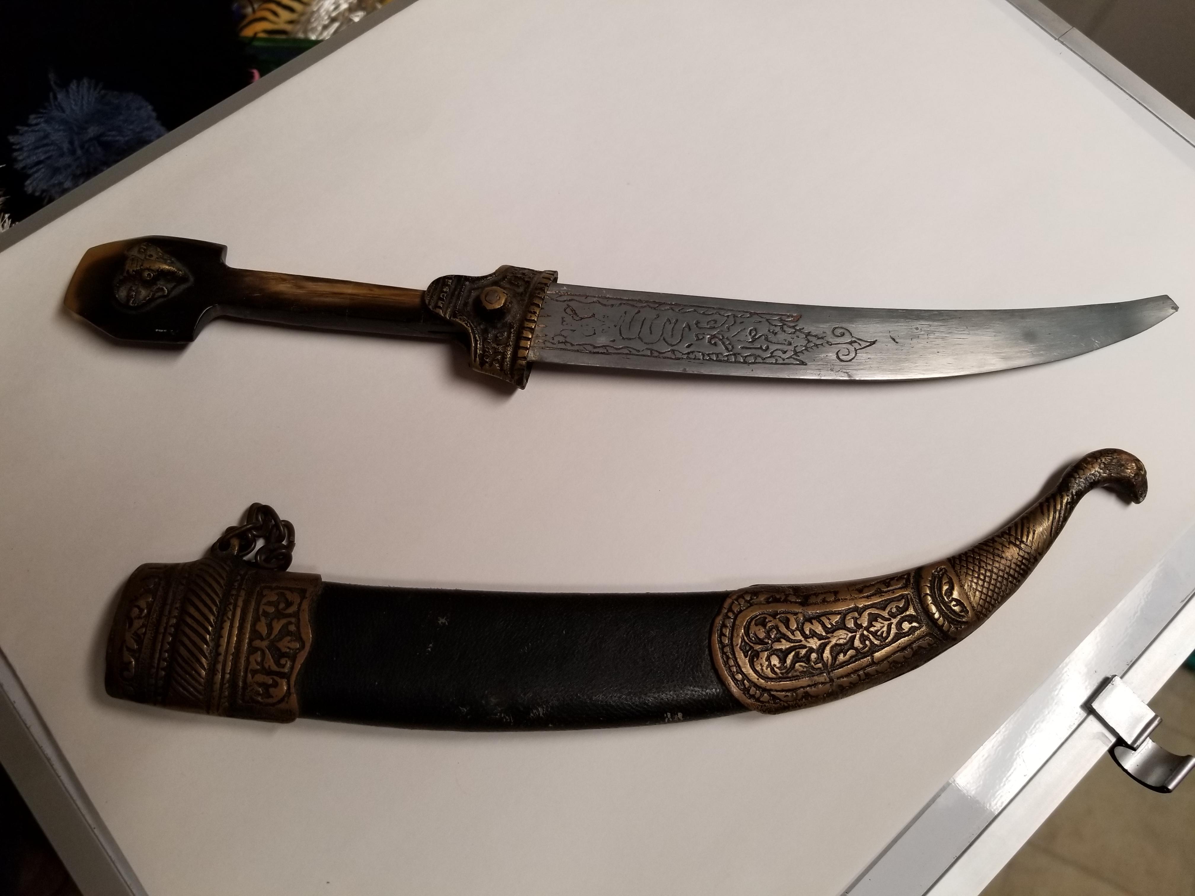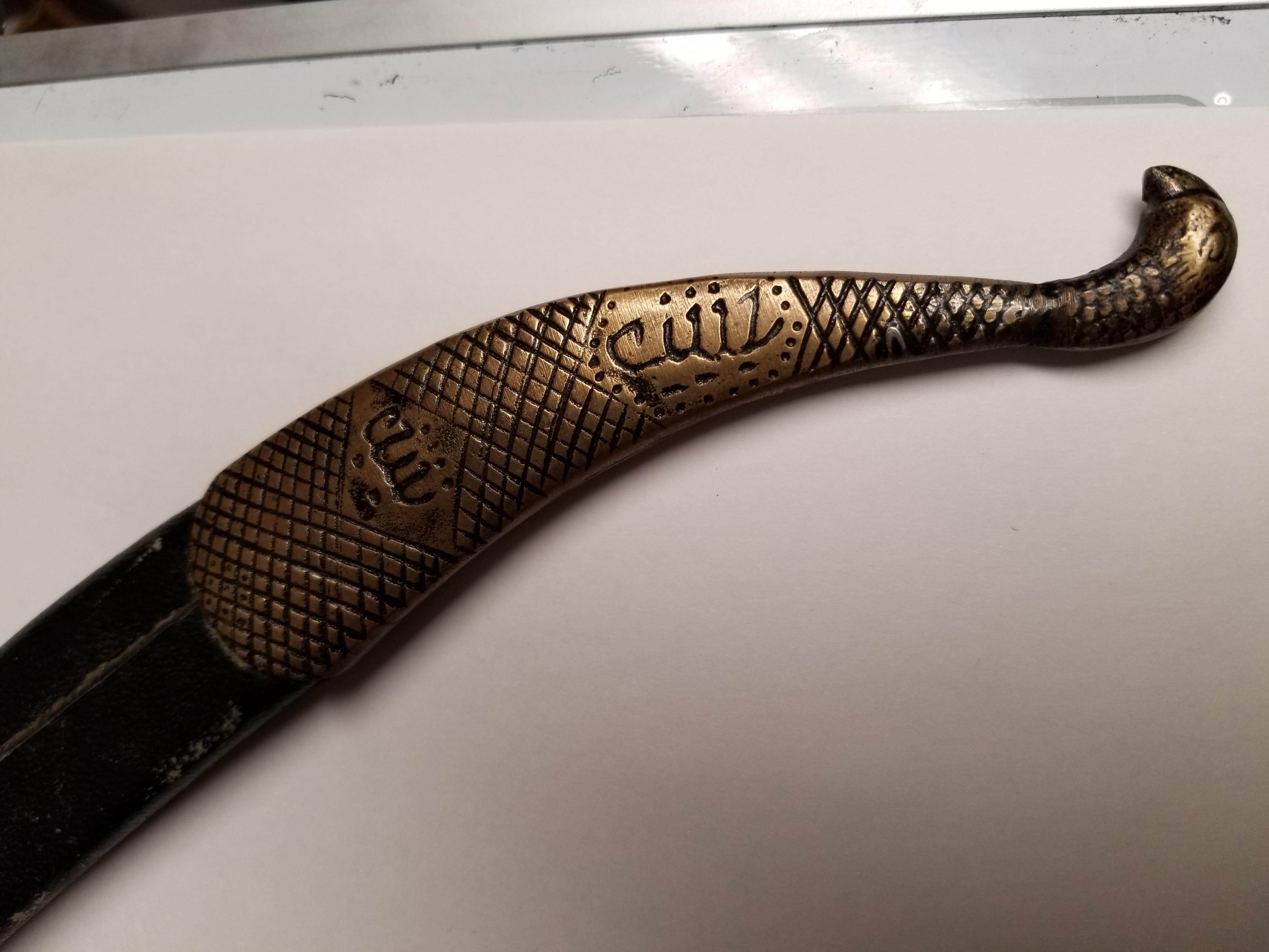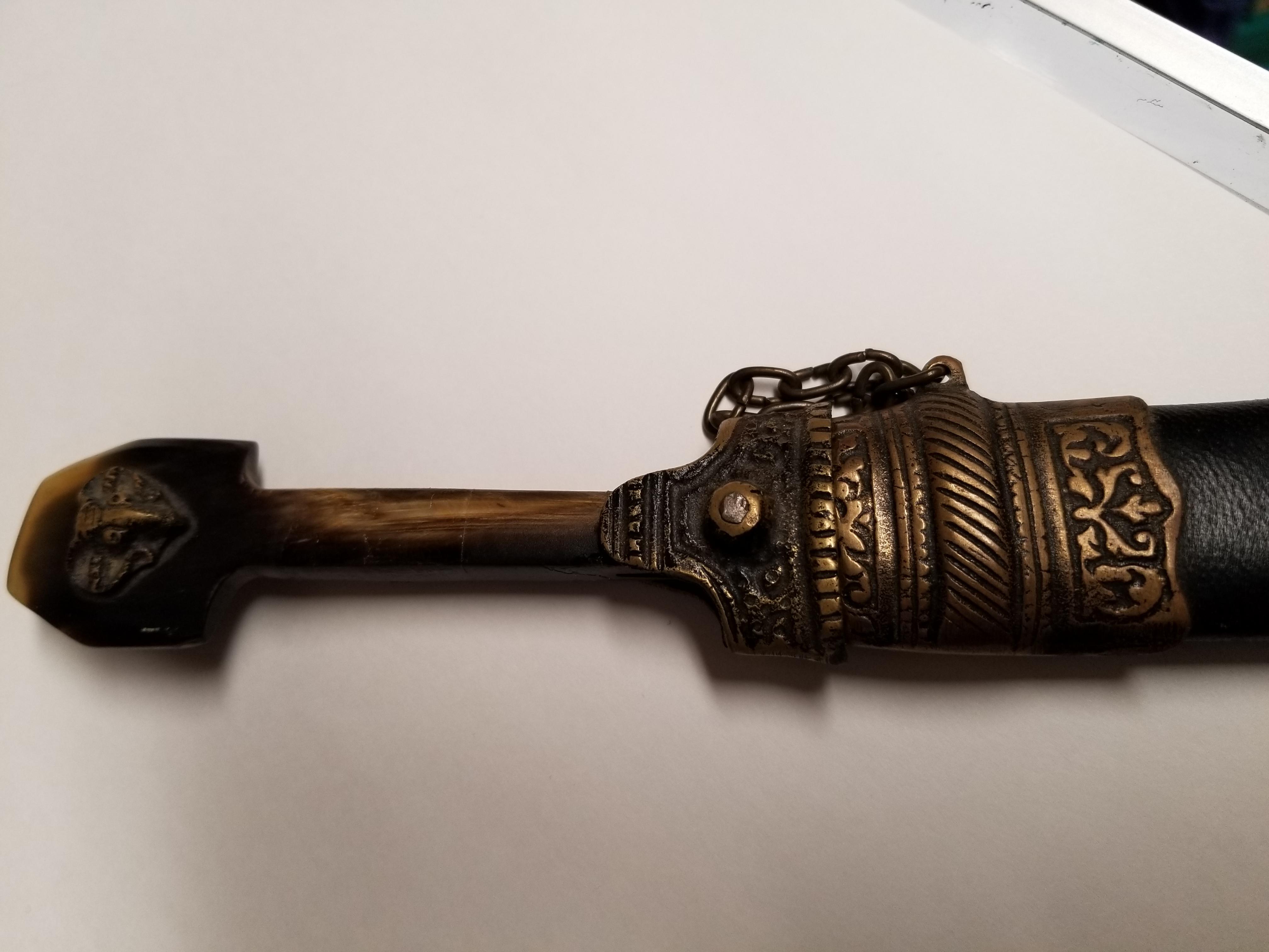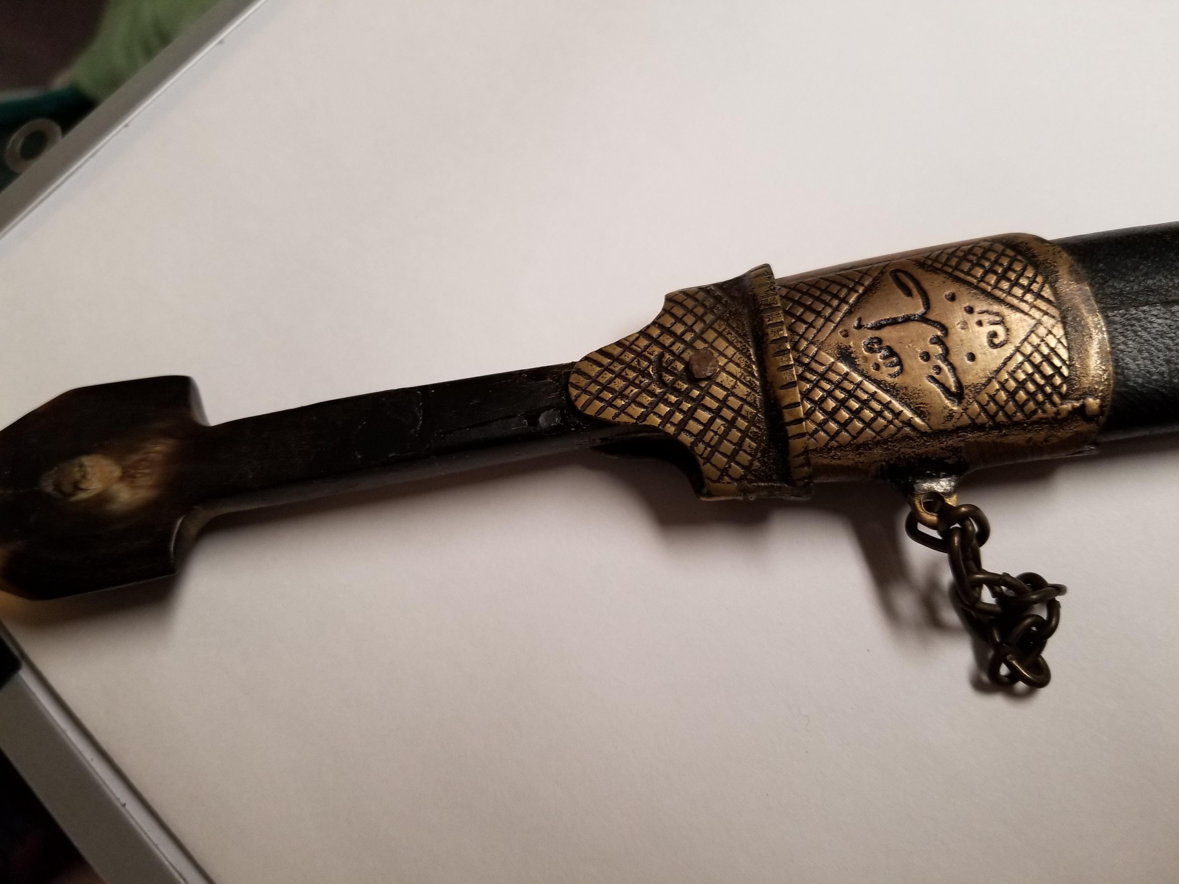 Numerous etchings in brass on sheath and hilt as well as on blade