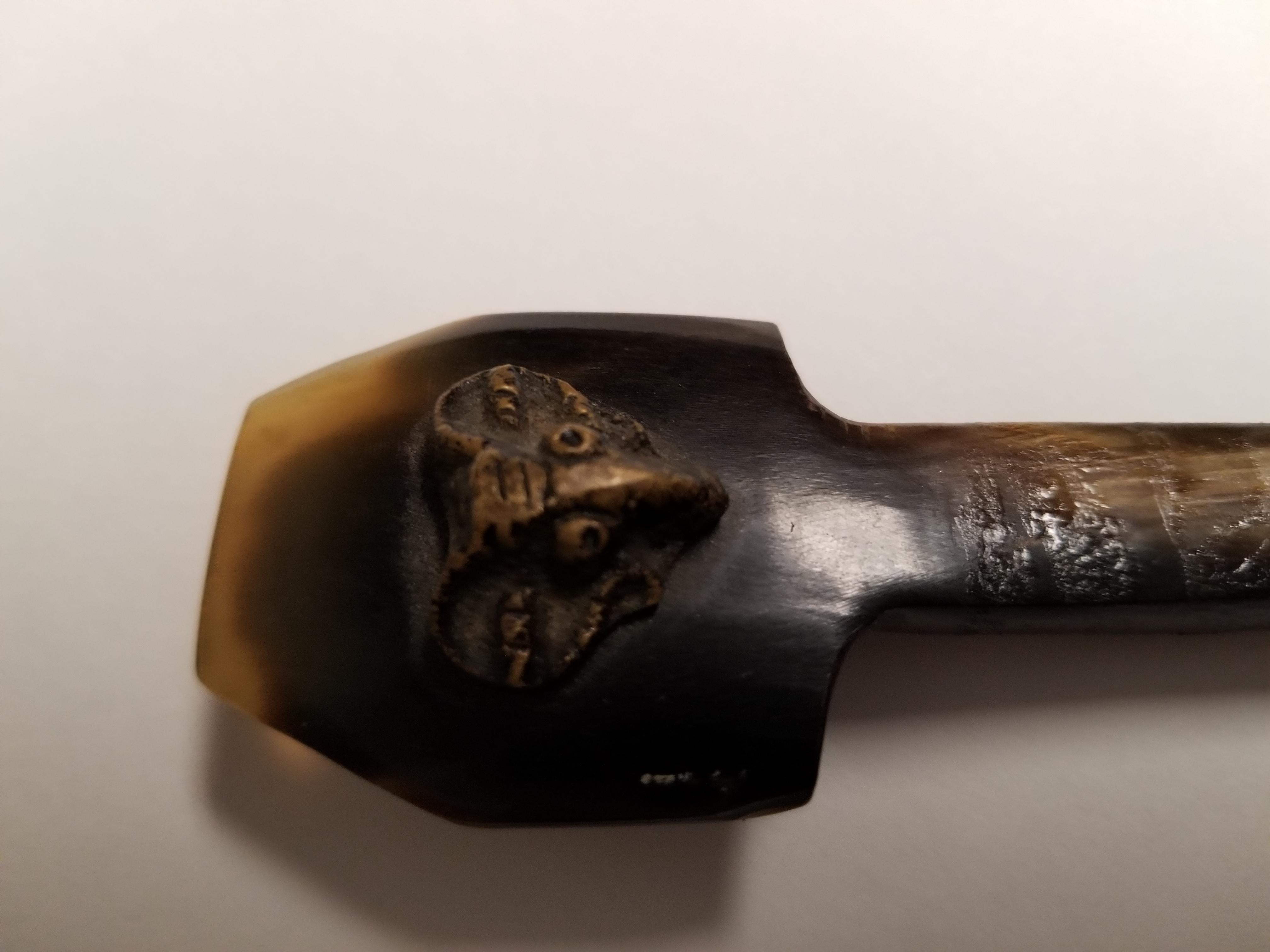 Handle has brass ram detail