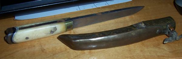 I am looking for any info on this knife. It has no marking that I know of except the pretty design on the sheath. It also has some dots on the handle. Eight dots around one dot. It is a really cool knife and I would be really interested in any info about it. I do not even know what it is for. The person who gave it to me thought it was for whaling or maybe fishing. I has either a bone or an ivory handle. The inside of the sheath has some kind of wood lining it. The sheath has a curve to it. I am not looking to sell just to find out about it. I wouldn't mind knowing what it is worth though. Thank for any info you can offer.