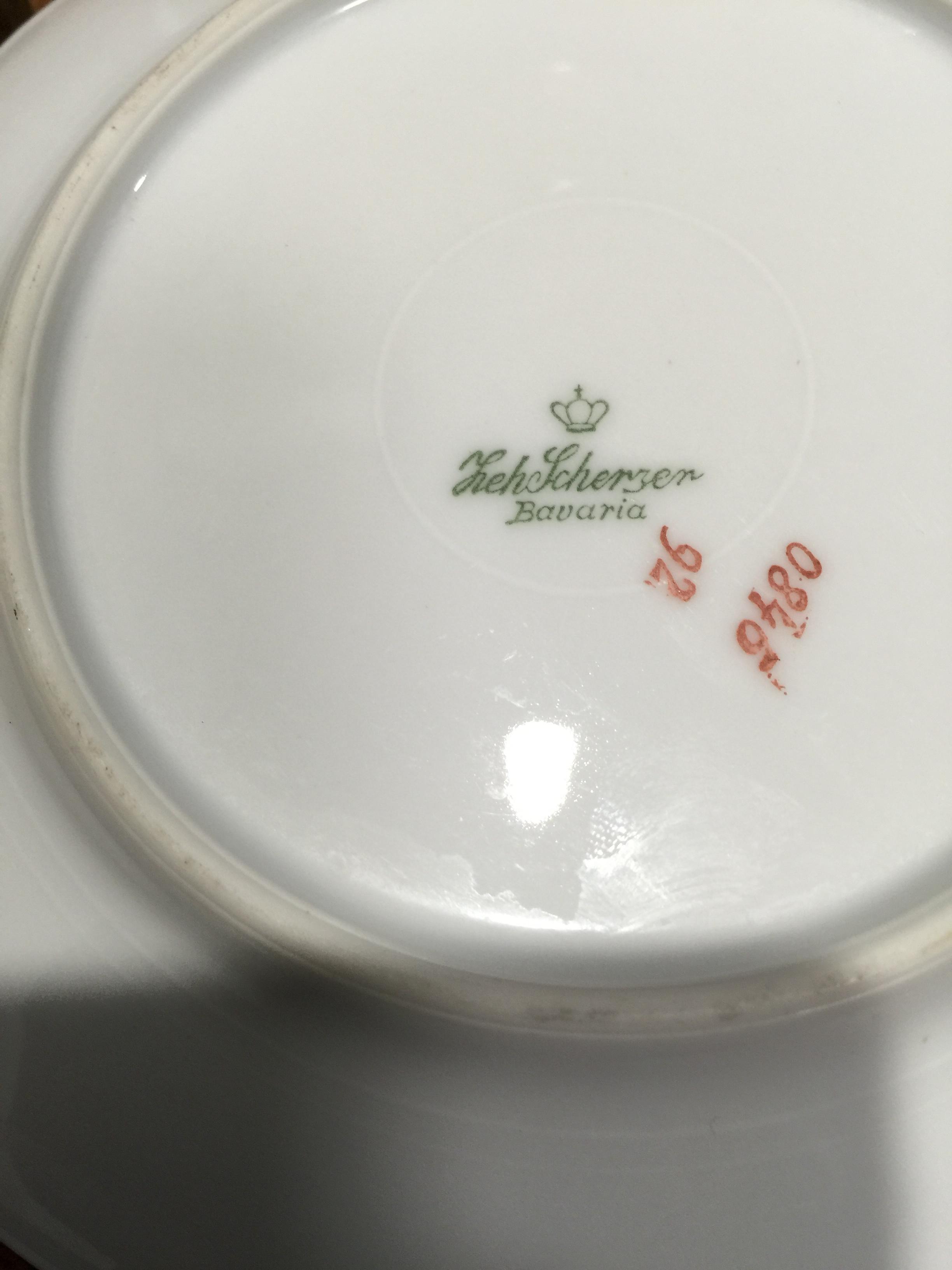 Hi from Australia!! (and Happy New Year) The 3 piece setting is smaller than a 'regular' size cup and saucer. It has gold trim but the most interesting feature is that it has a Kookaburra sitting on a flowering gum tree branch. I am having difficulty reading underneath each piece. It has a crown then underneath it says HEHSCHERZER OR LehScherzer, Bavaria. The spelling has a florish & I am having trouble reading it correctly. Each piece also has numbers, all different. Cup 0846 31. the saucer is 0845 9?, and plate 0845 92 these are hand drawn in gold and black. I hope someone can enlighten me. Thanks!