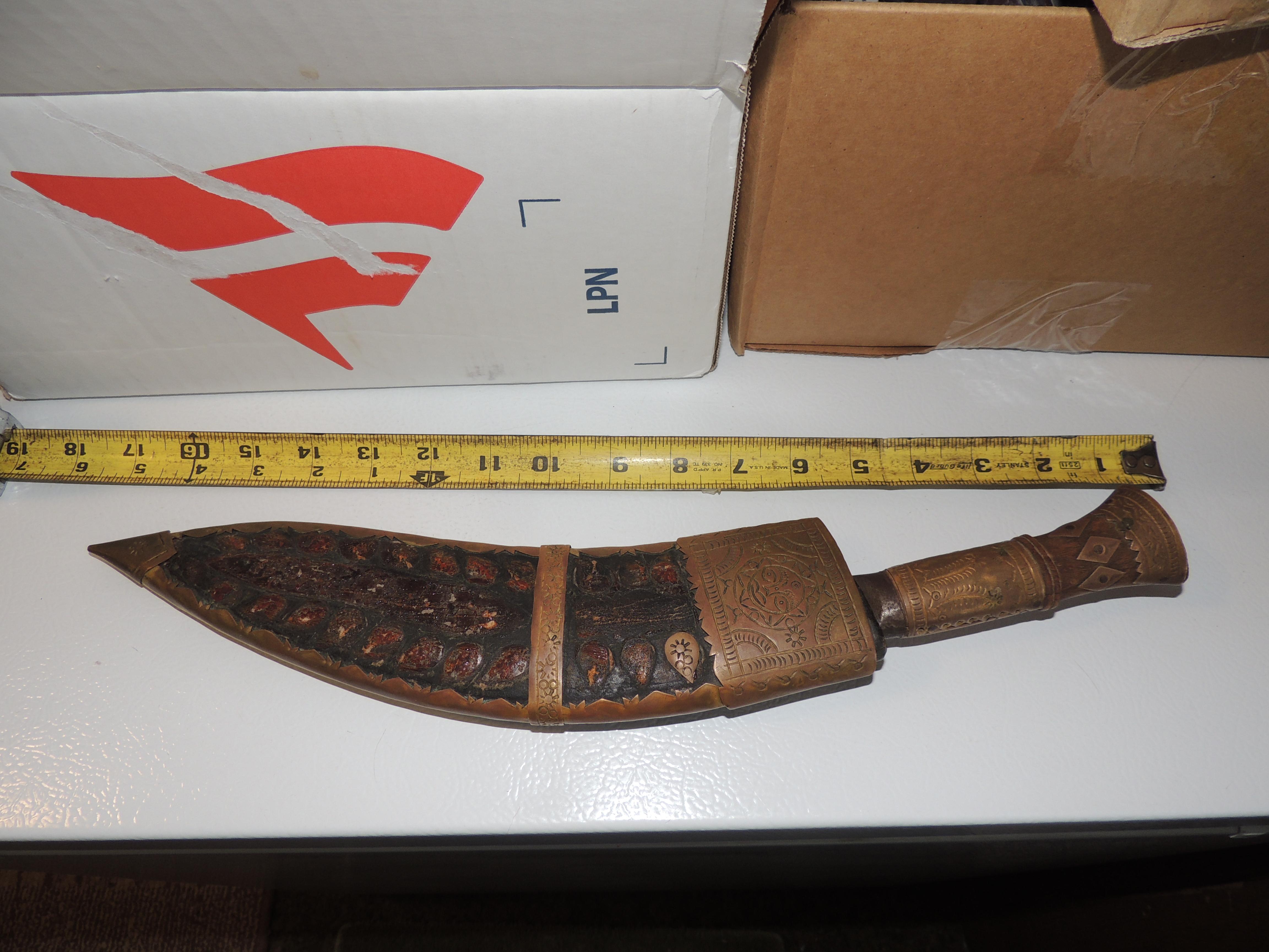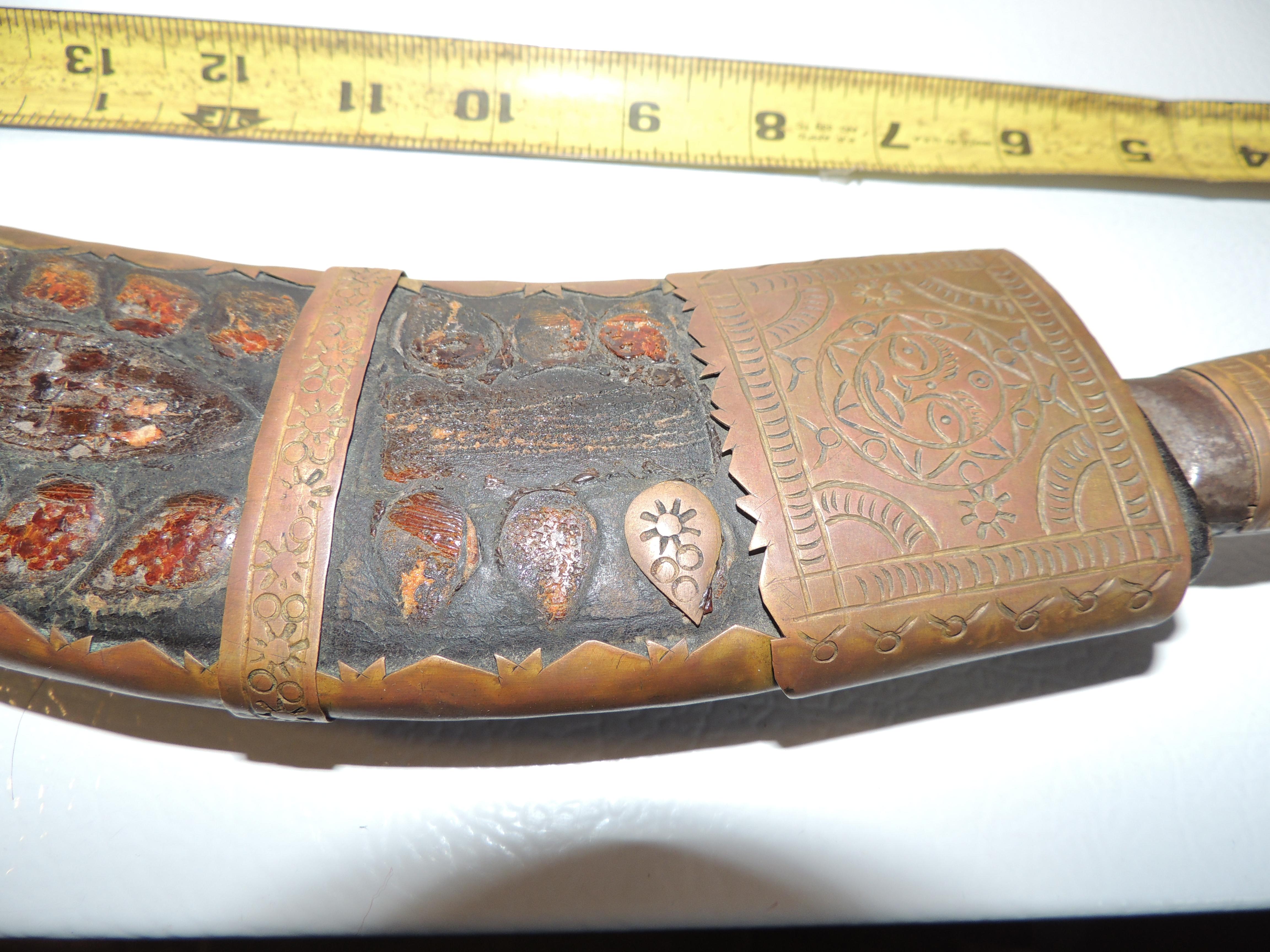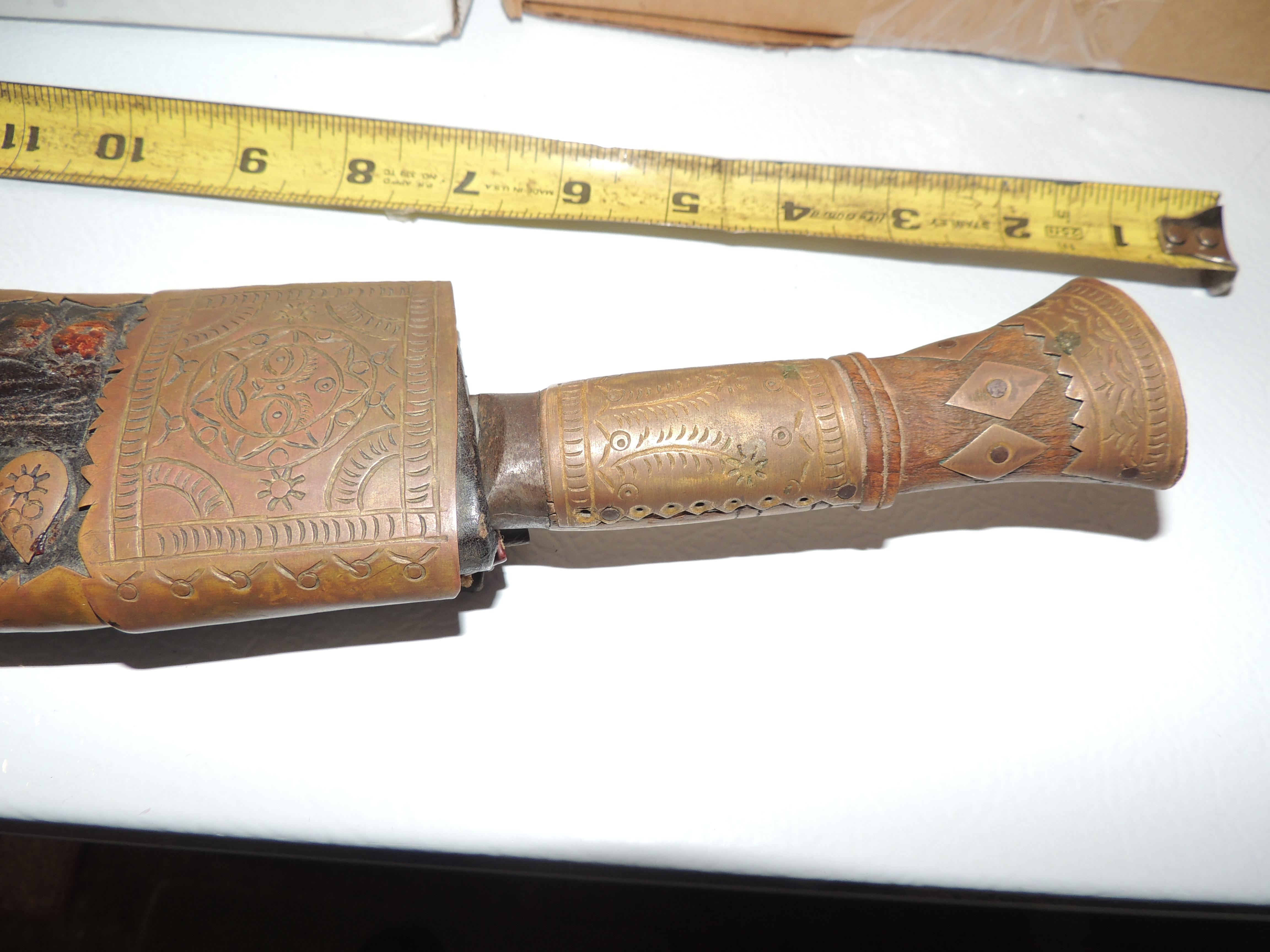 Has a leather wrapped wooden sheath with metal plating. Wood handle with metal plates. One of the smaller blades is missing.