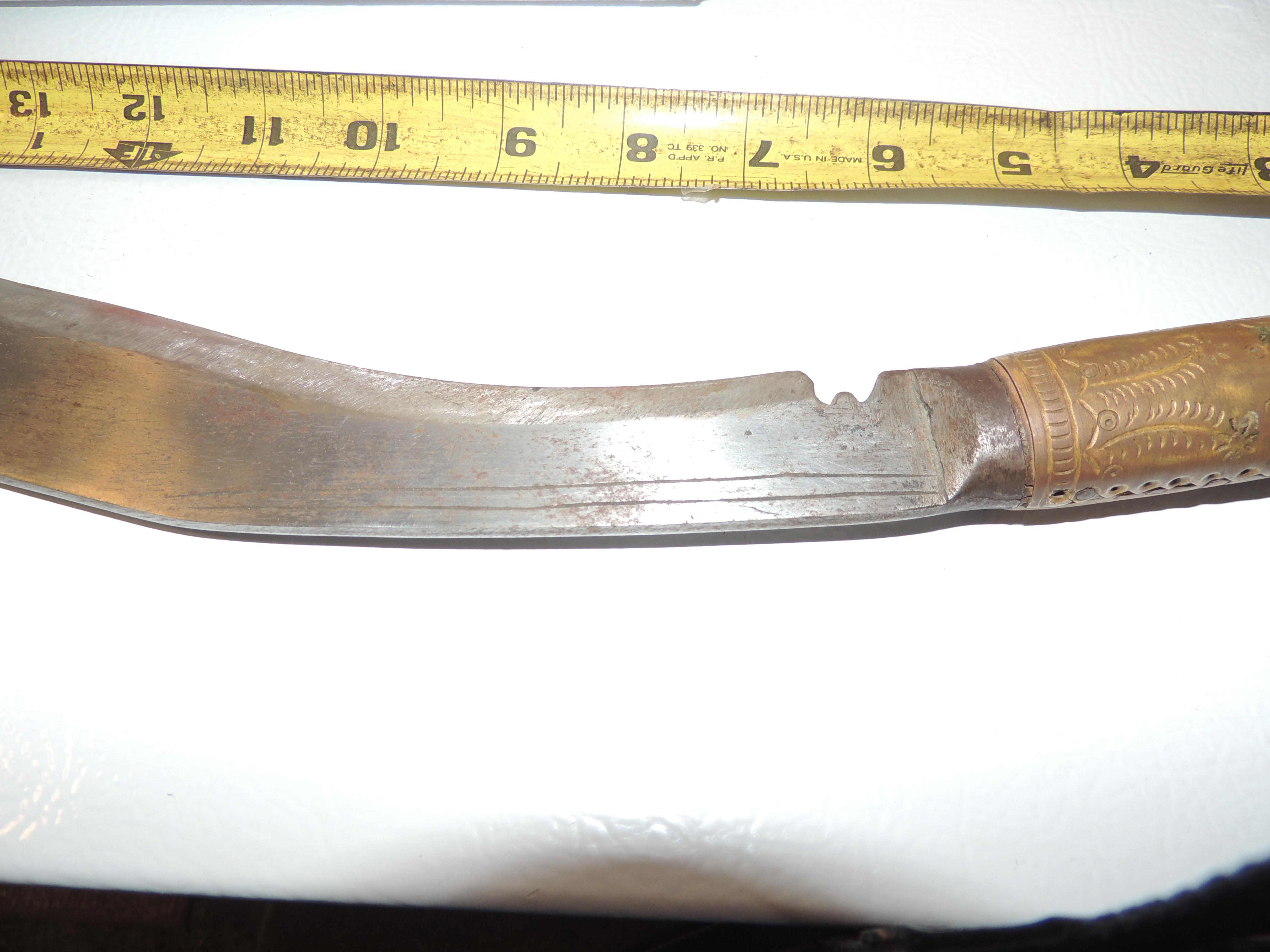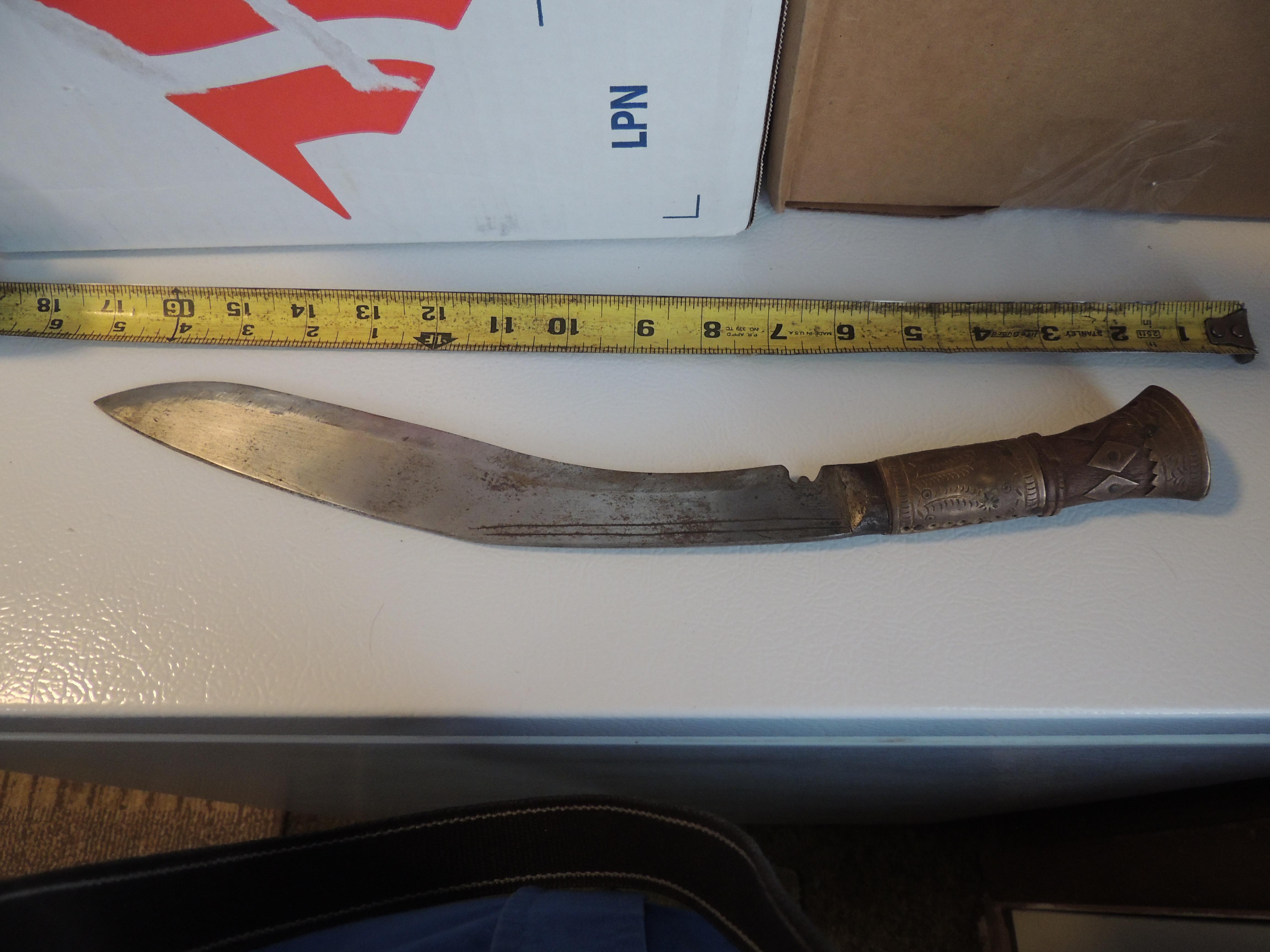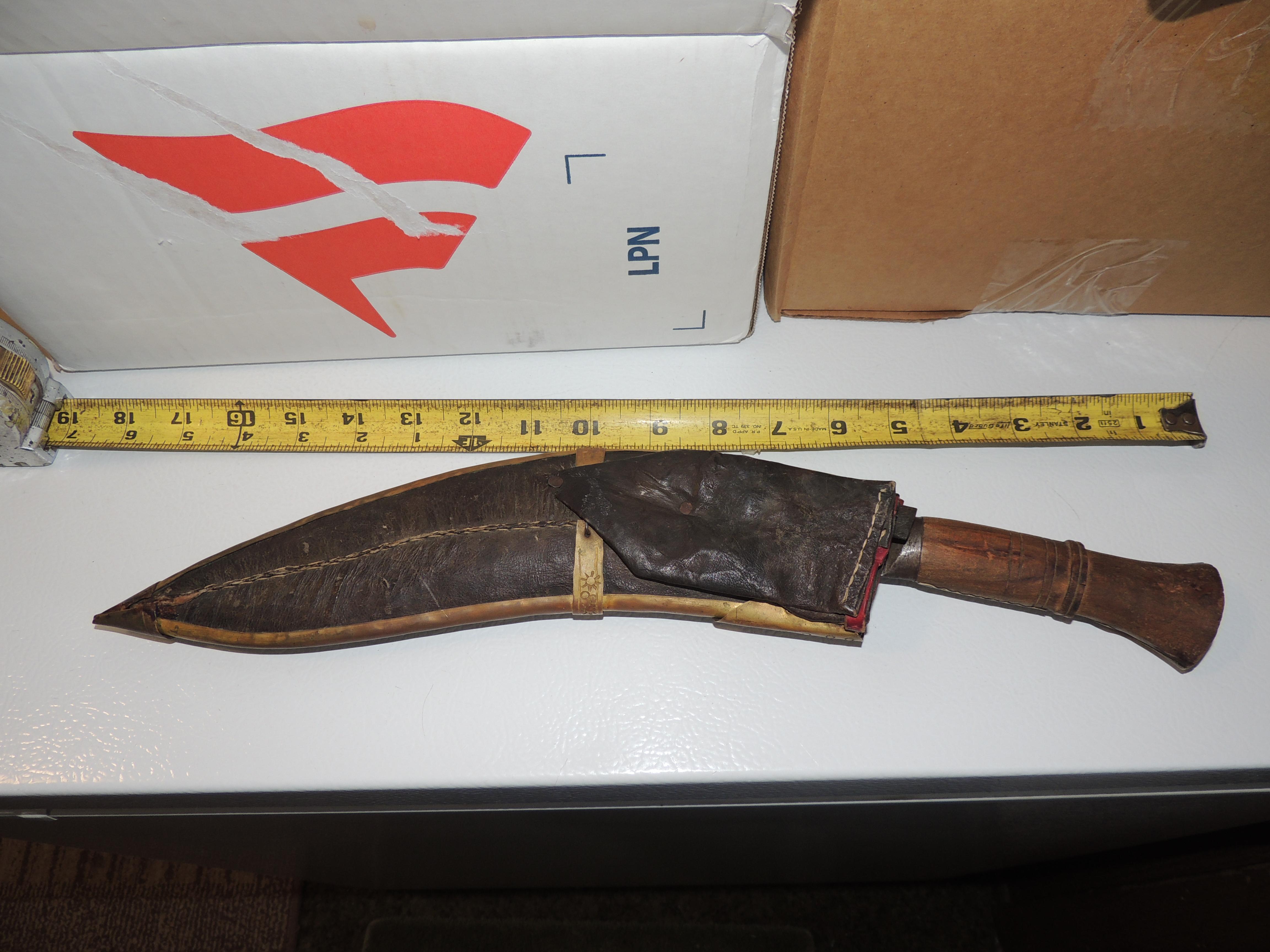 Has a leather wrapped wooden sheath with metal plating. Wood handle with metal plates. One of the smaller blades is missing.