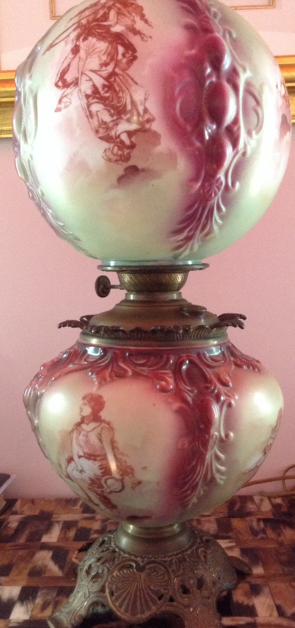 The color ranges from deep magenta to creamy pale pink and the images are of angels...4 on each globe. The top globe is removable and now holds 2 lightbulbs. There is a metal base as well as metal between the globes where the tank and valve still remain.