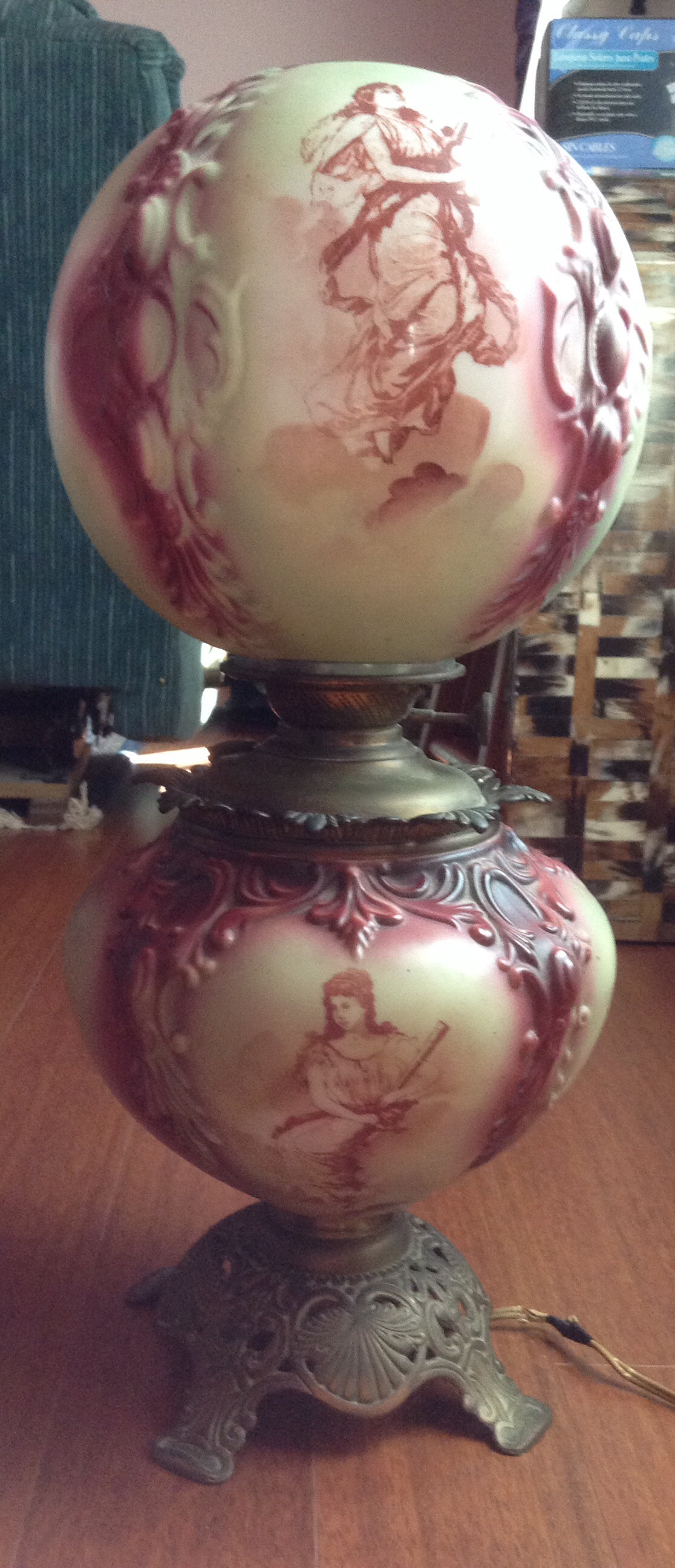 This lamp was my great grandmothers and we are guessing it may be from the late 1800s. It was converted to electric by my grandmother about the time of her marriage approx 1940.
