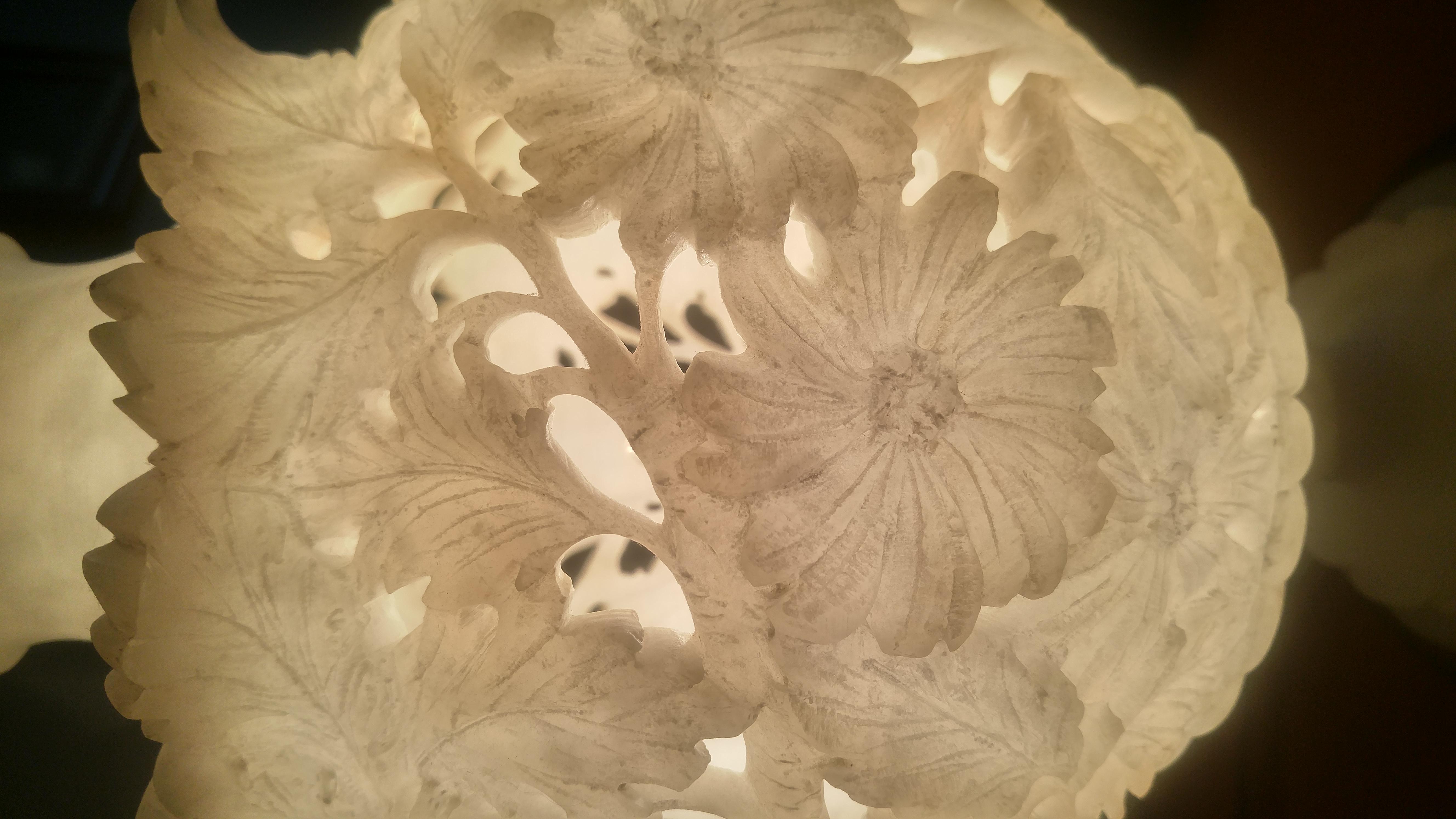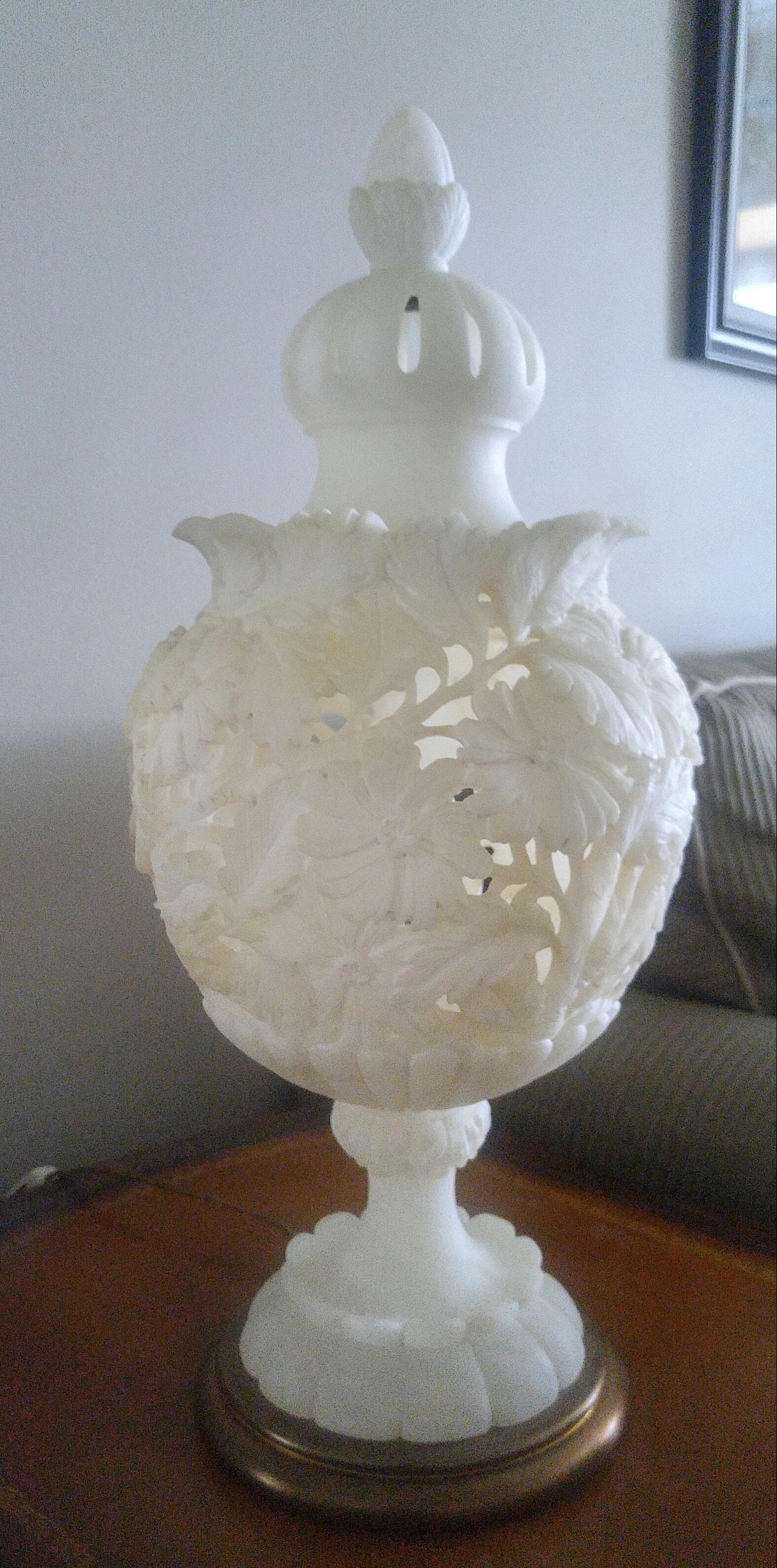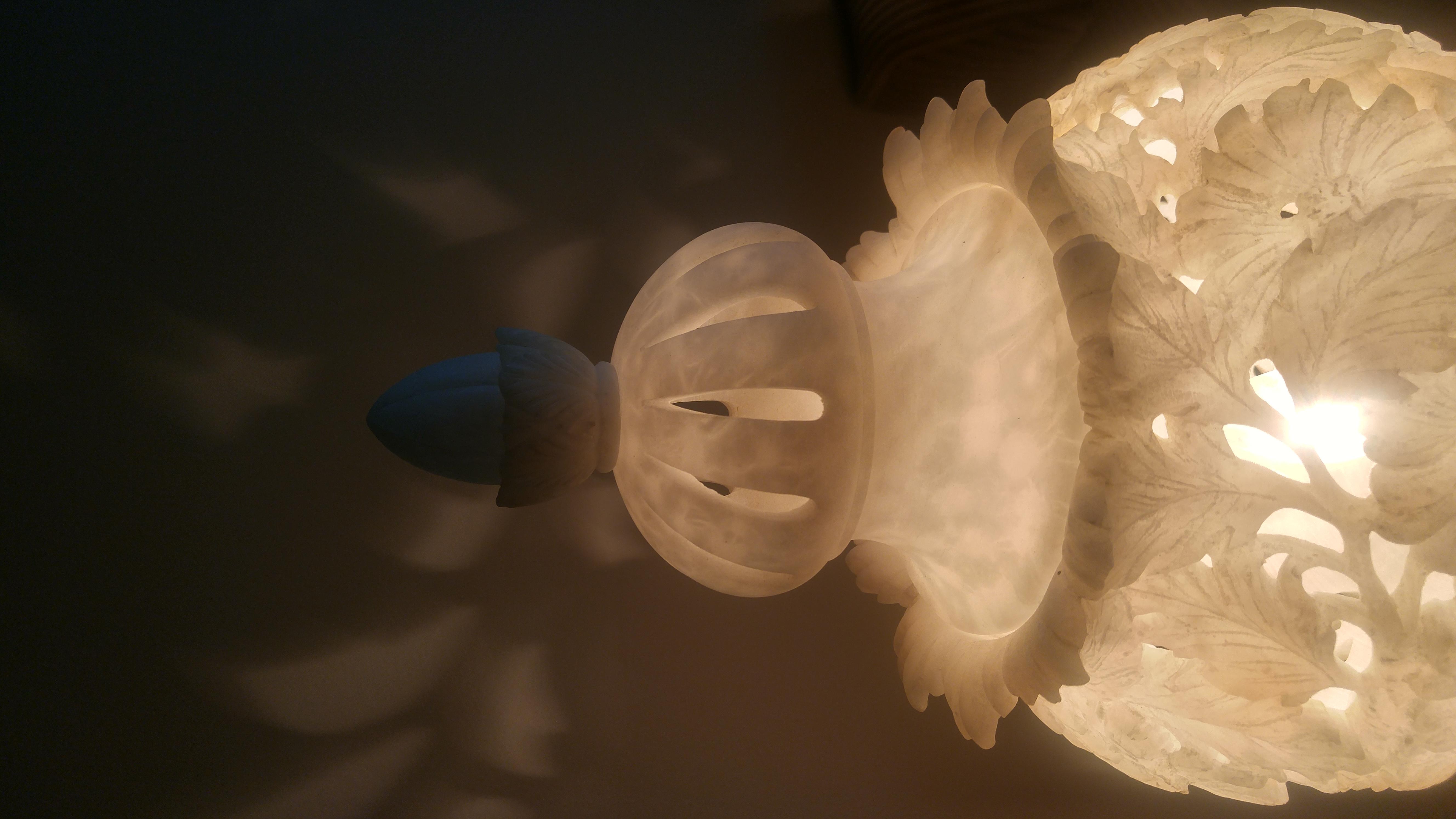 Based on the images this does appear to be an Alabaster lamp. Most of these are Italian and date from the first quarter of the 20th century. Some do carrying markings to indicate the maker, generally carved into the piece itself. The Levitron marking is just that of the company that made the electrical fittings, their lightbuld sockets can be found on a great many lamps dating from this period.This one is nicer than most, at auction it would go in the $300.00- $500.00 range.