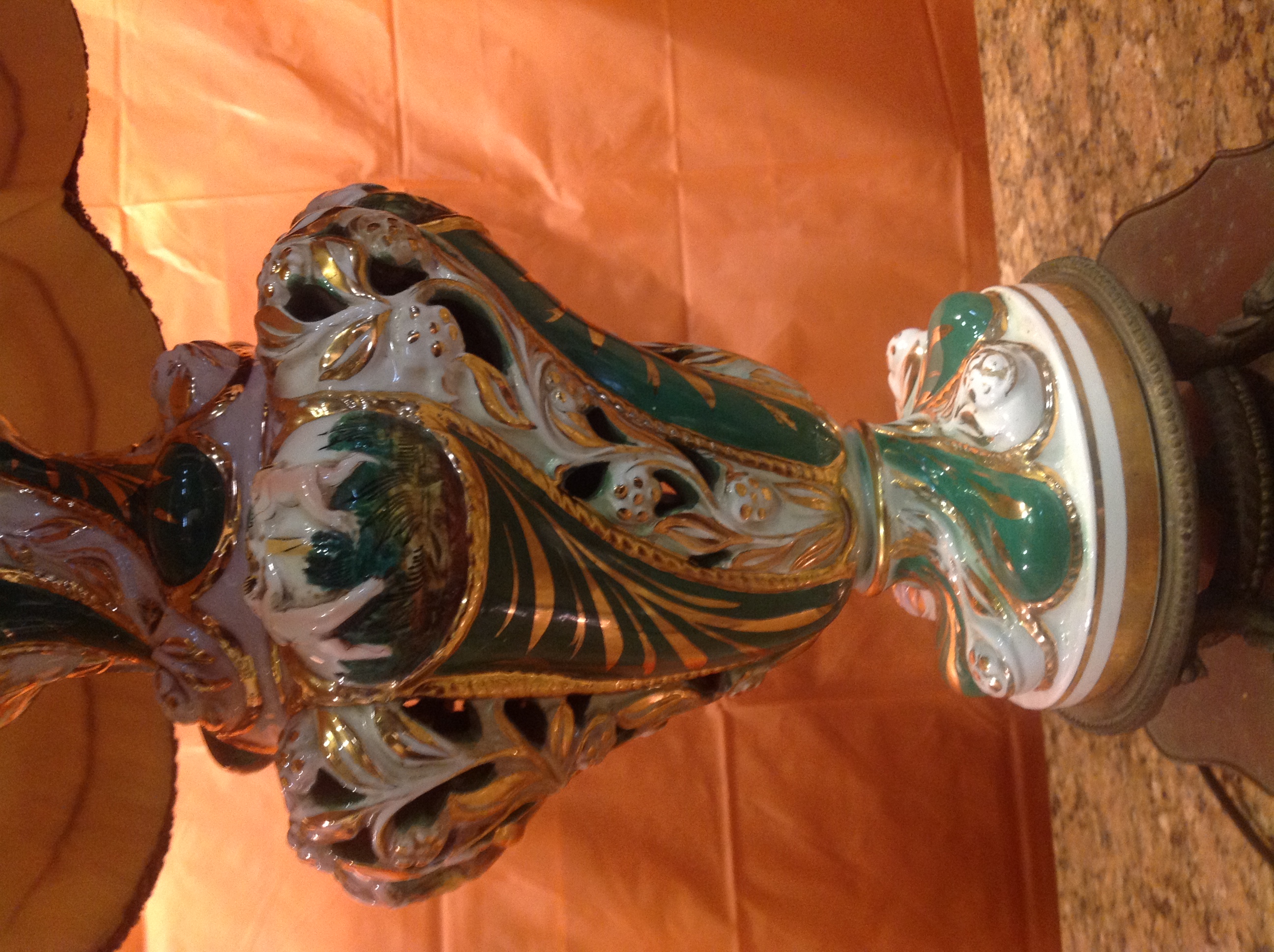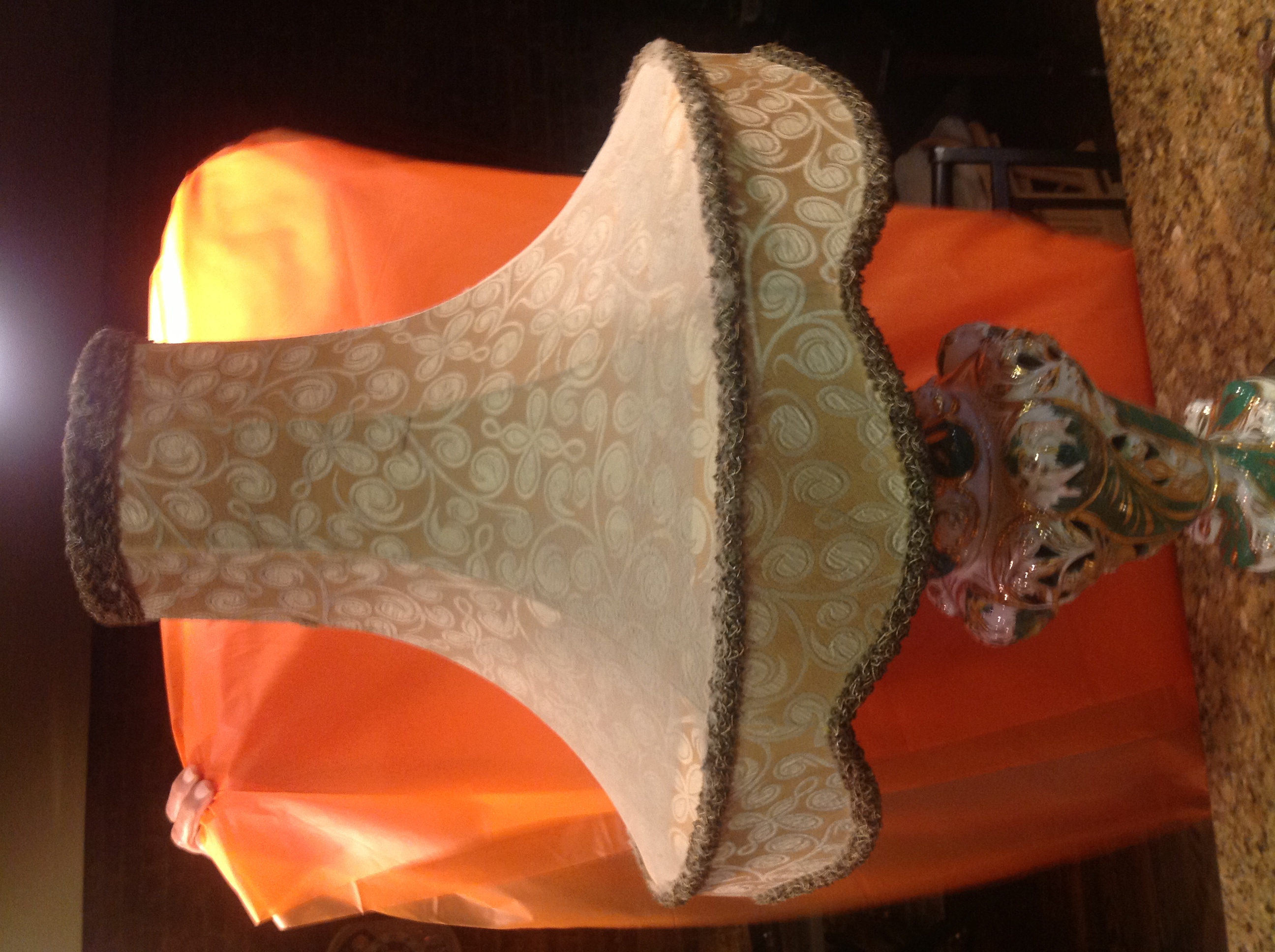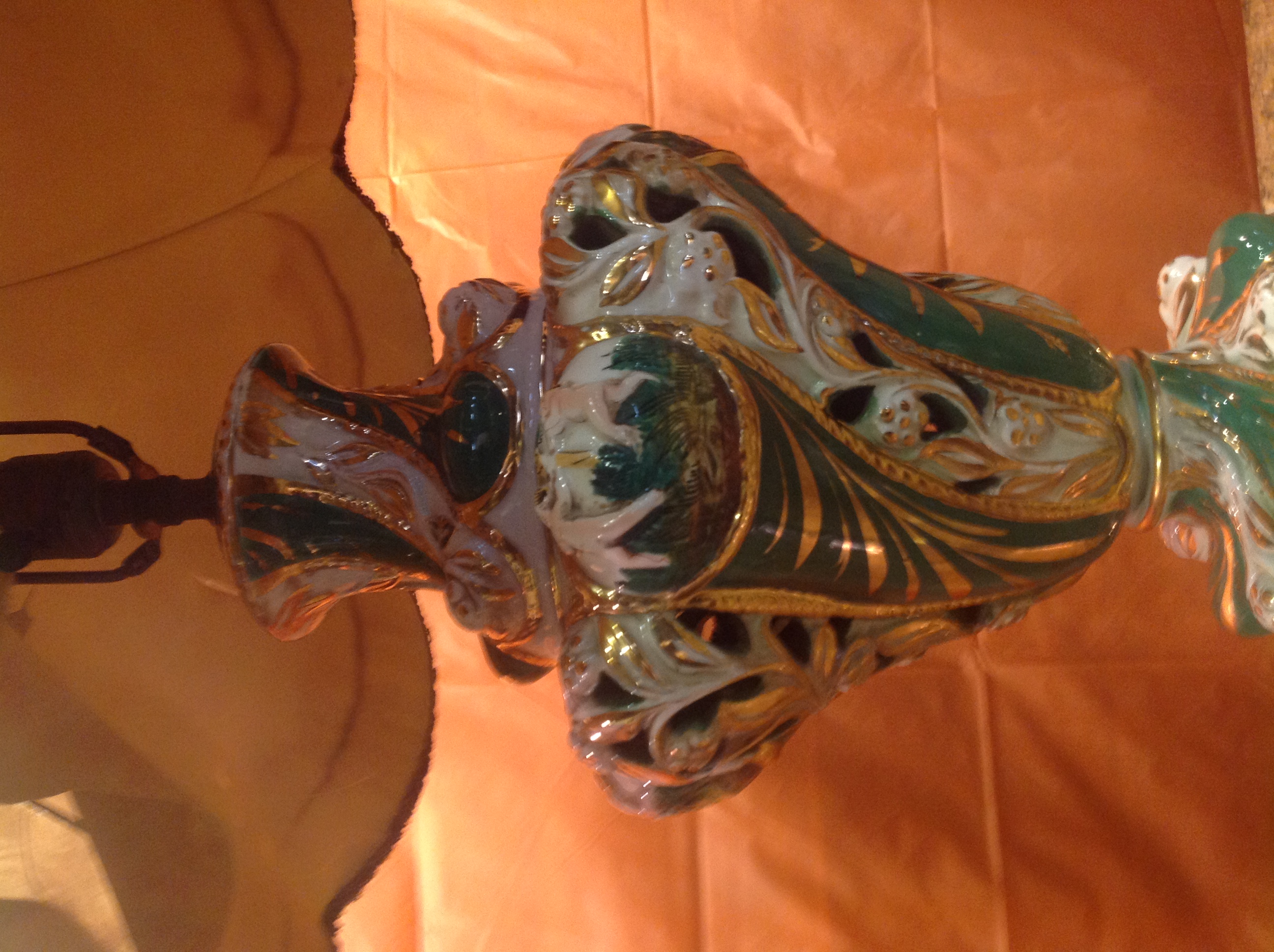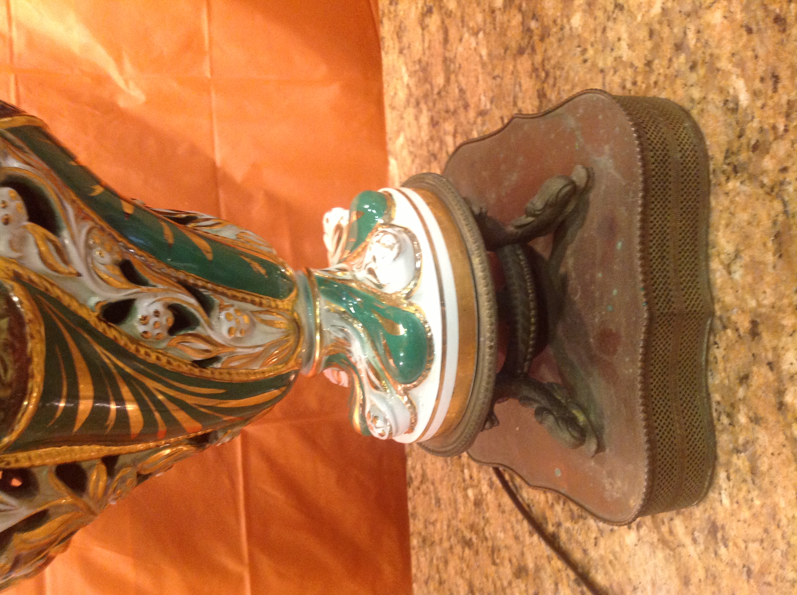 This lamp was my aunts. She had it for as long as I can remember and she passed in 2006. She was 94. It's in very good shape , , the Base is brass, the body is porcelin hand painted in gold trim, shade is in good shape outside with a small tear. The skirt on the inside of the shade is torn a little but still OK...