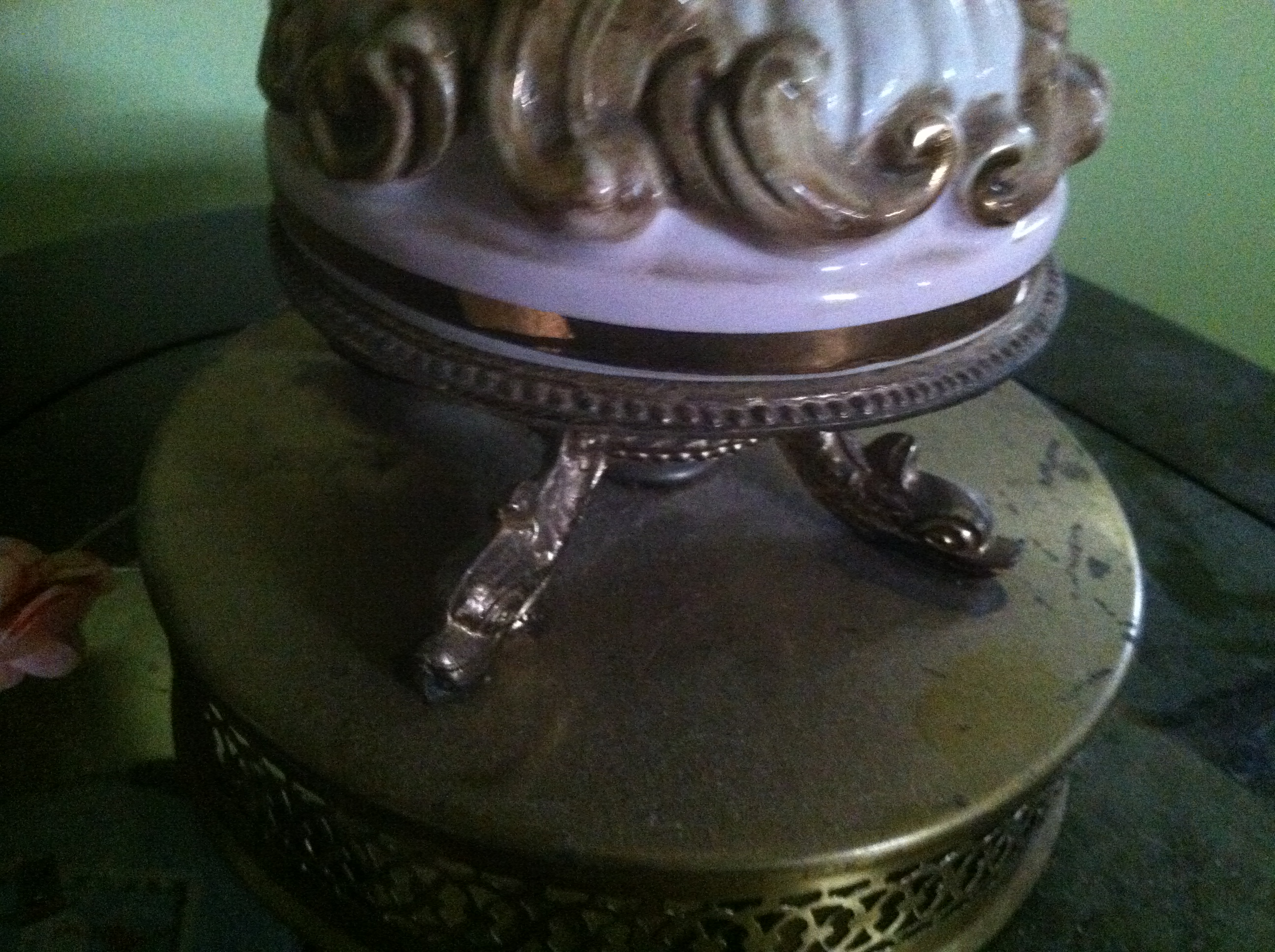 These lamps were passed down from a great grandmother 4 generations. They are porcelain, with brass base, the feet look like brass dragons but could be dolphins, they are 30" tall from table to top of shade and the largest area is 27" in diameter. Color is soft rose and gold. I want to know the approximate age of the lamps and their value or where I can find the value of them.