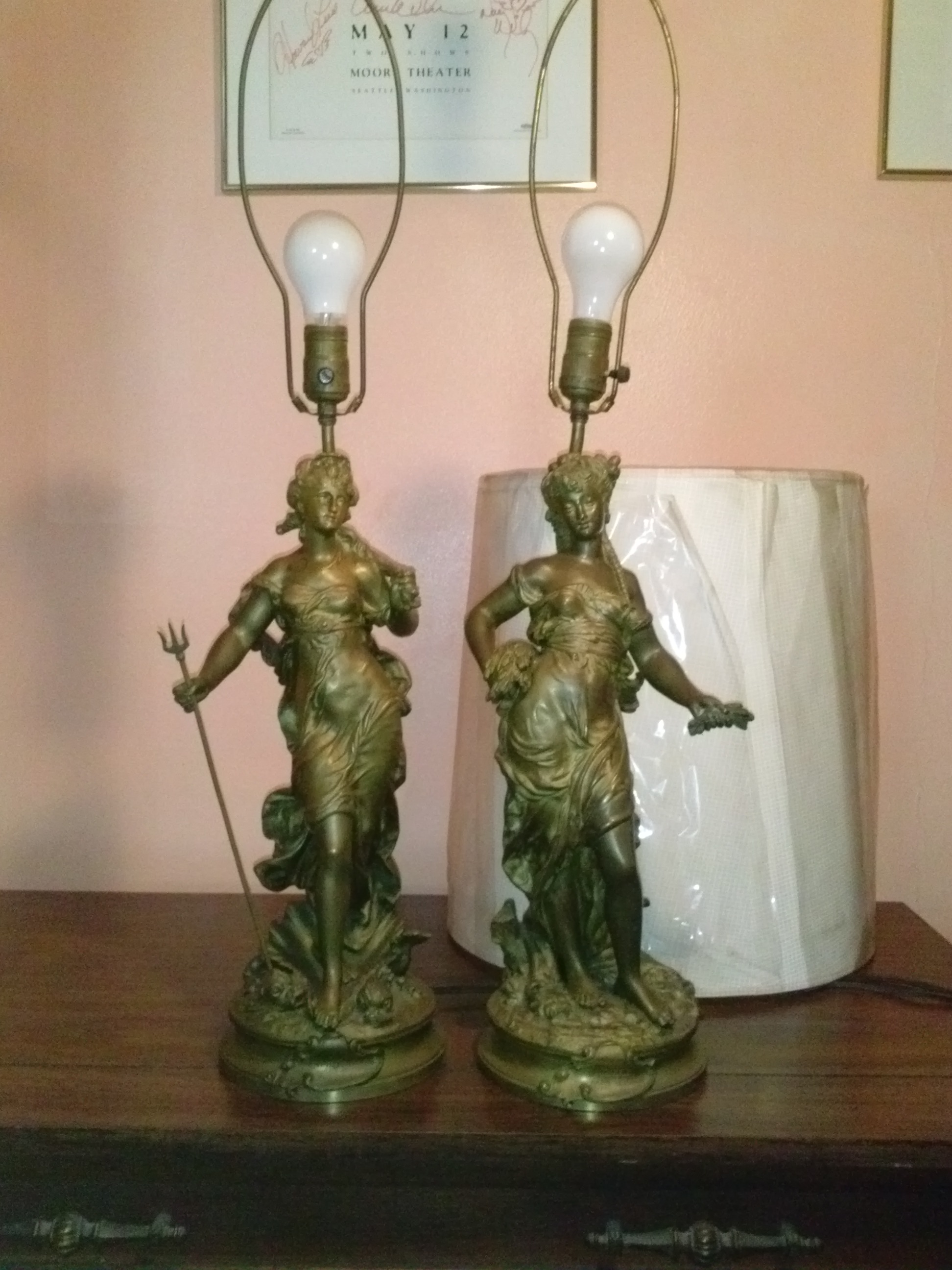 Antique lamps with the name Aug Moreau "Amphitrite" on them. They are in working condition and also have the original lamp shades.