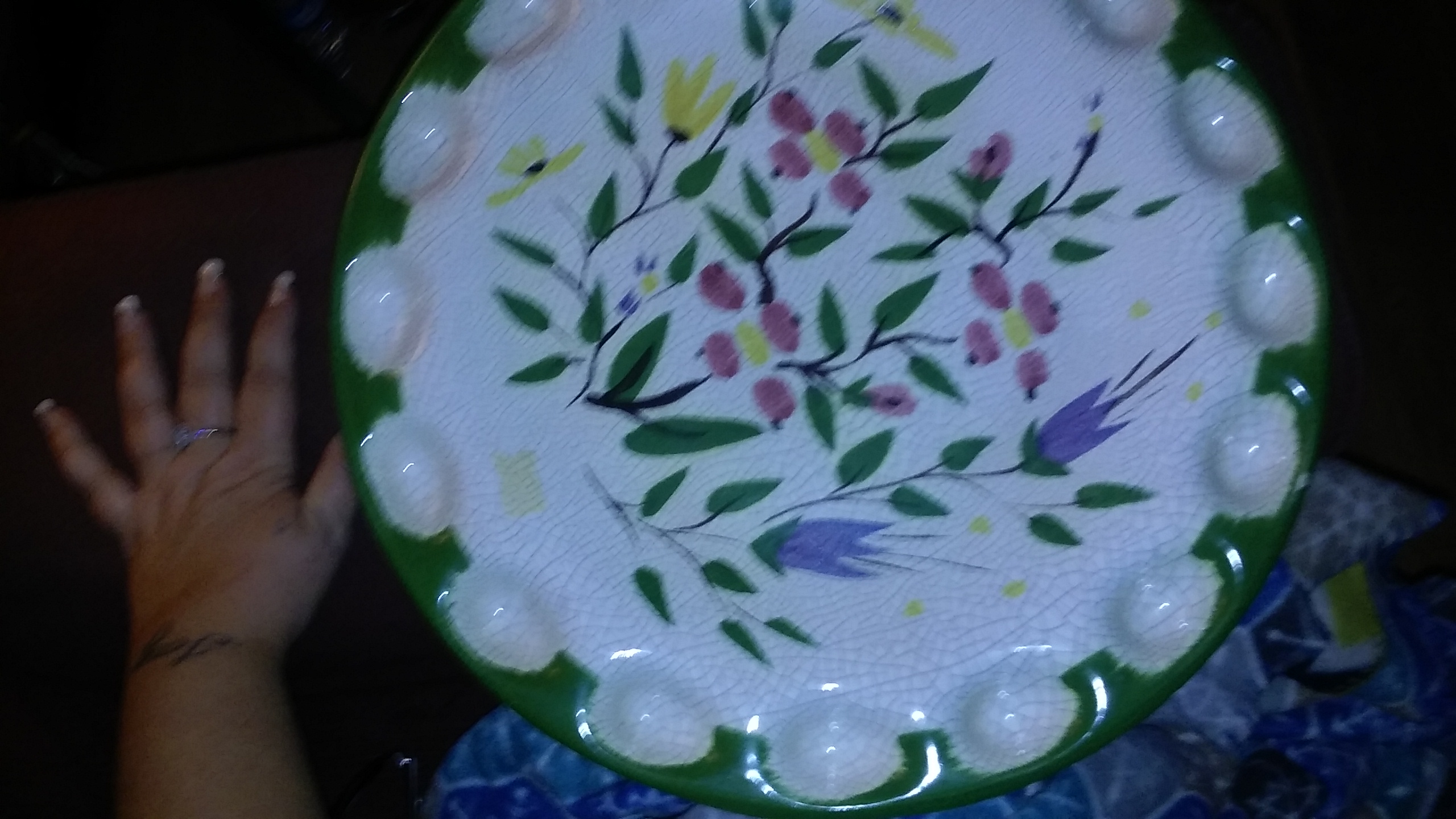 California Majolica hand painted by Hartman Studios, inc. Los Angeles California is the writing on the sticker on the back of this crackle painted large dish .. With what looks to be egg shaped holders around the outer edge of this beautiful dish.. I got the dish in with alot of glassware and other plates in what seemed to be a huge box that weighed about 100 pounds.. From an ex boyfriends neighbor who had a yard sale and got rid of things that brought back memories of his deceased wife. He asked for 10$ but i gave him 40$ .. This was around November of 2014.. Not quite sure what it is used for..
